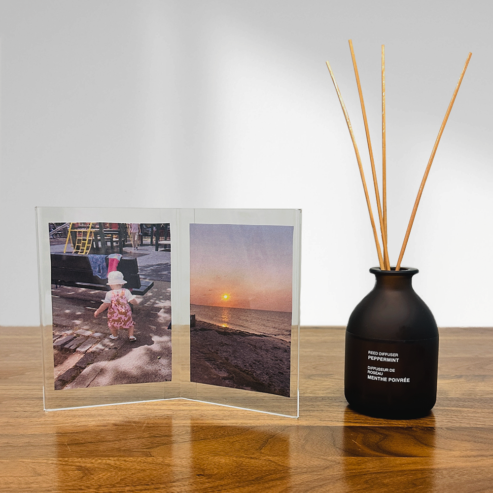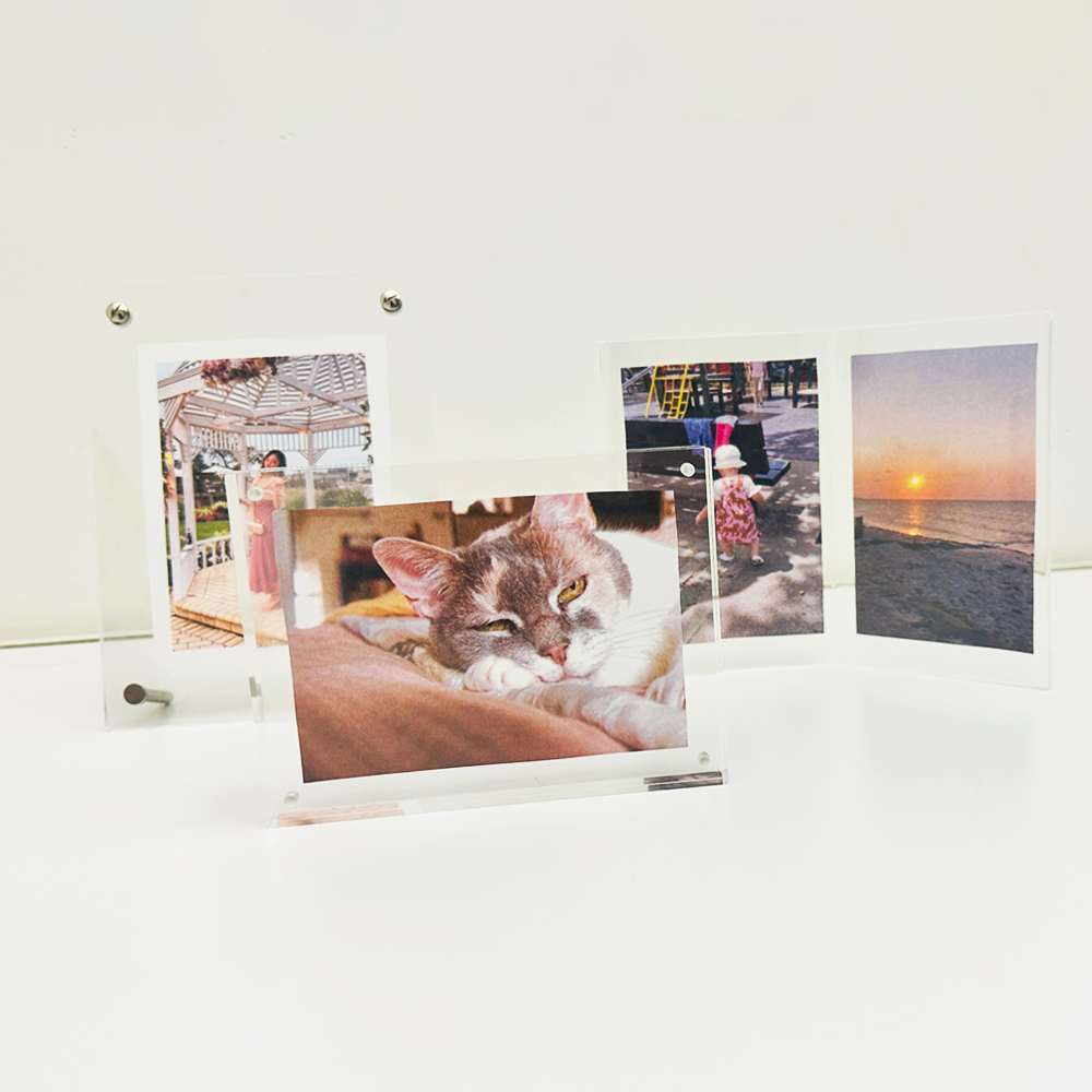 This acrylic photo frame has a simple structure. allowing it to be self standing and display photos on both sides.