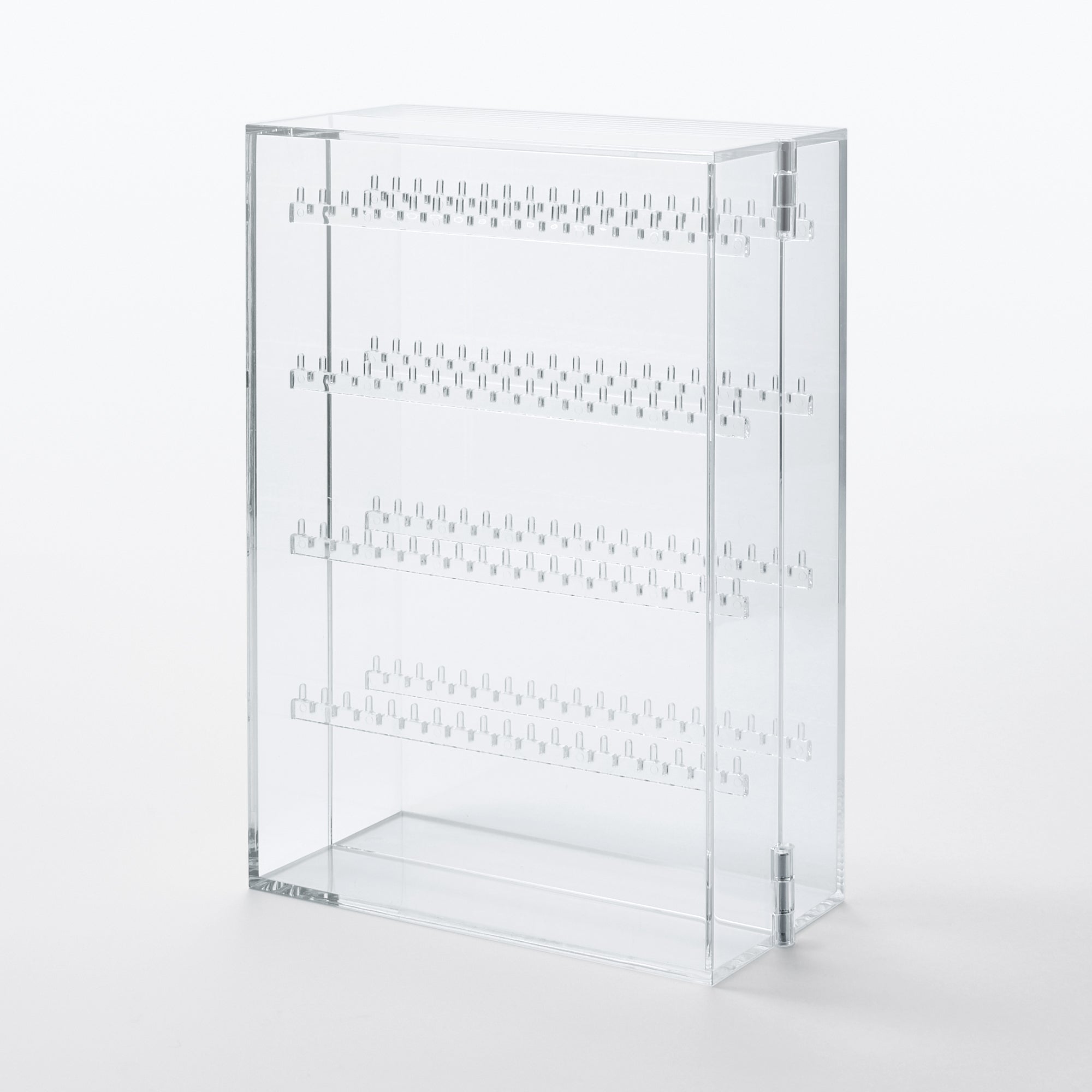 A transparent case with 4 hook tiers that make it ideal for hanging necklaces and earrings. There is also room at the bottom to place a (sold separately) for even more optimized storage.