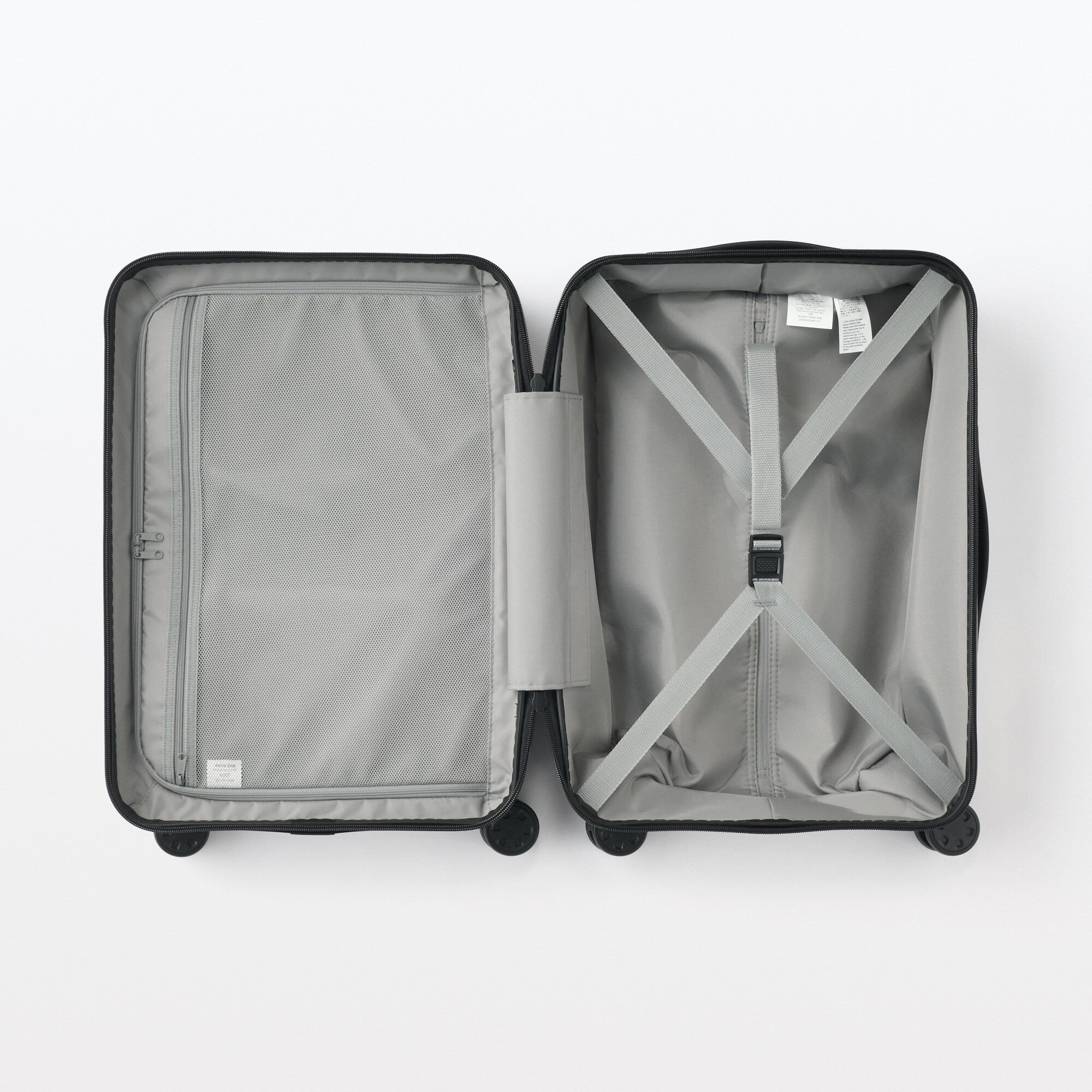 The interior has a buckle strap and zippered partition with a mesh pocket to keep your clothes and essentials in place while in transit. Our wide range of  also fit perfectly inside the suitcase for even more organization options!
