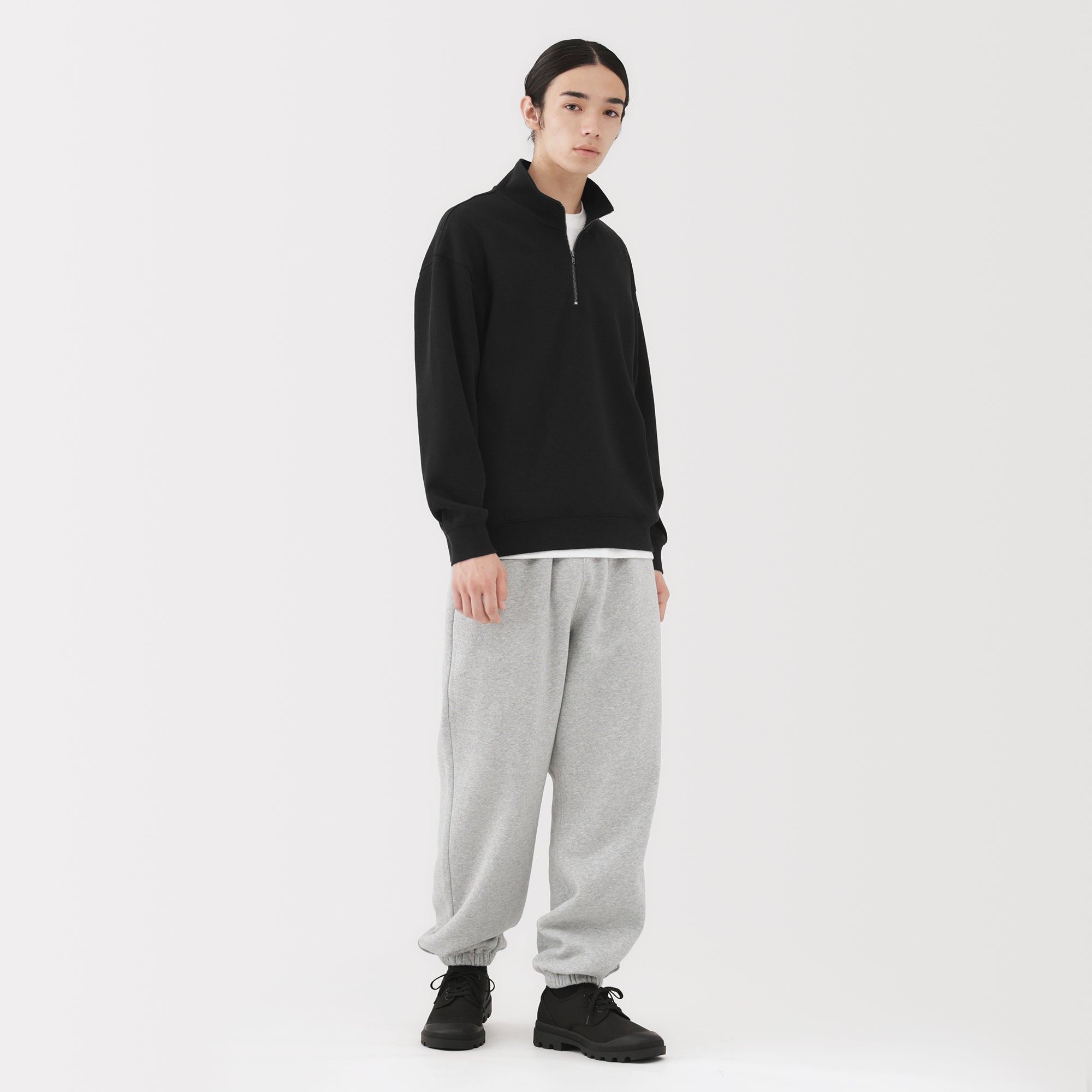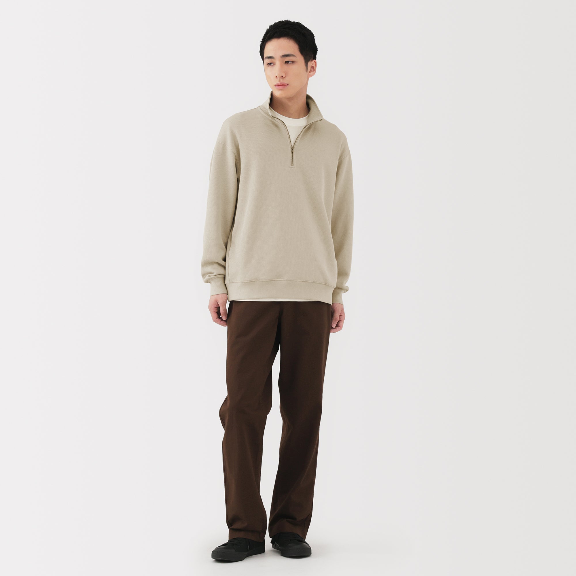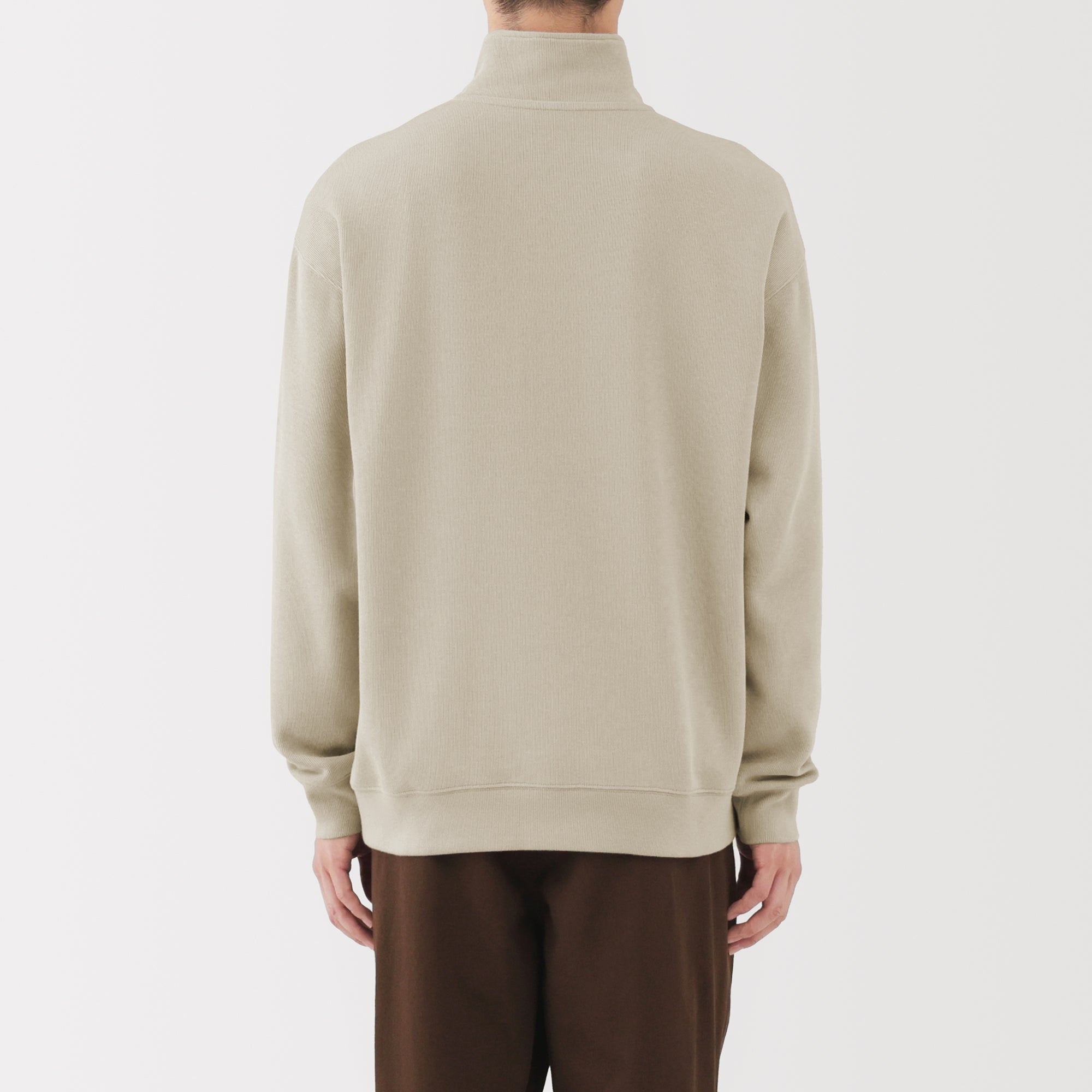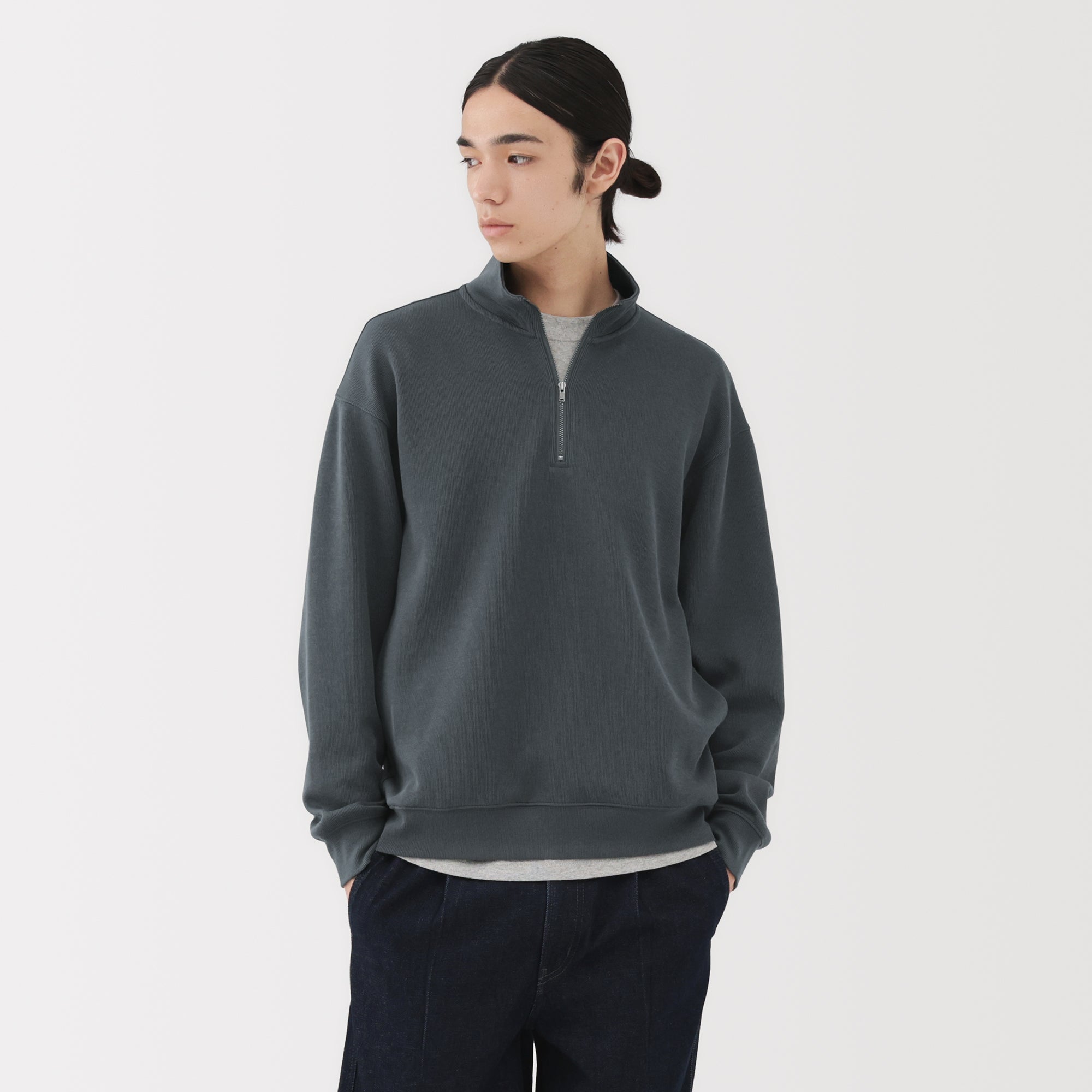 This men’s half zip pullover is made with a blend of cotton and recycled polyester. It is knitted in a double layered structure that keeps it airy and lightweight. with just the right amount of thickness for comfort. The material is smooth and glossy. giving it a clean and elegant look.