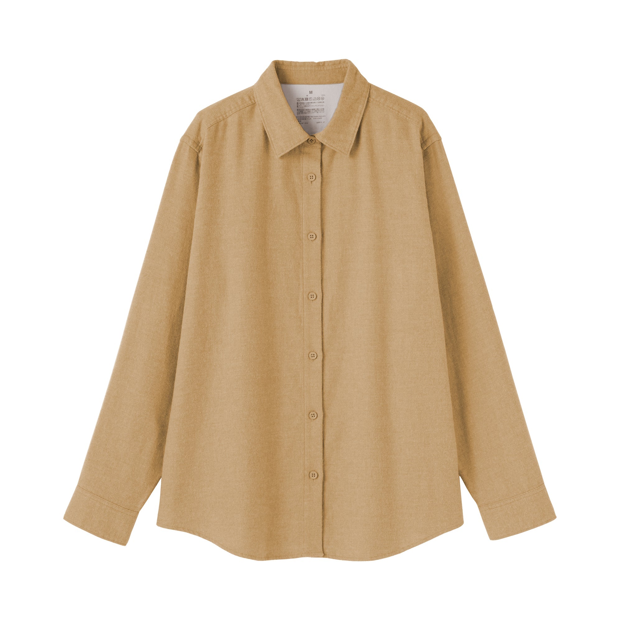 A women’s cotton flannel shirt with a regular collar and relaxed drop shoulder design. Made with fabric that is brushed on both sides for a soft texture to keep you warm on colder days. The fit has been adjusted so this shirt can be worn alone or layered comfortably.