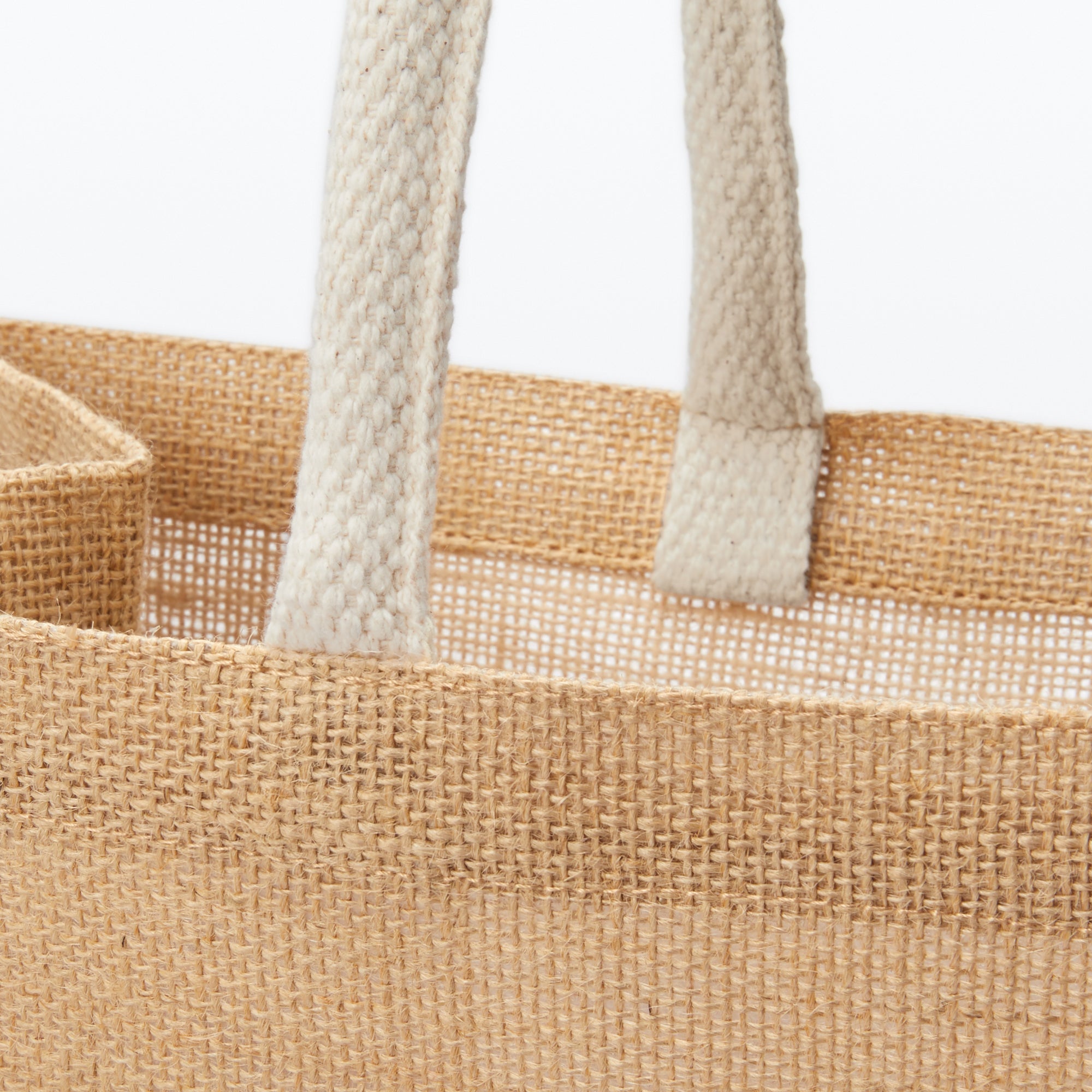 Using uncolored jute material. we have created a bag that can be used for various purposes while maintaining a natural look. The handle uses a cushioned core material that is convenient for both shoulder and hand holding.