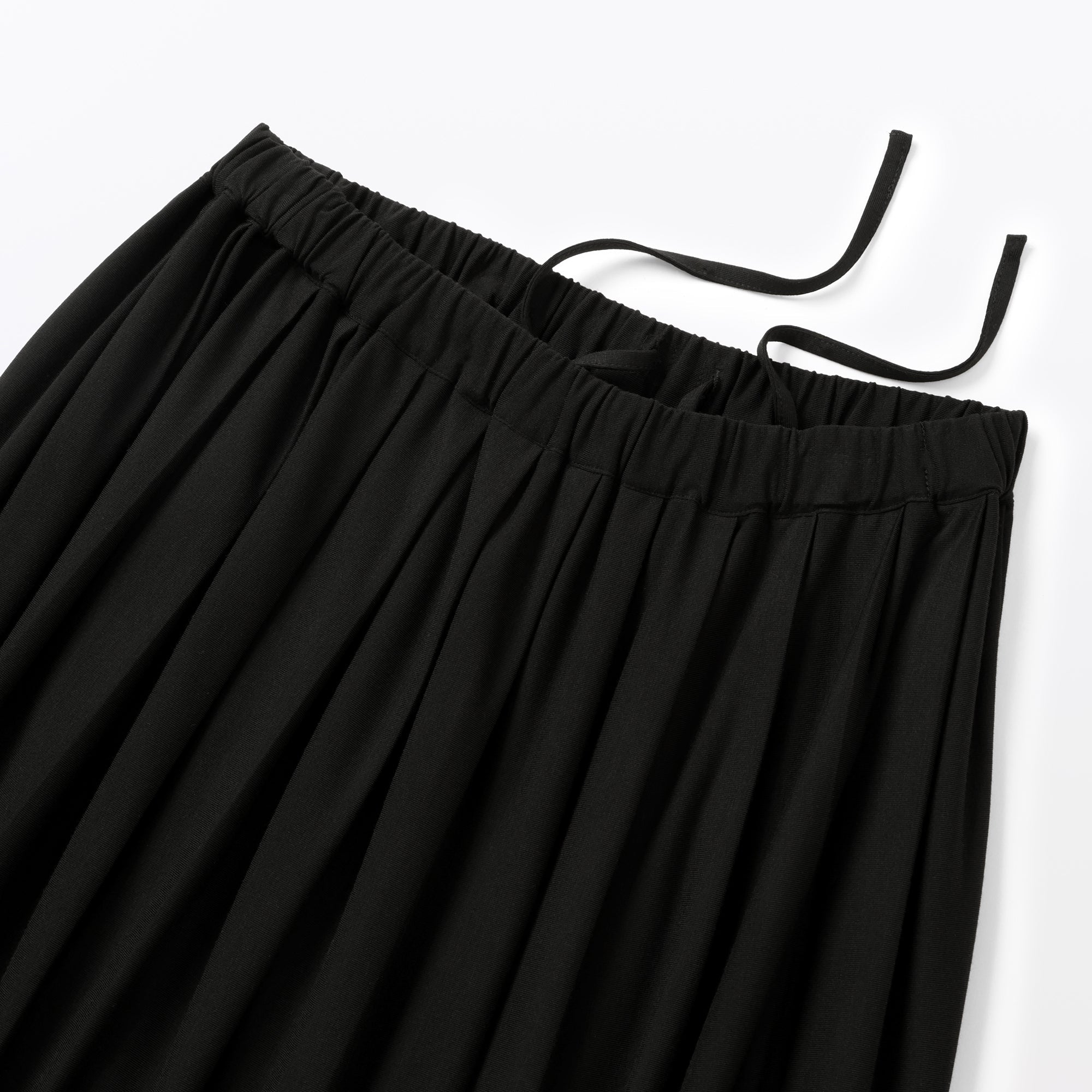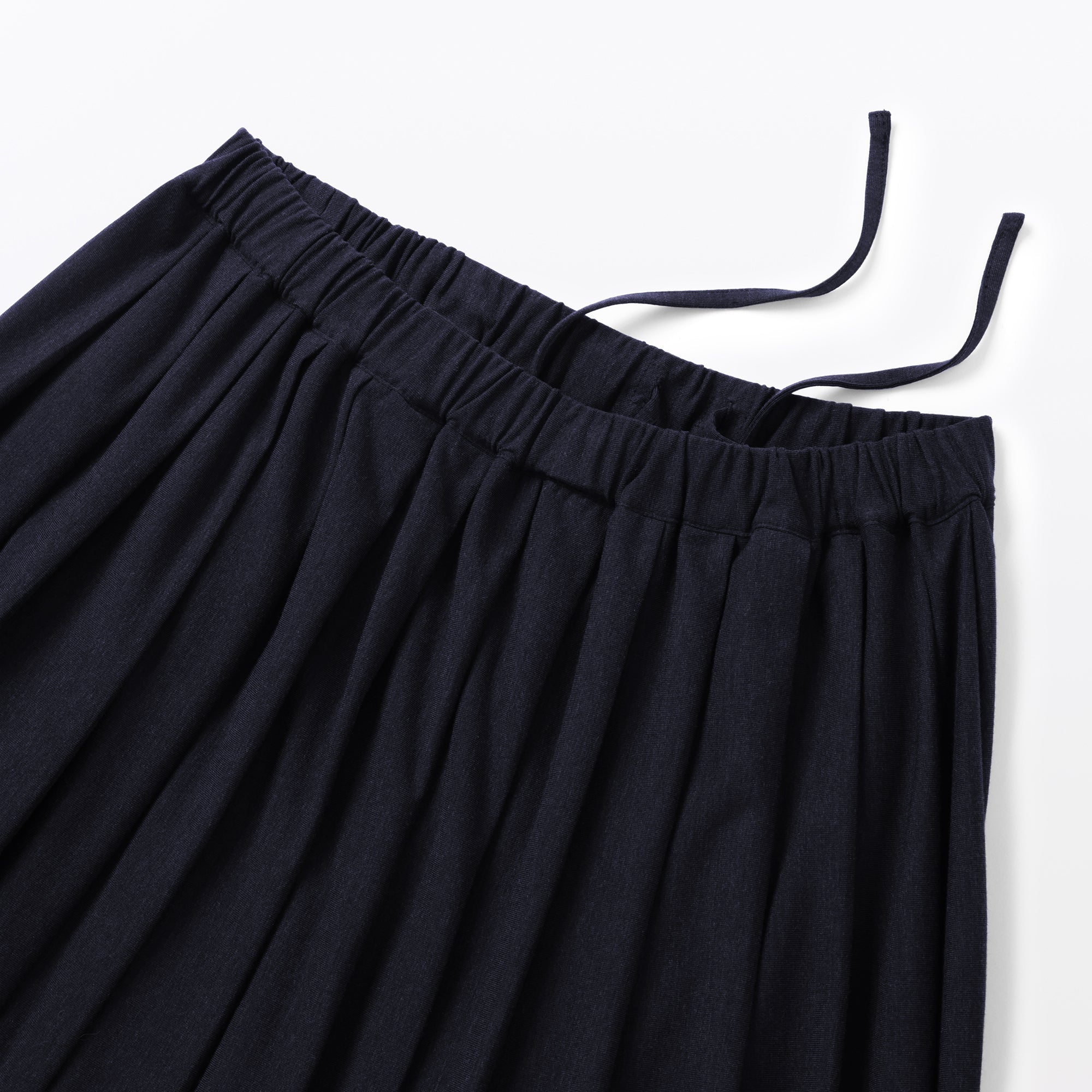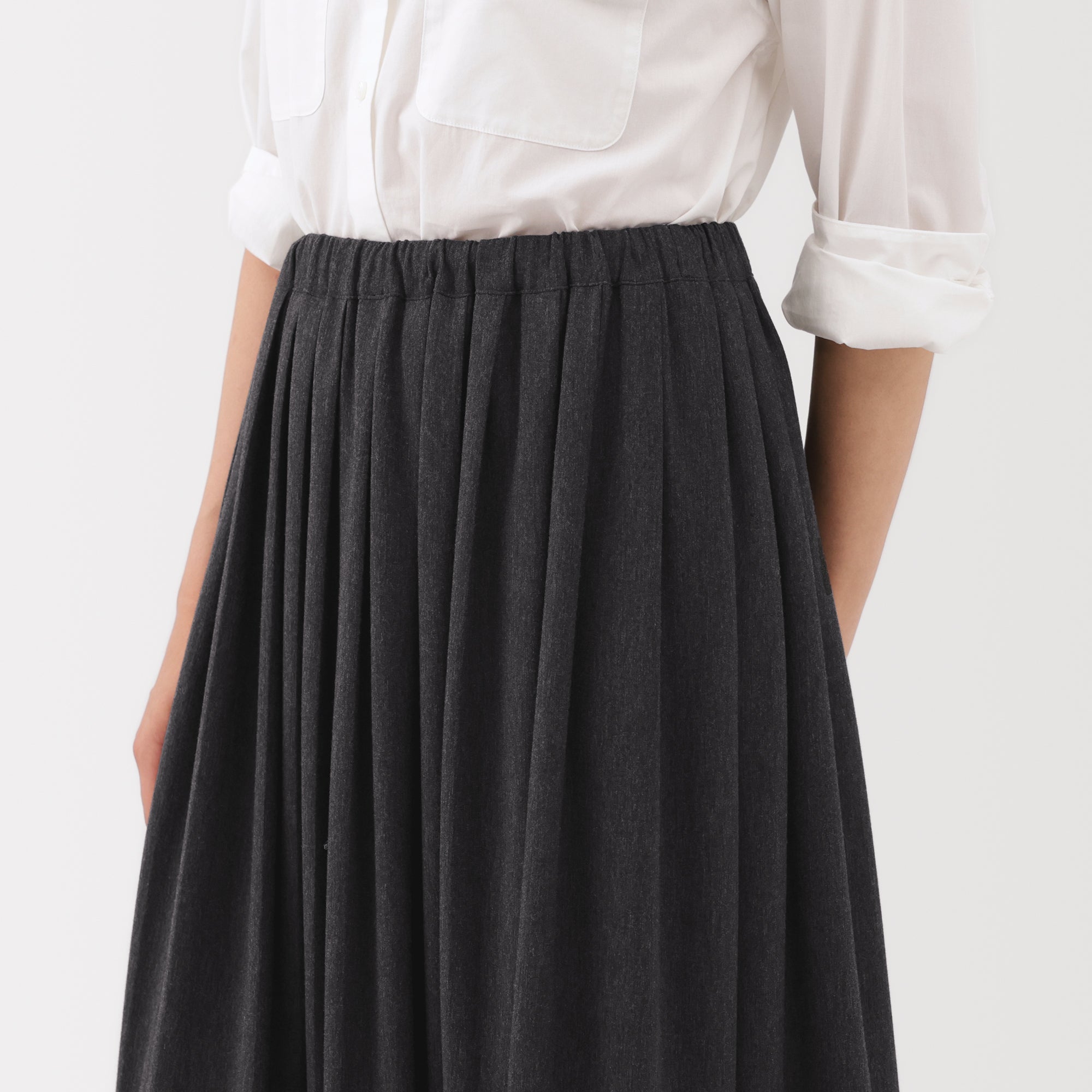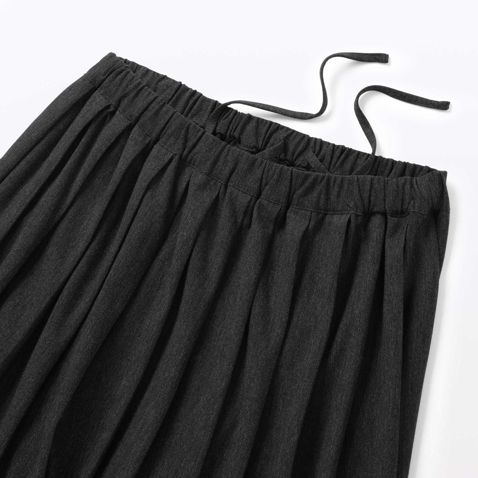 Instead of the standard pleating of woven fabrics. this skirt features pleats that disappear toward the hem. Random pleating creates a flattering three-dimensional effect and allows for ease of movement. The waistband has an internal drawstring for an adjustable fit.