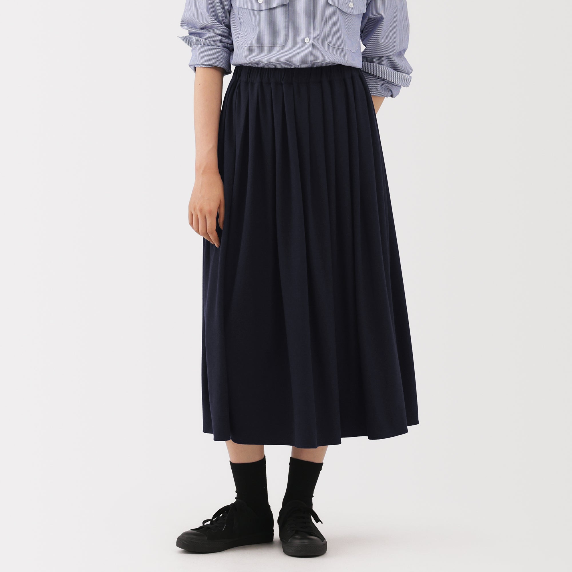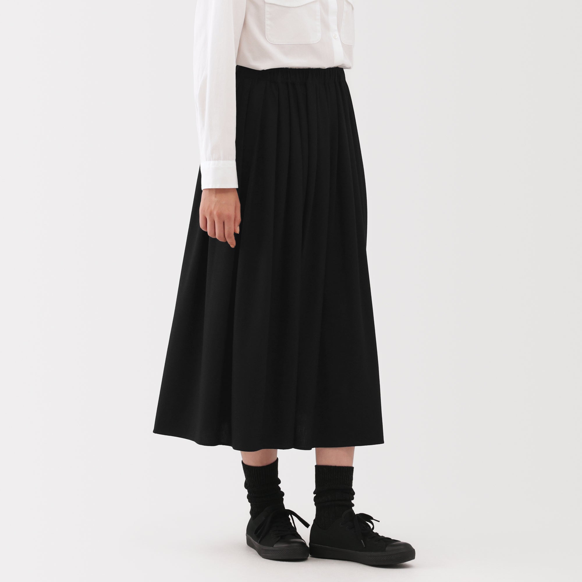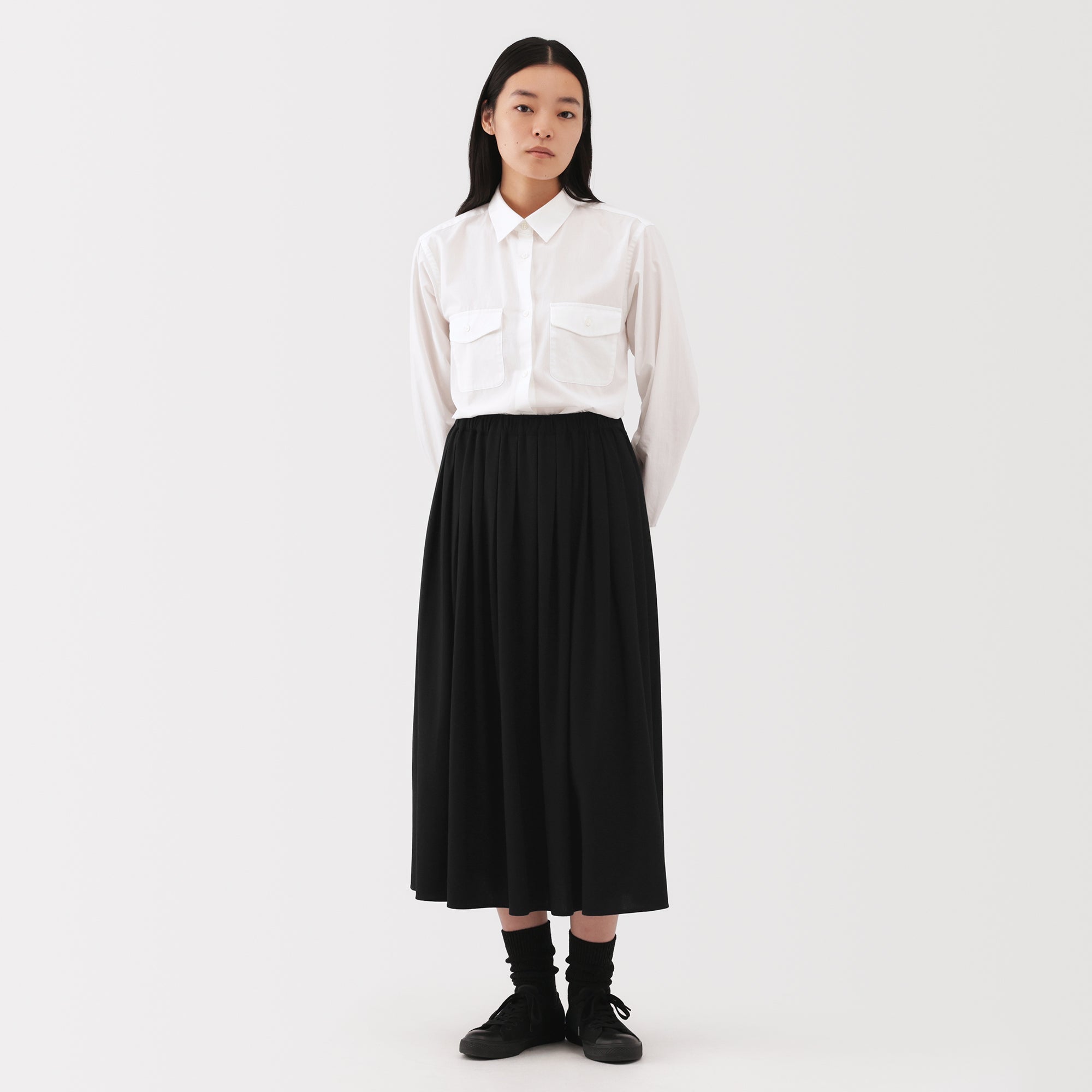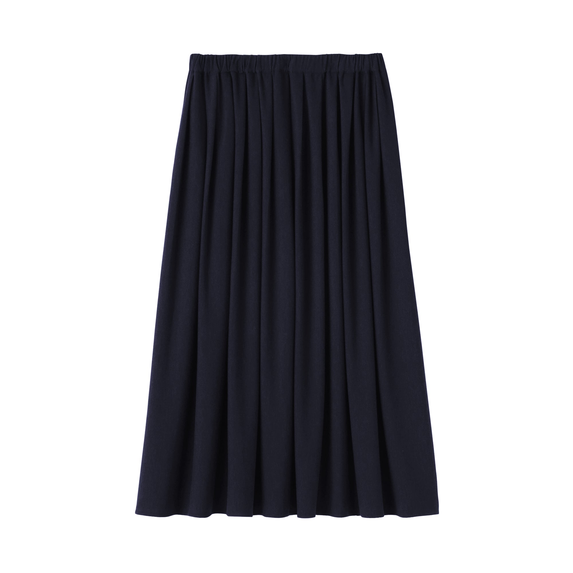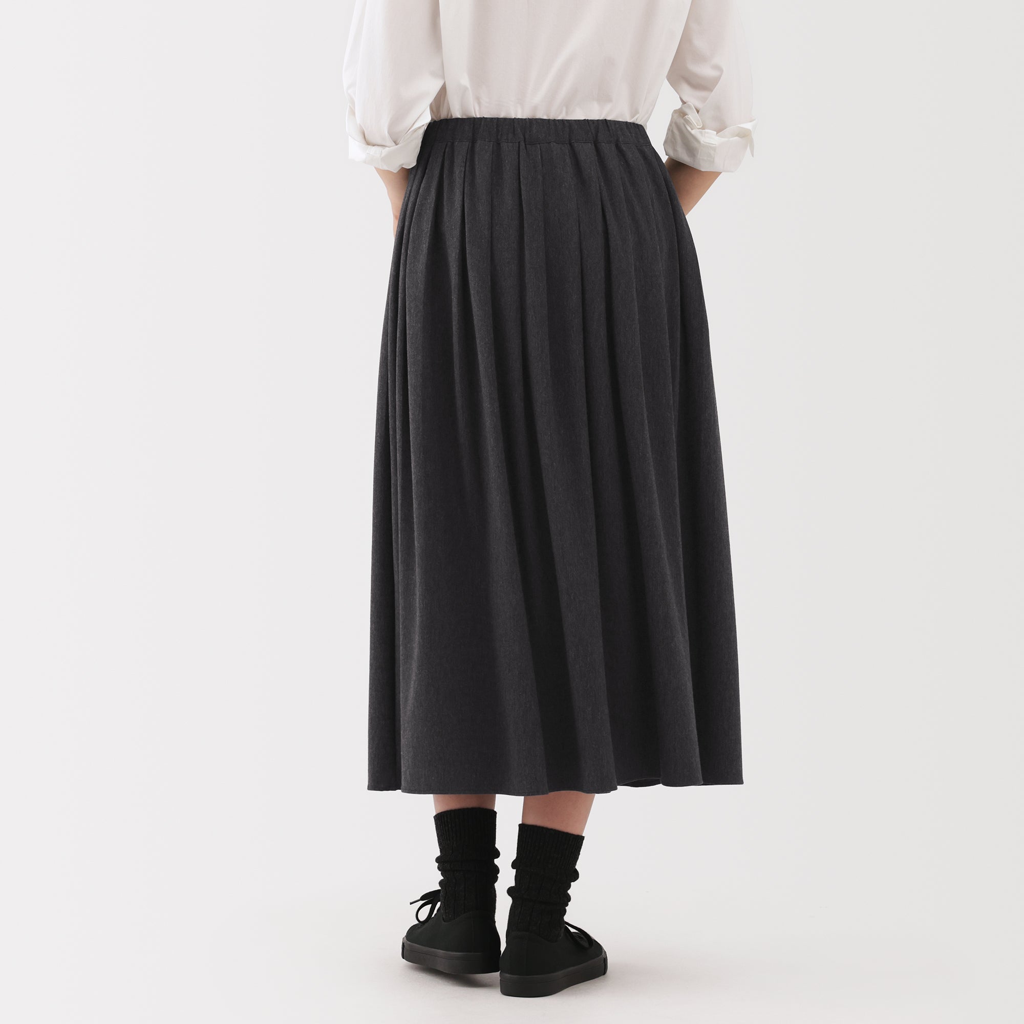Instead of the standard pleating of woven fabrics. this skirt features pleats that disappear toward the hem. Random pleating creates a flattering three-dimensional effect and allows for ease of movement. The waistband has an internal drawstring for an adjustable fit.