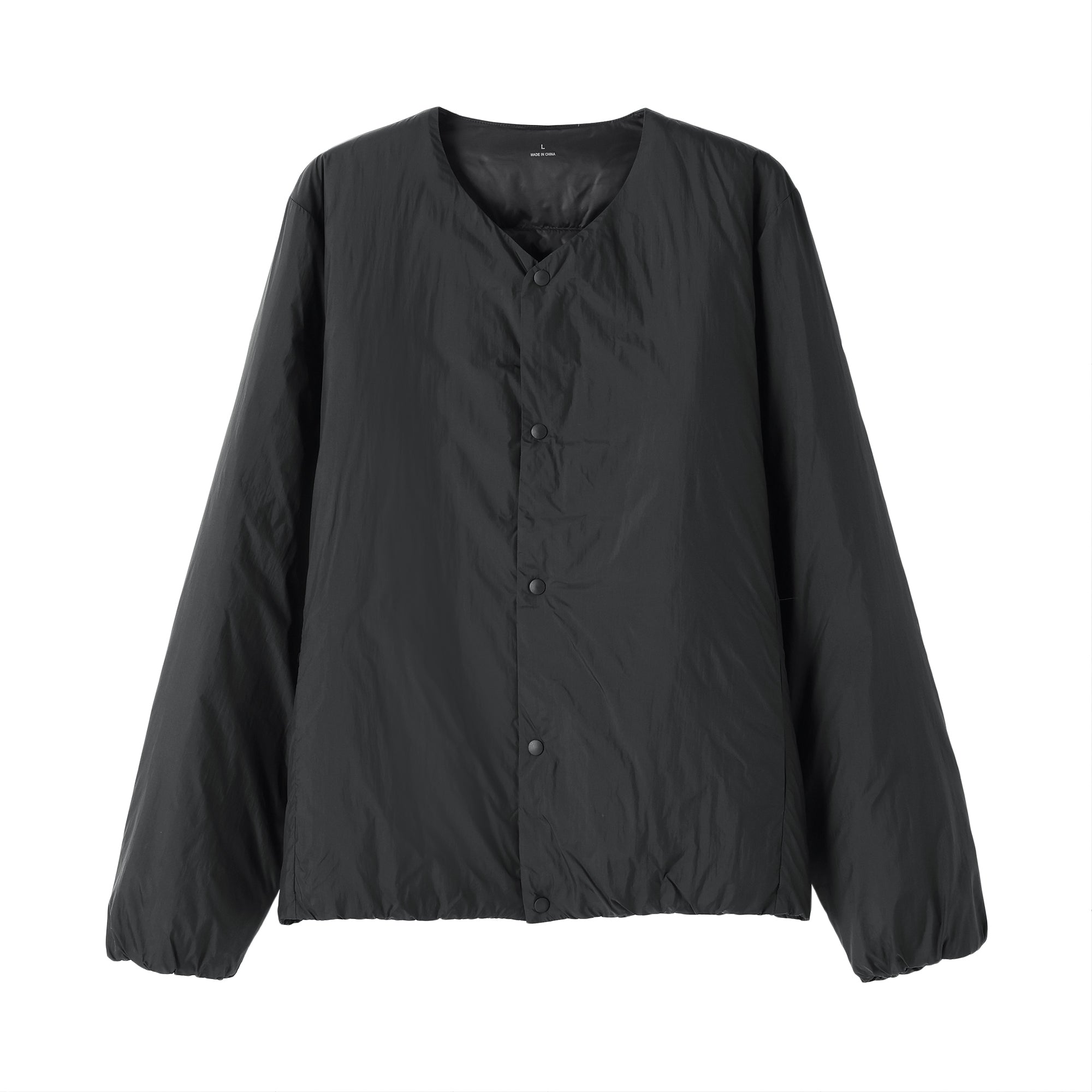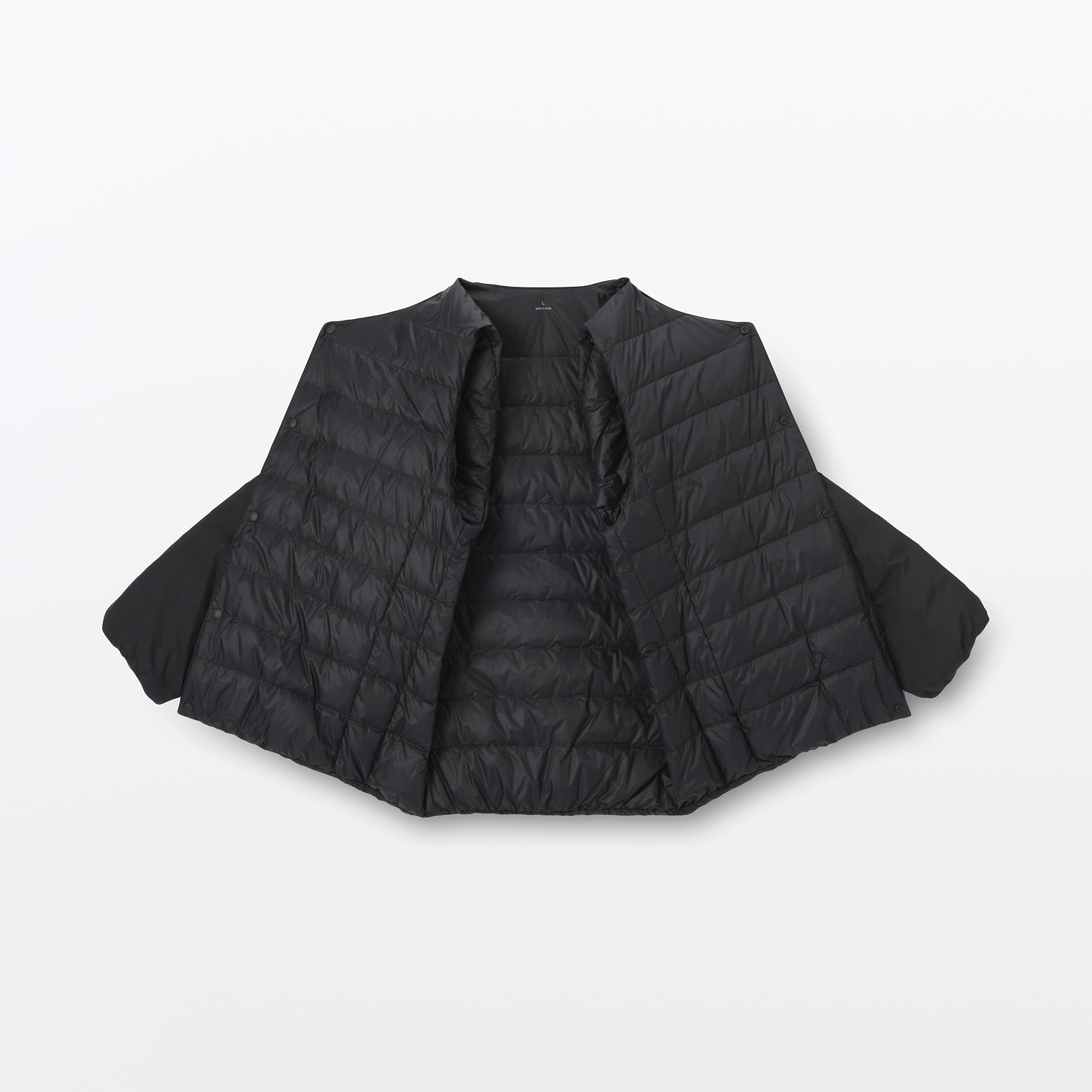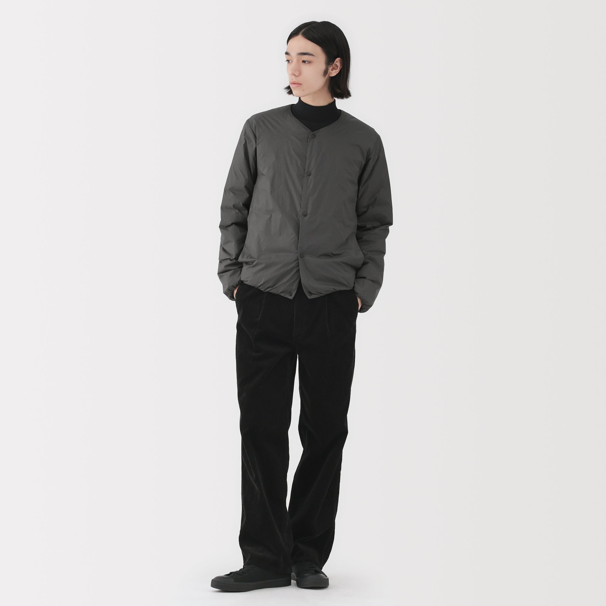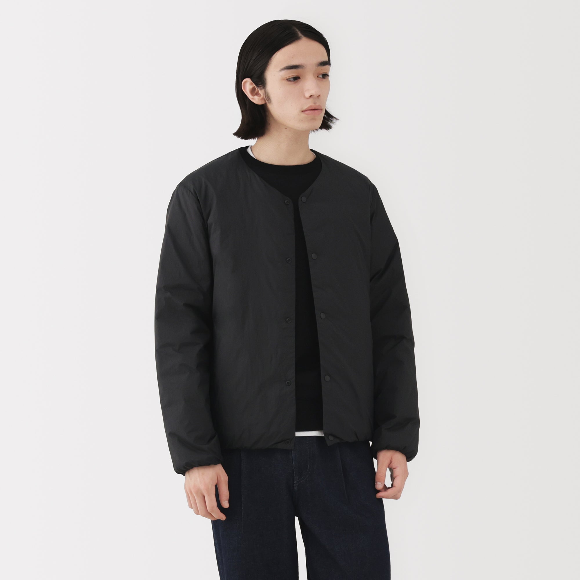 A men’s lightweight down collarless jacket made with recycled nylon fabric and fill power 750 down. Designed to be foldable and easy to carry. Thick and light enough to be layered in the winter.