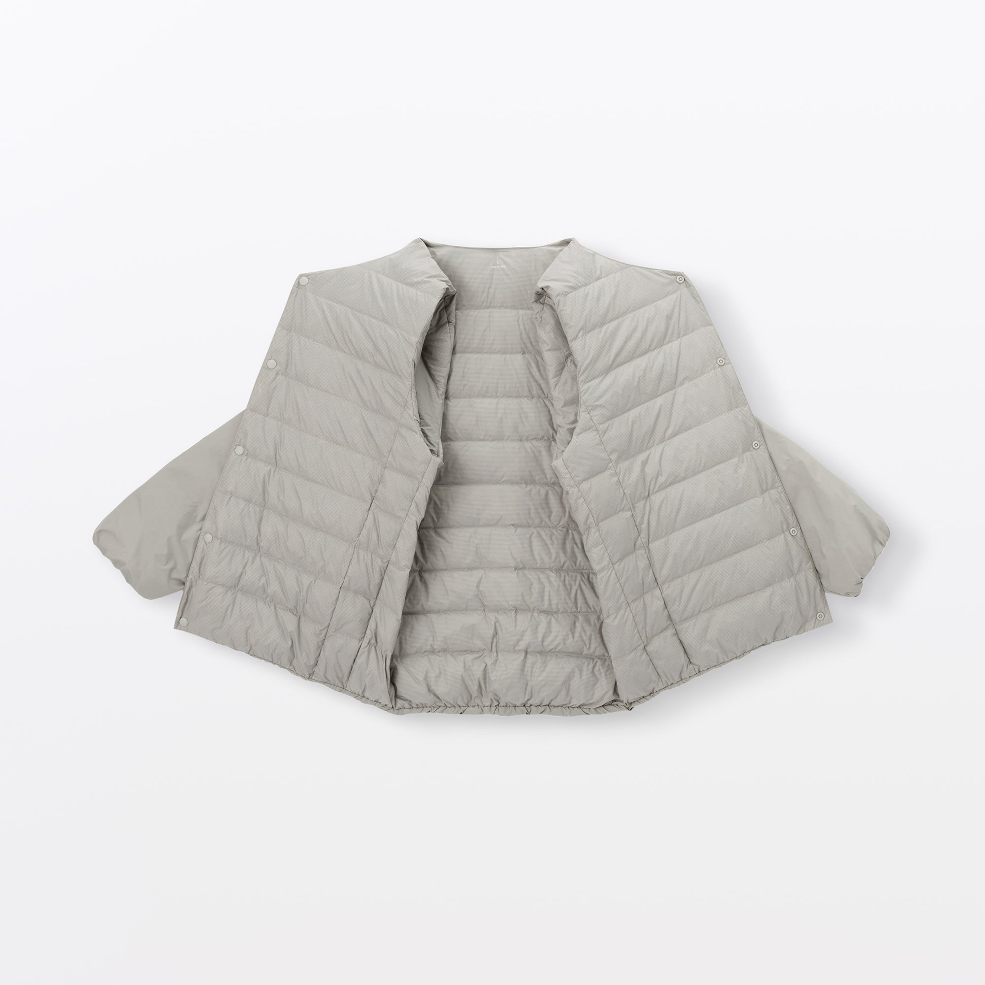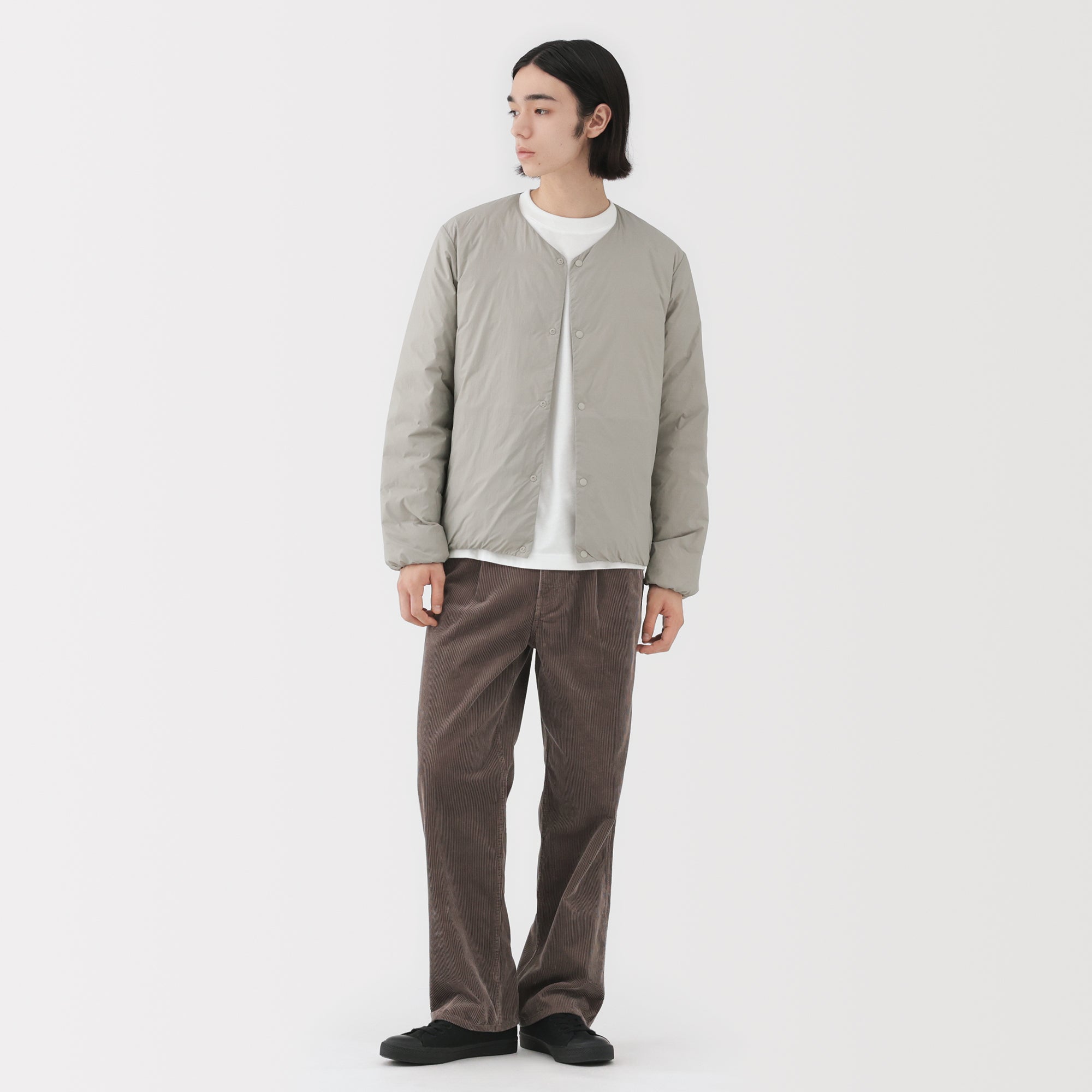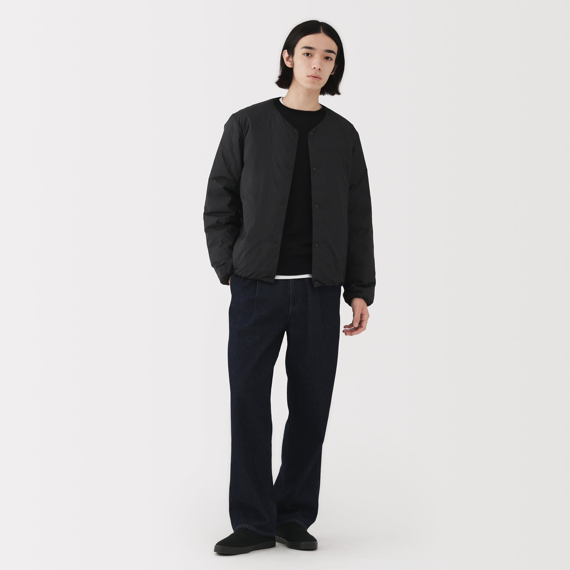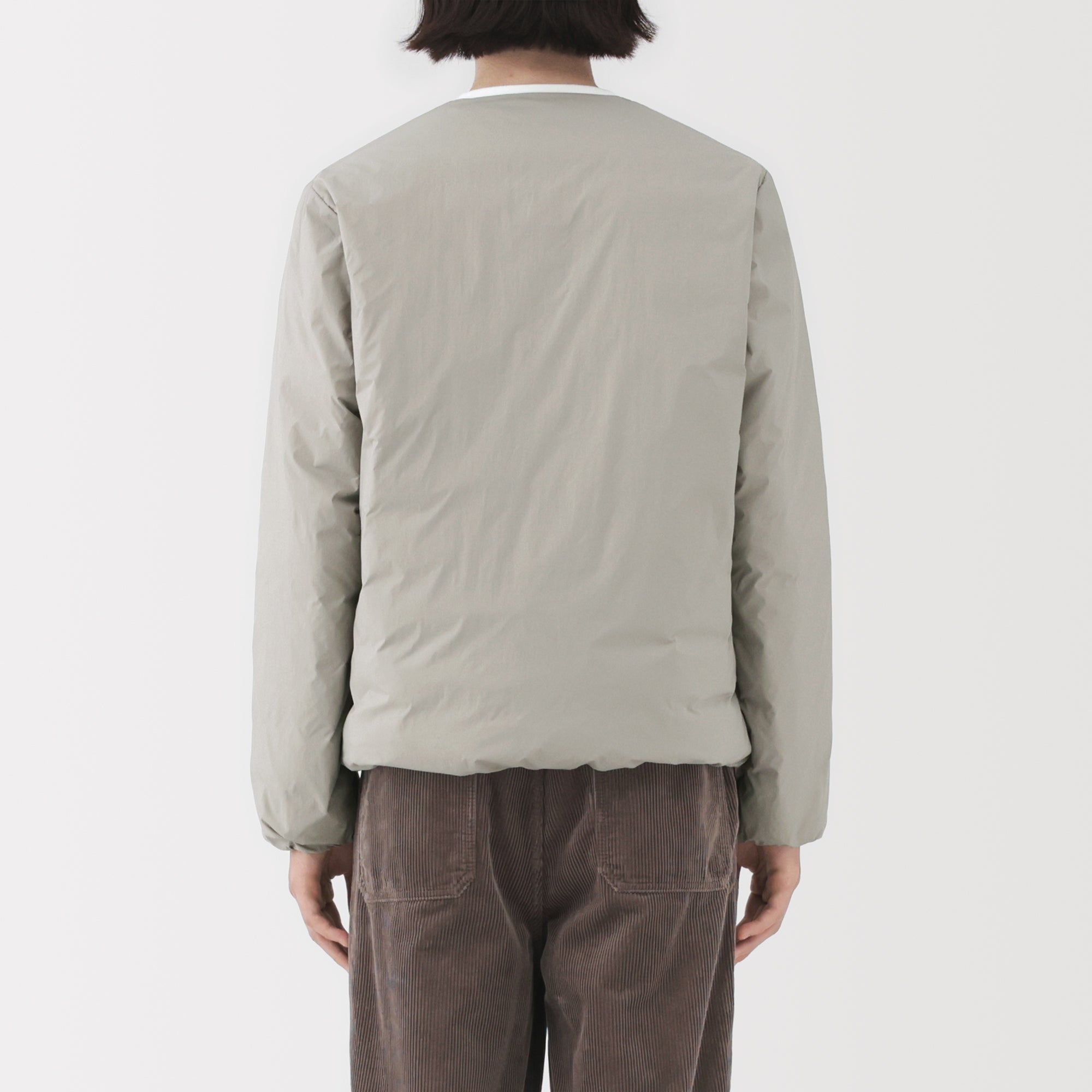 A men’s lightweight down collarless jacket made with recycled nylon fabric and fill power 750 down. Designed to be foldable and easy to carry. Thick and light enough to be layered in the winter.