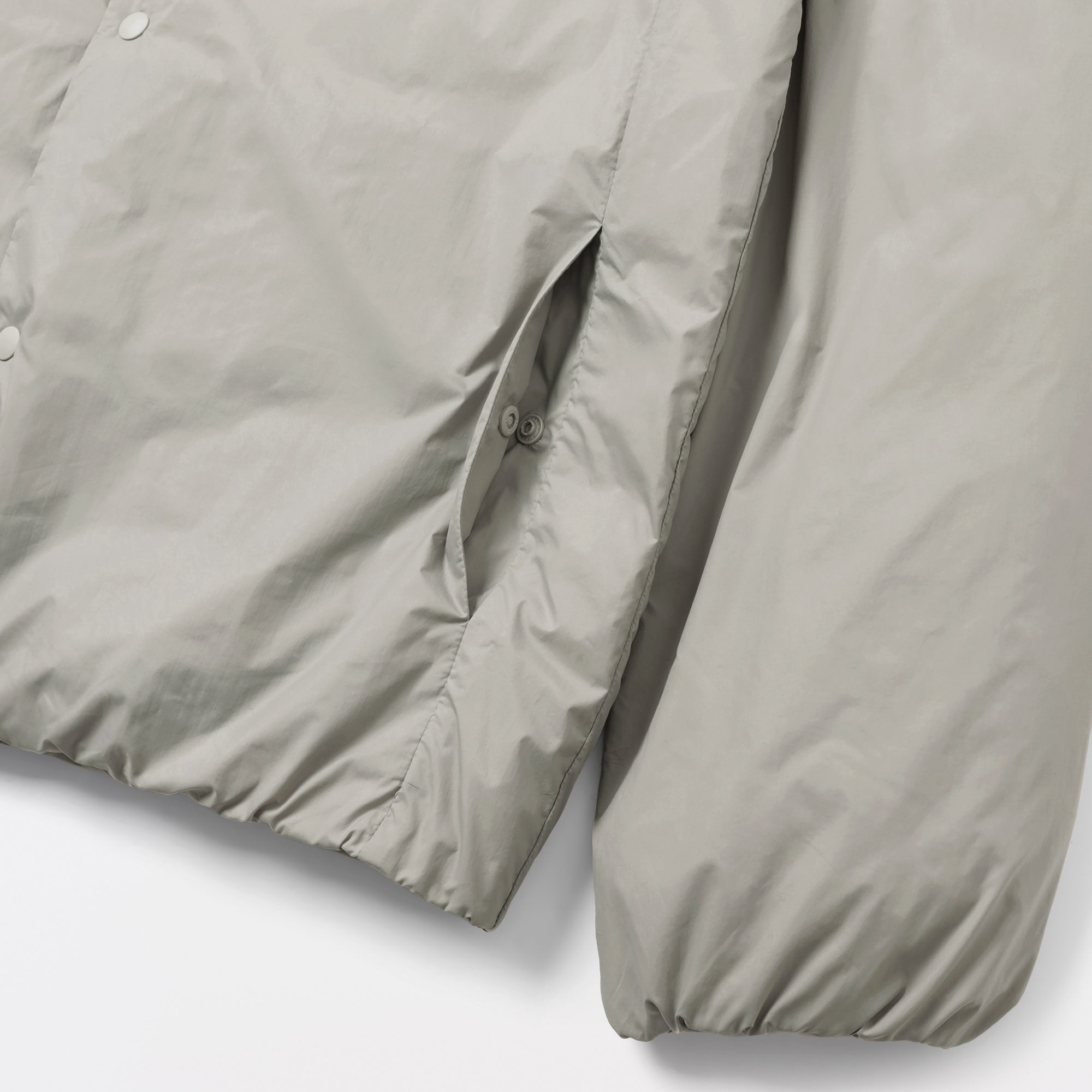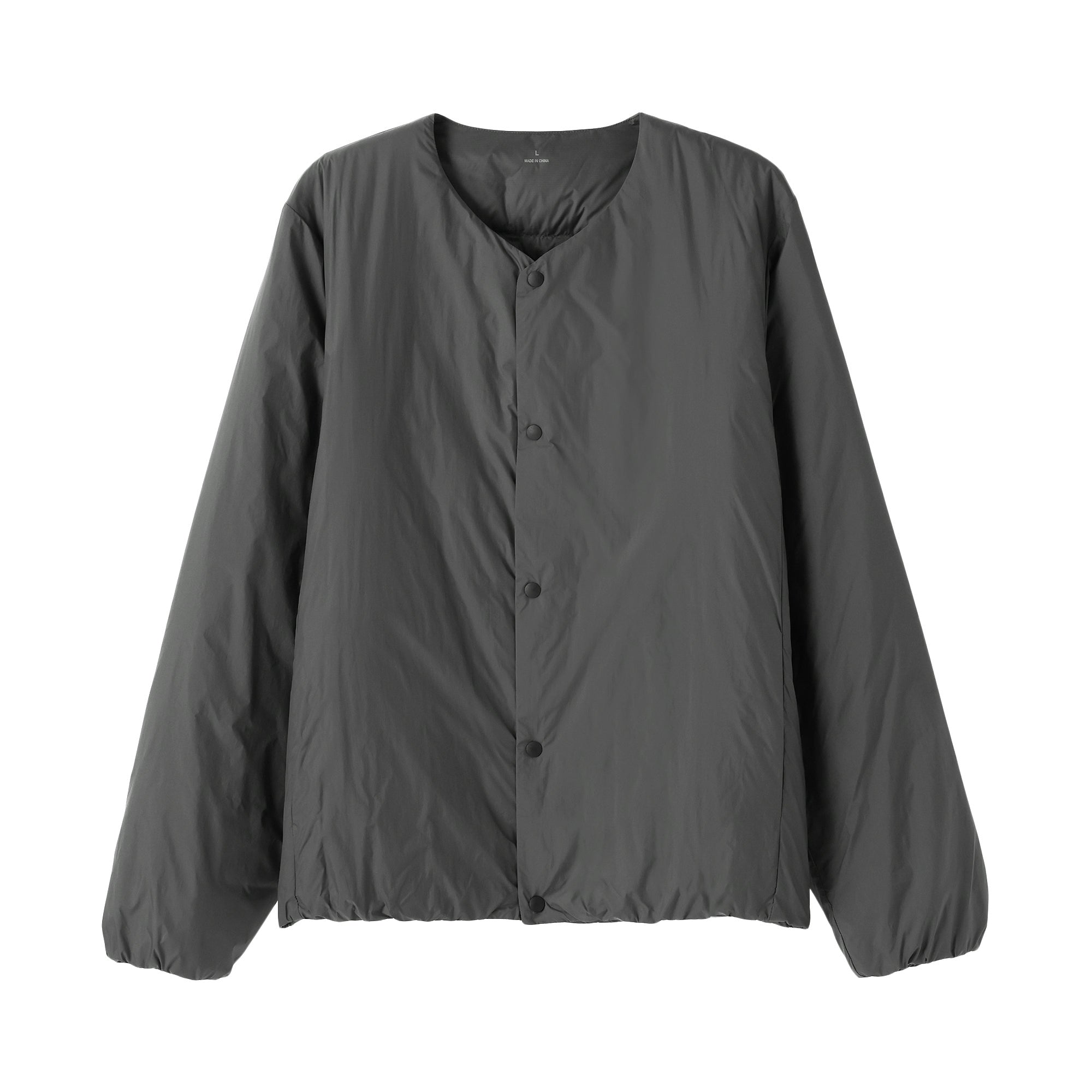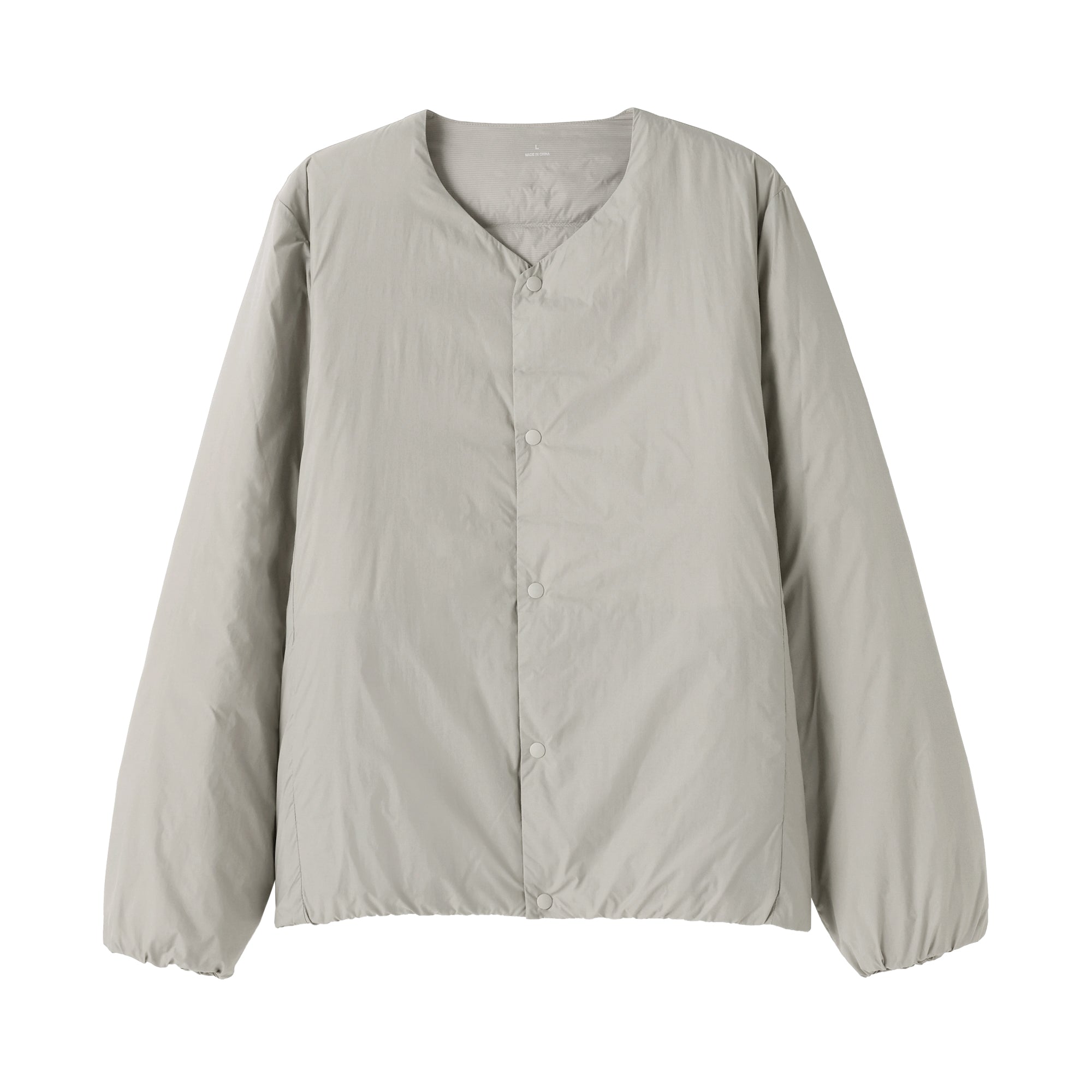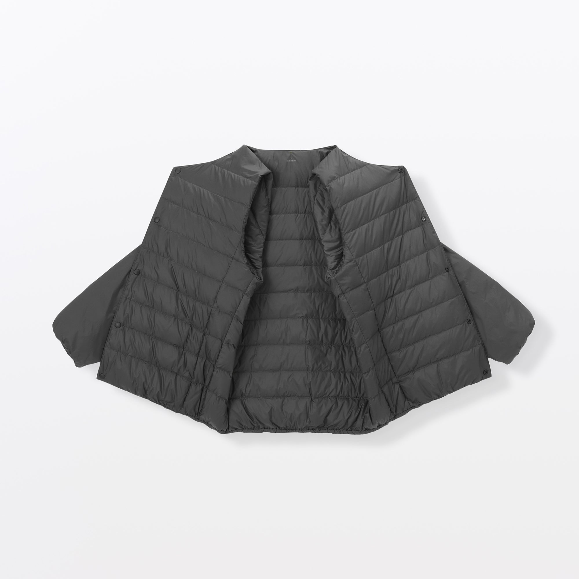 A men’s lightweight down collarless jacket made with recycled nylon fabric and fill power 750 down. Designed to be foldable and easy to carry. Thick and light enough to be layered in the winter.