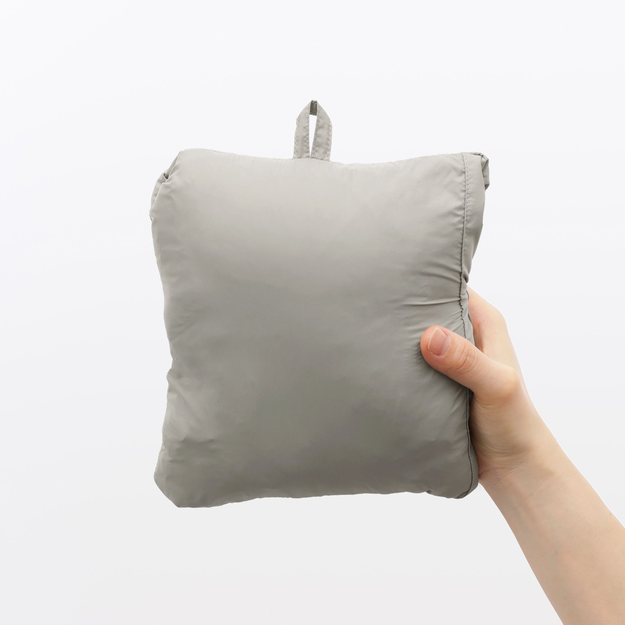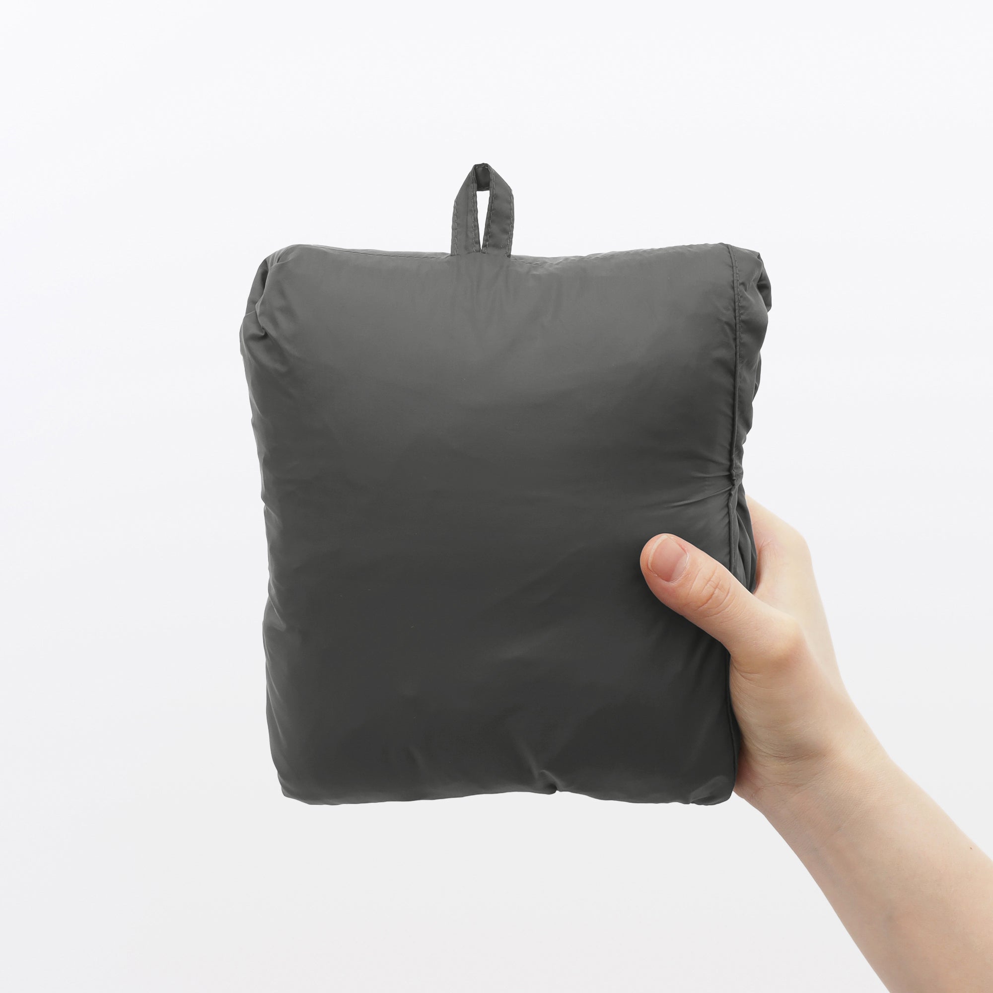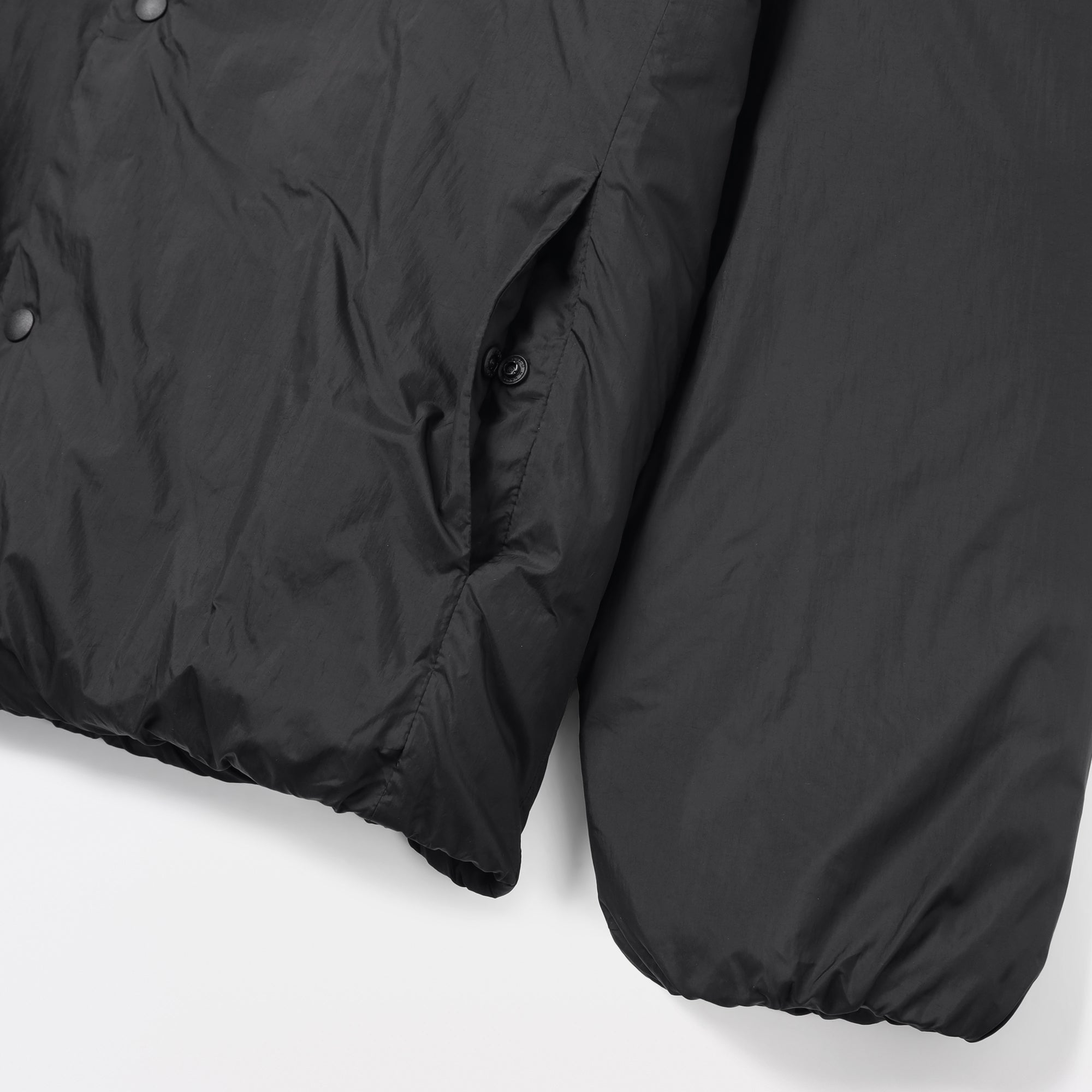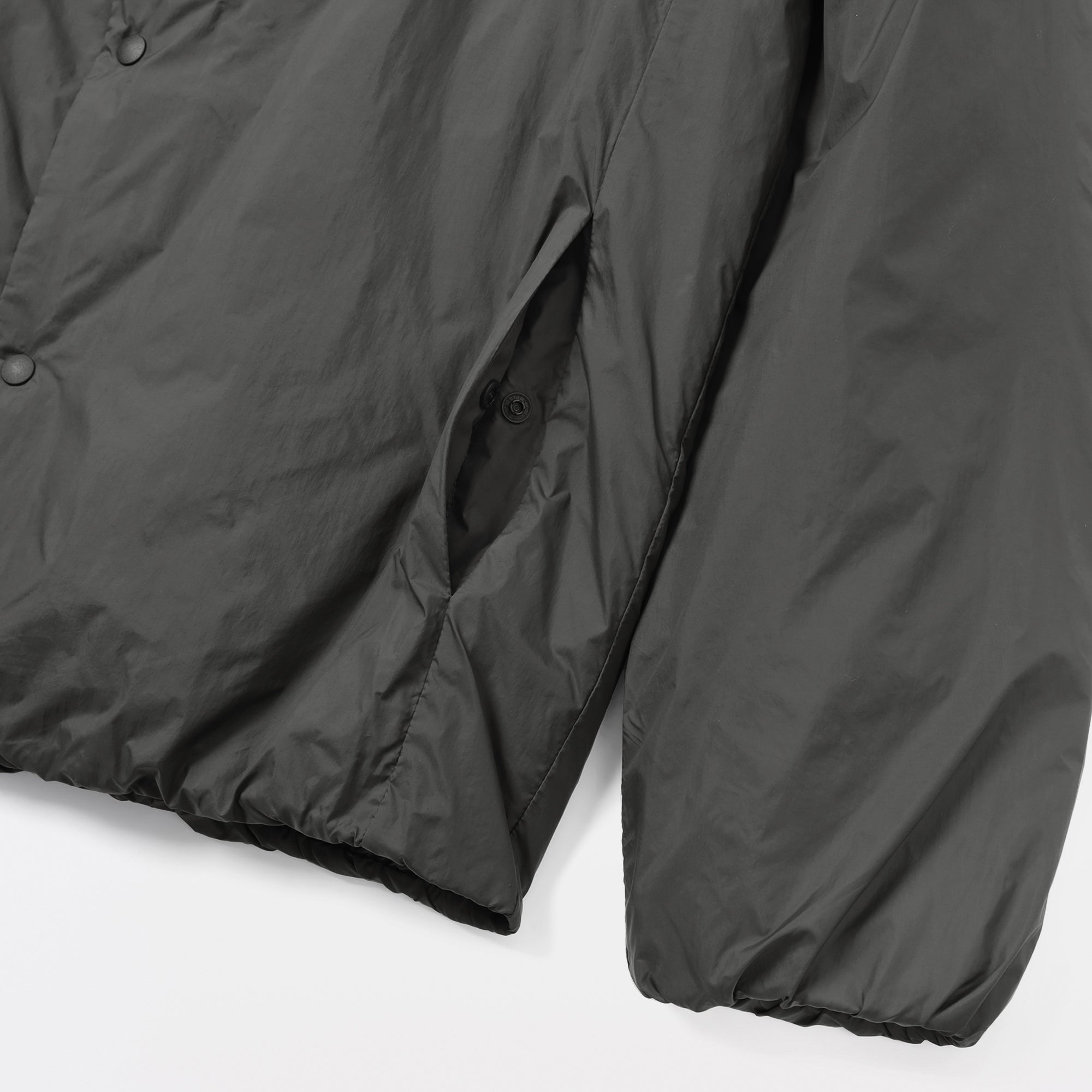 A men’s lightweight down collarless jacket made with recycled nylon fabric and fill power 750 down. Designed to be foldable and easy to carry. Thick and light enough to be layered in the winter.