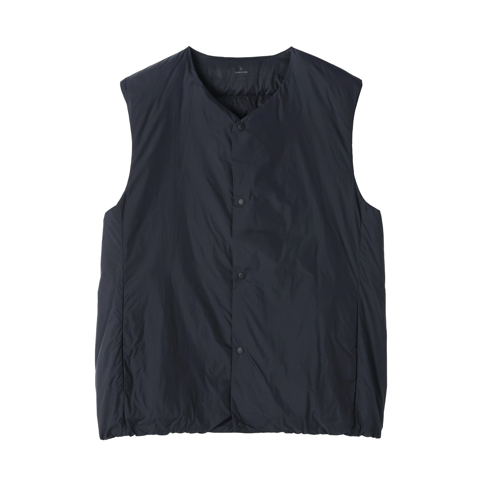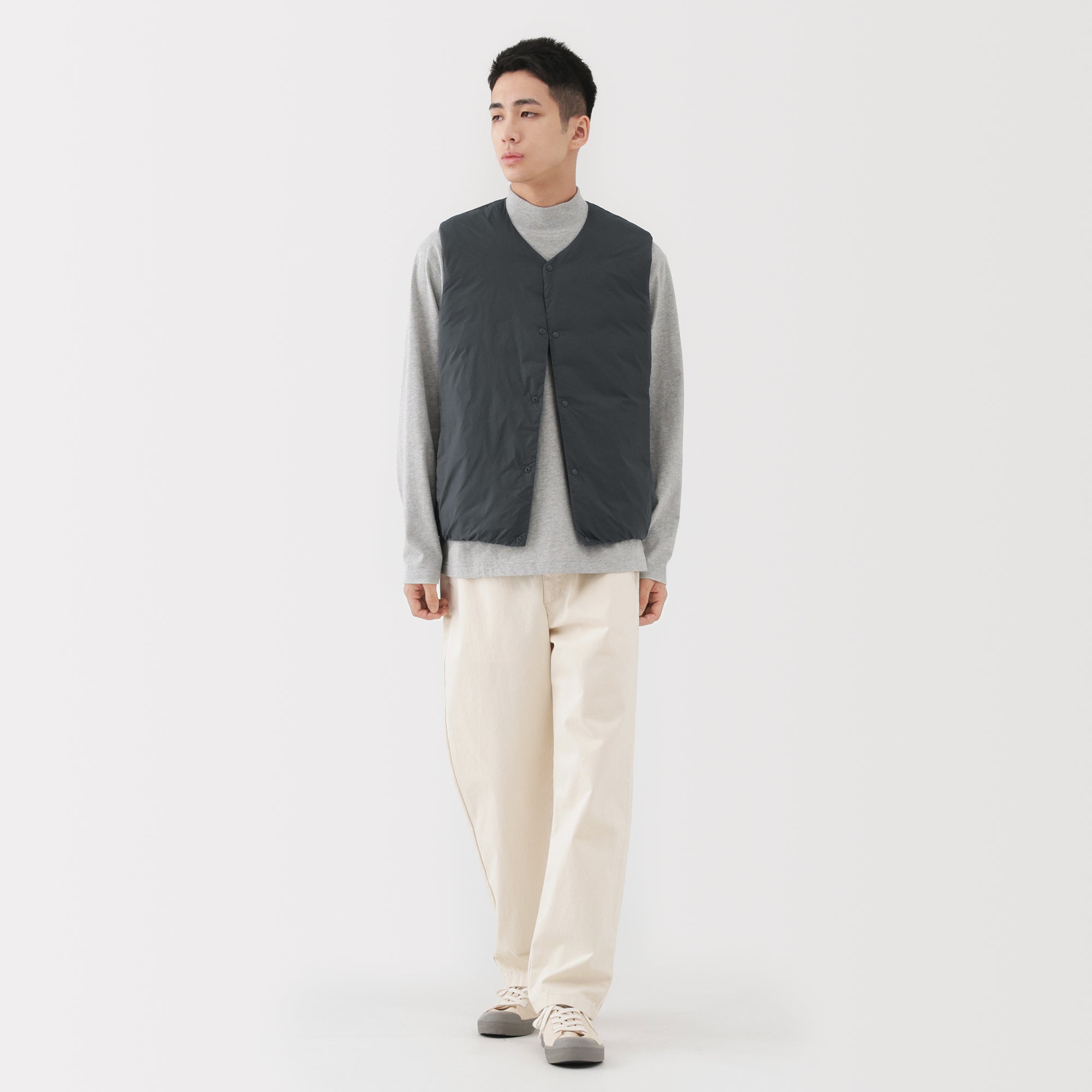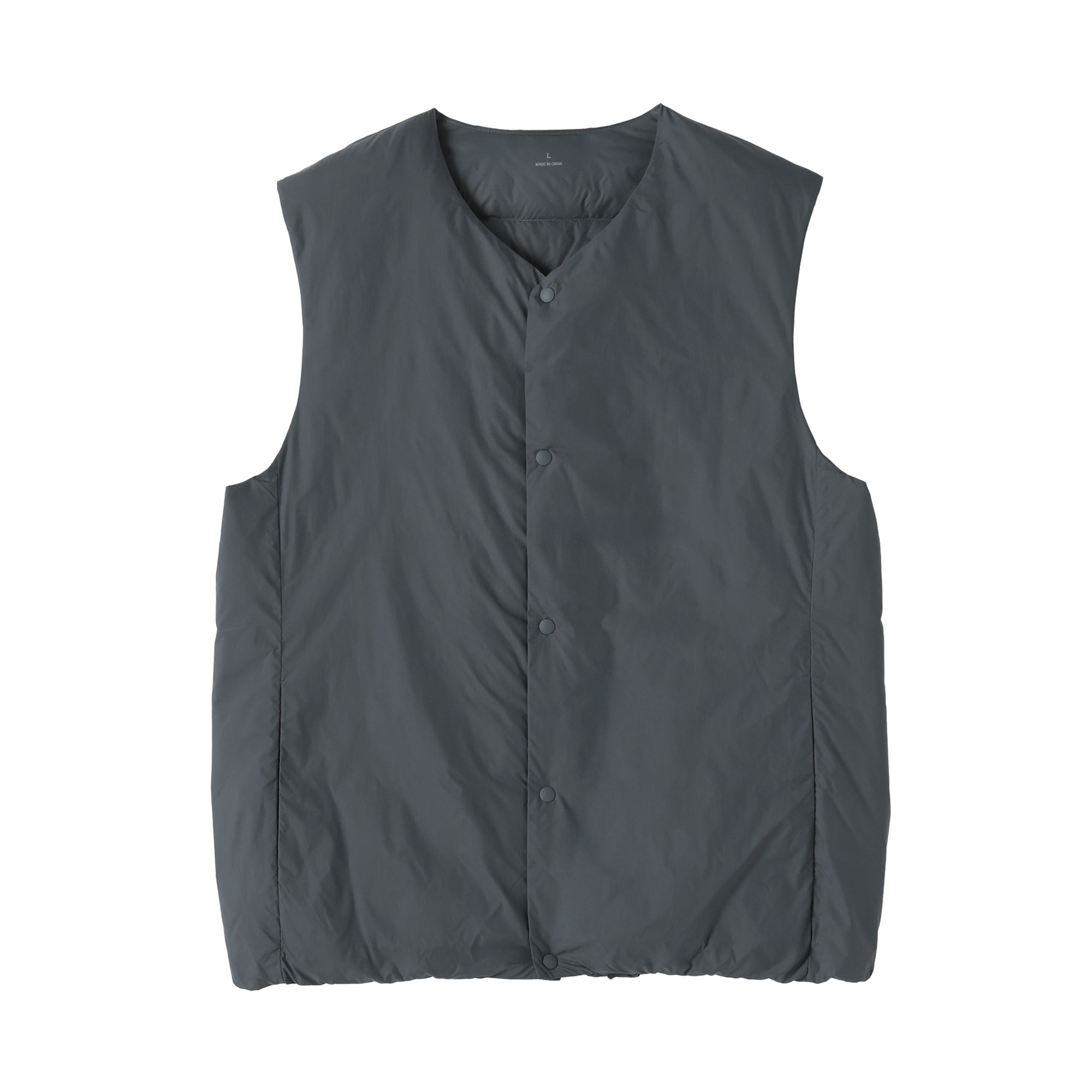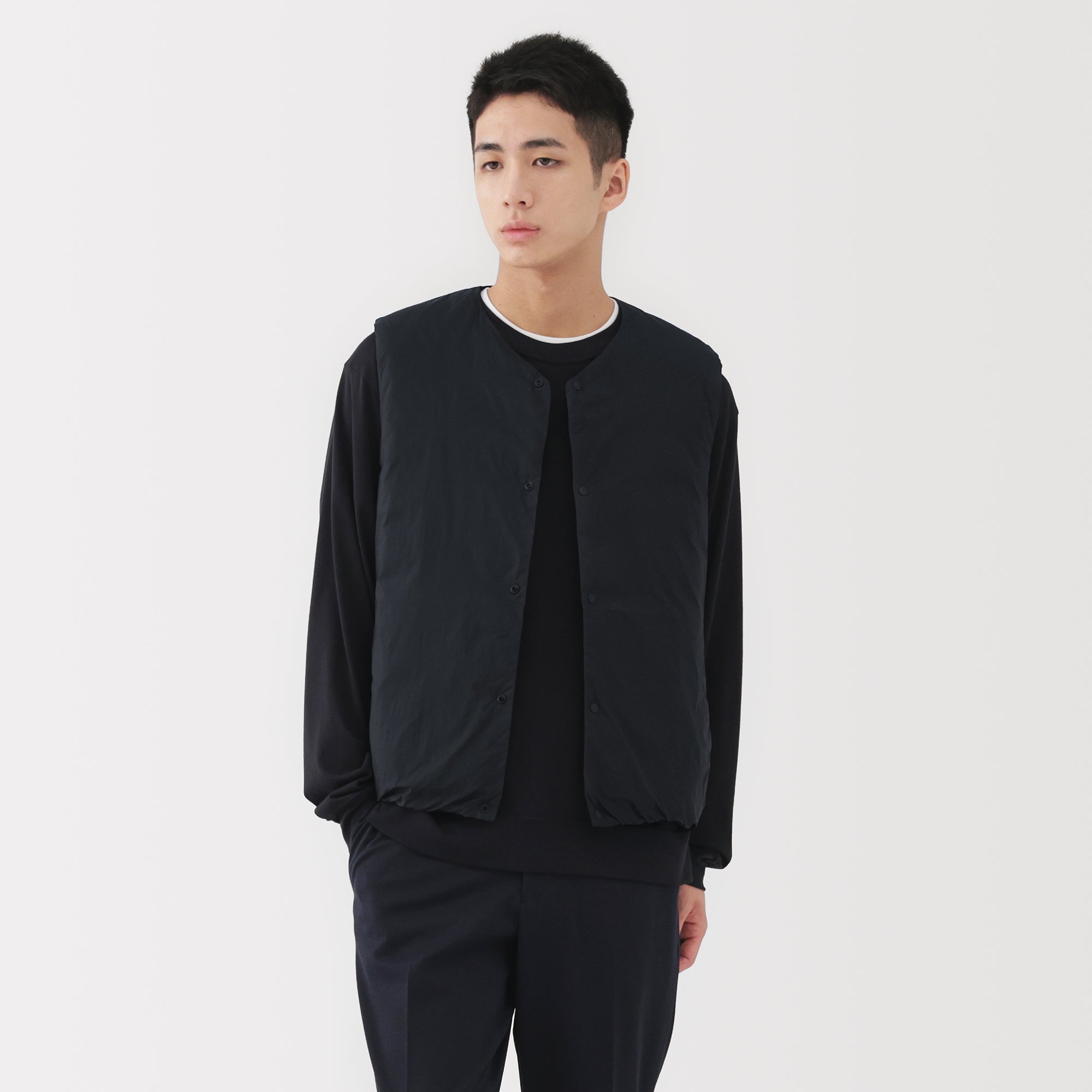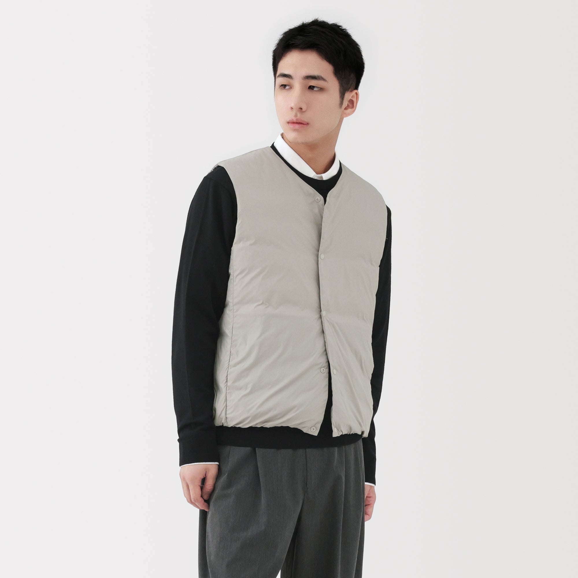 A men’s lightweight down collarless vest made with recycled nylon fabric and fill power 750 down. Designed to be foldable and easy to carry. Thick and light enough to be layered in the winter.