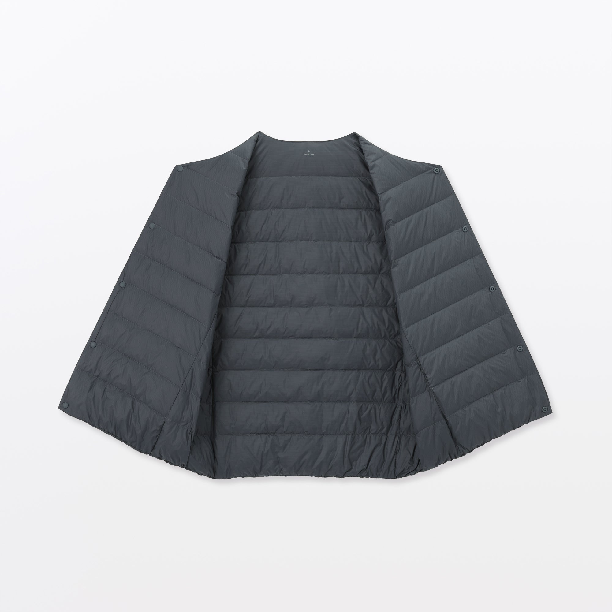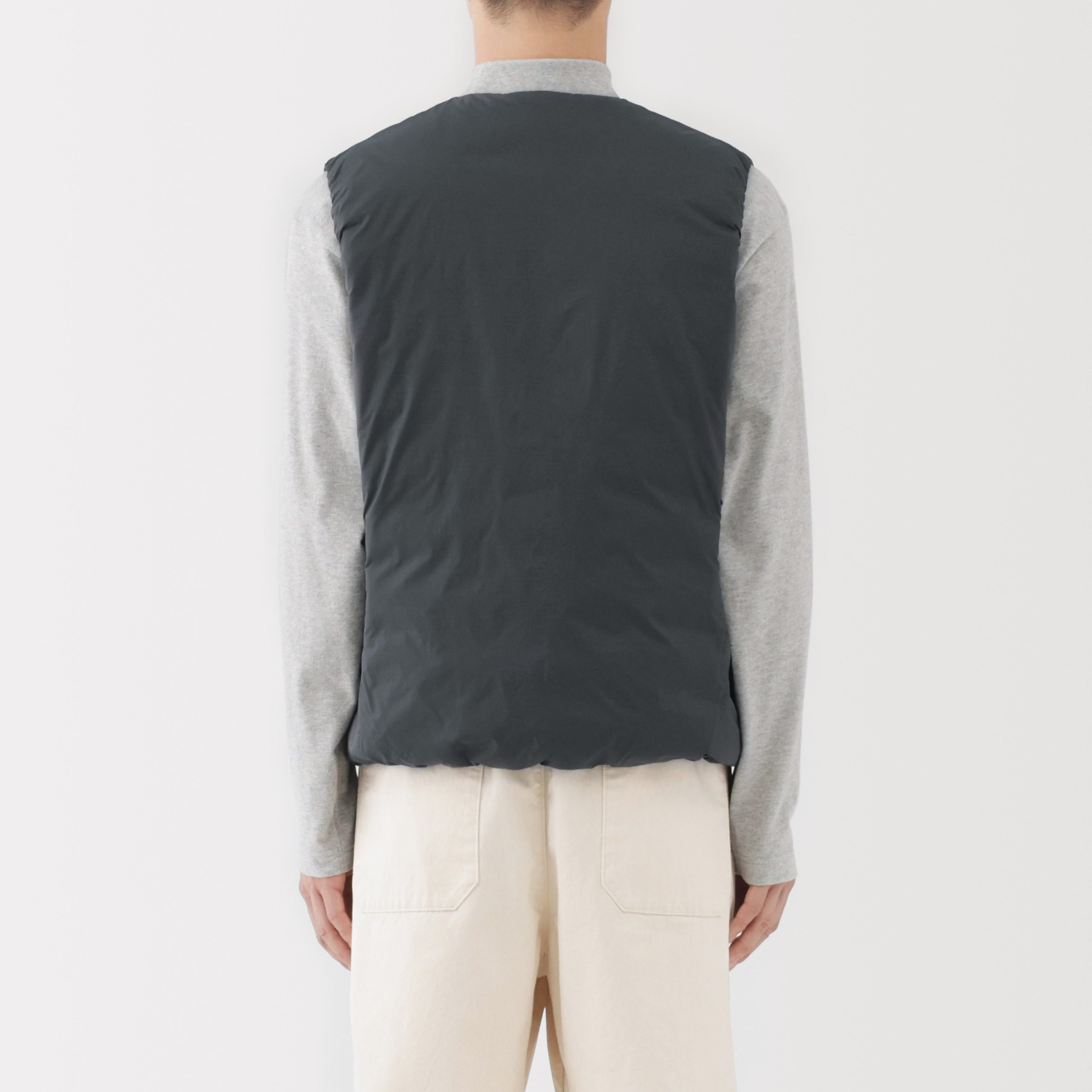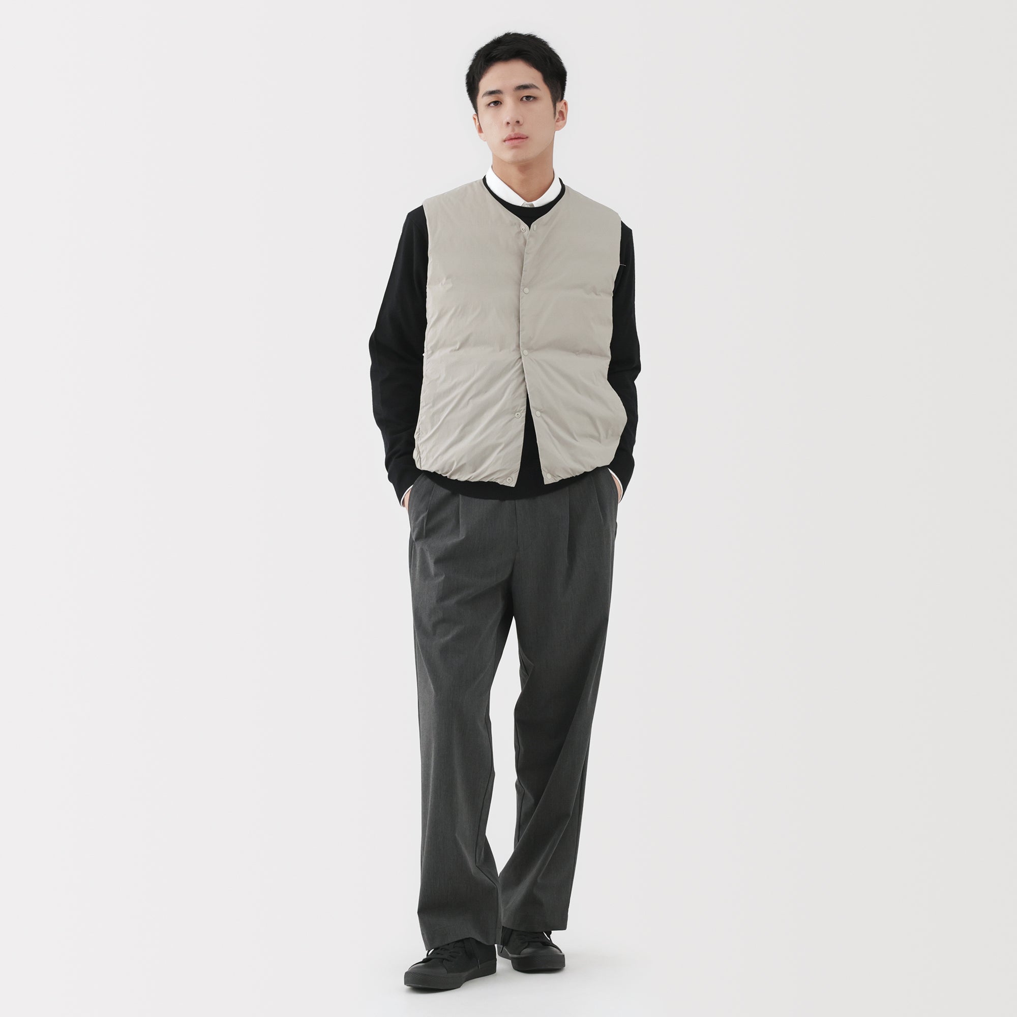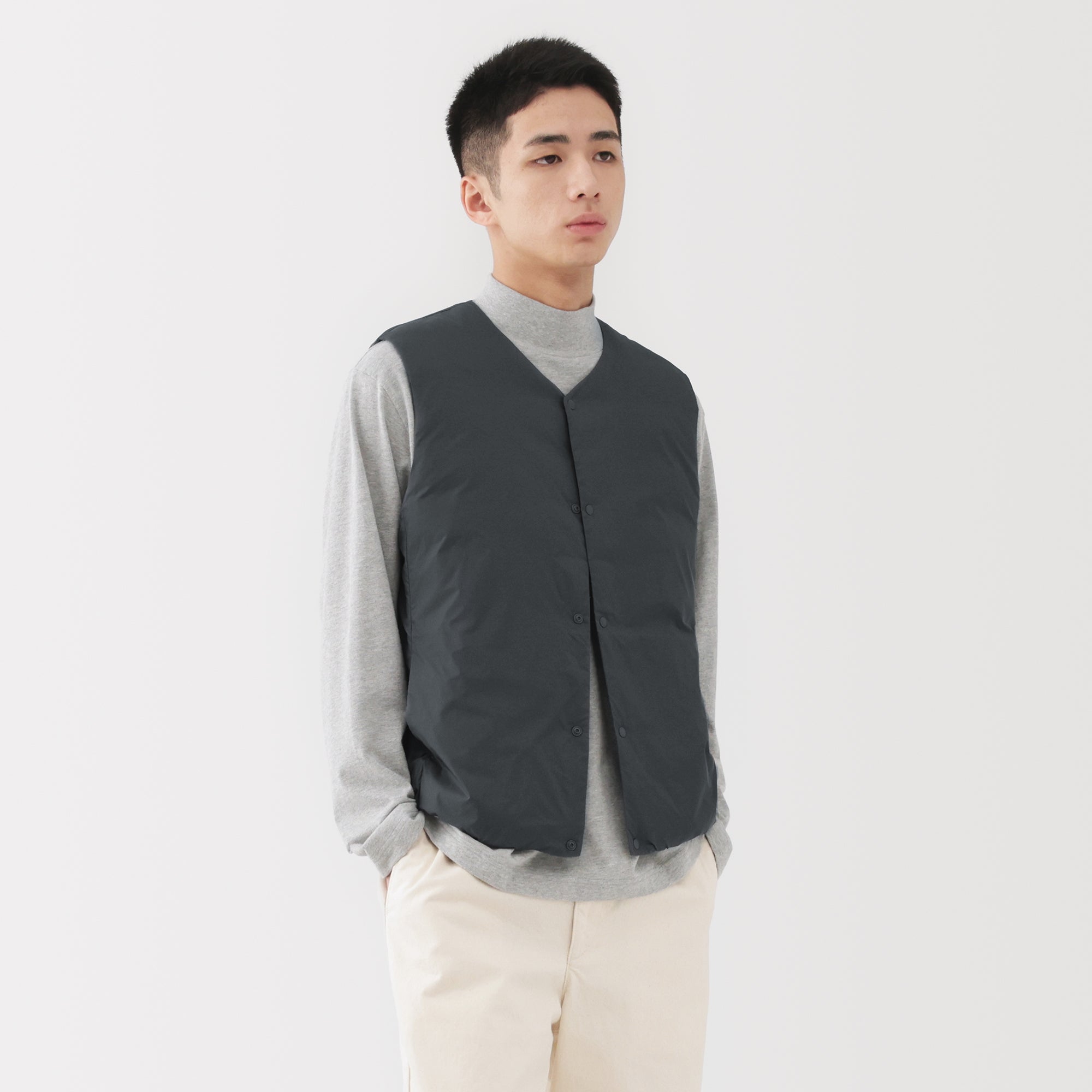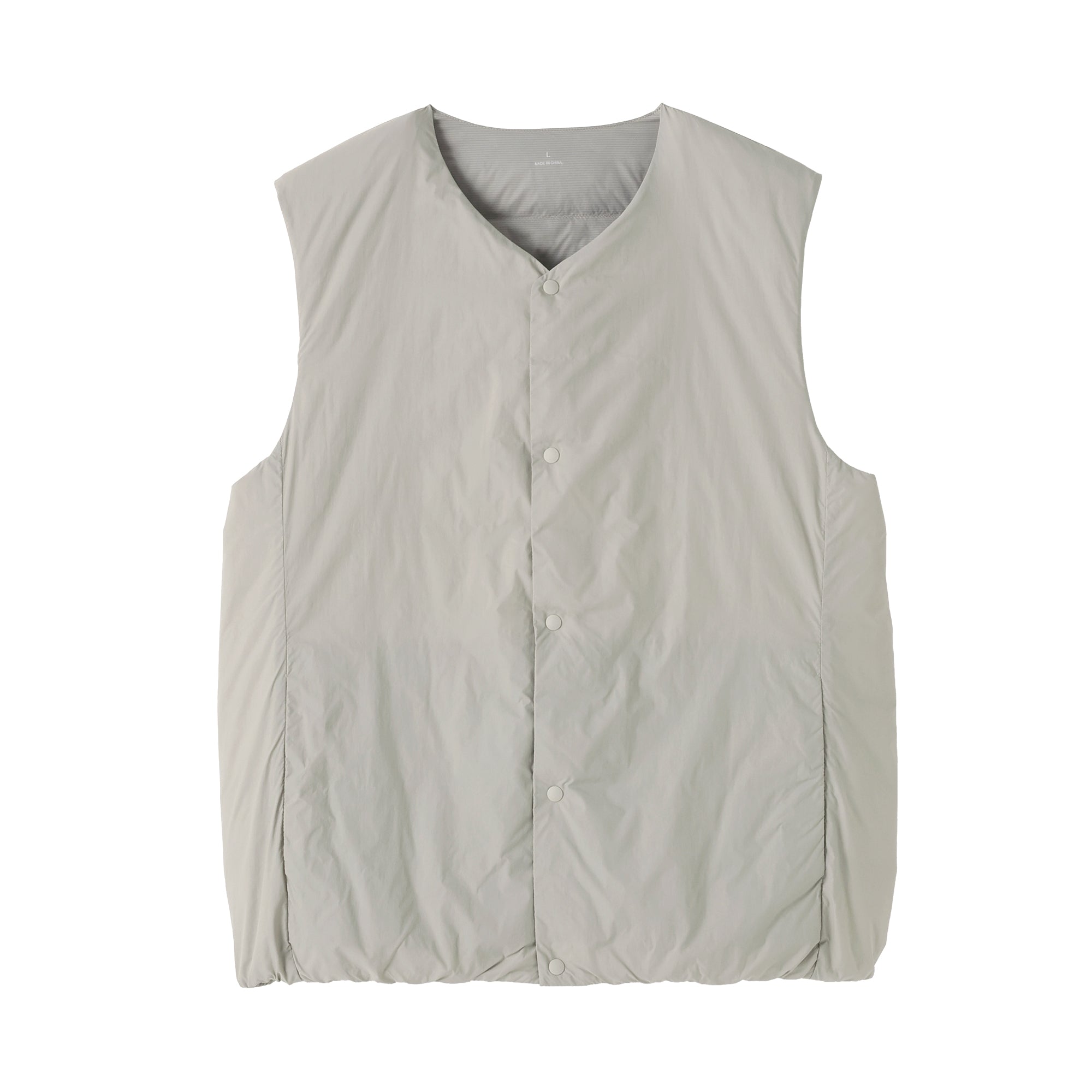 A men’s lightweight down collarless vest made with recycled nylon fabric and fill power 750 down. Designed to be foldable and easy to carry. Thick and light enough to be layered in the winter.