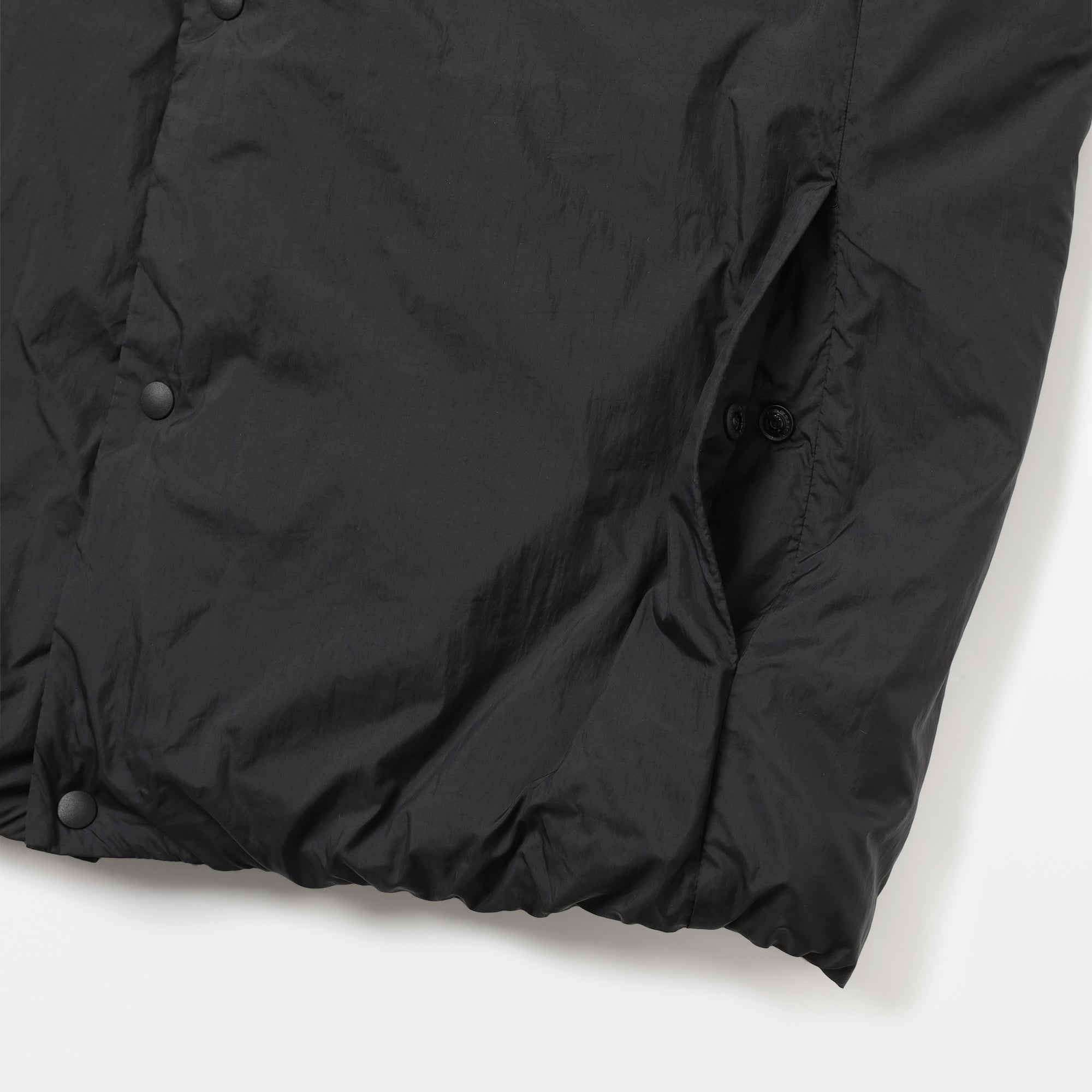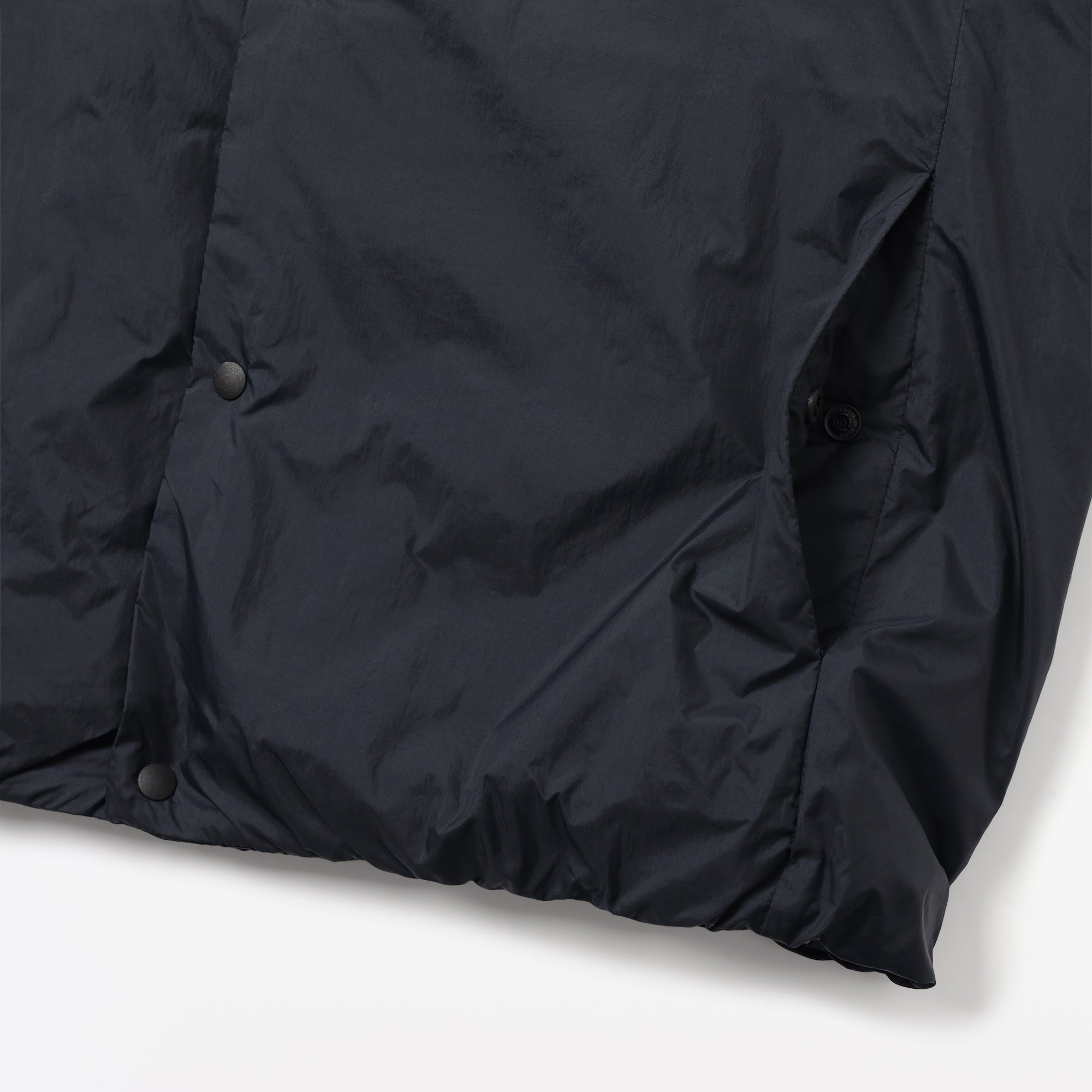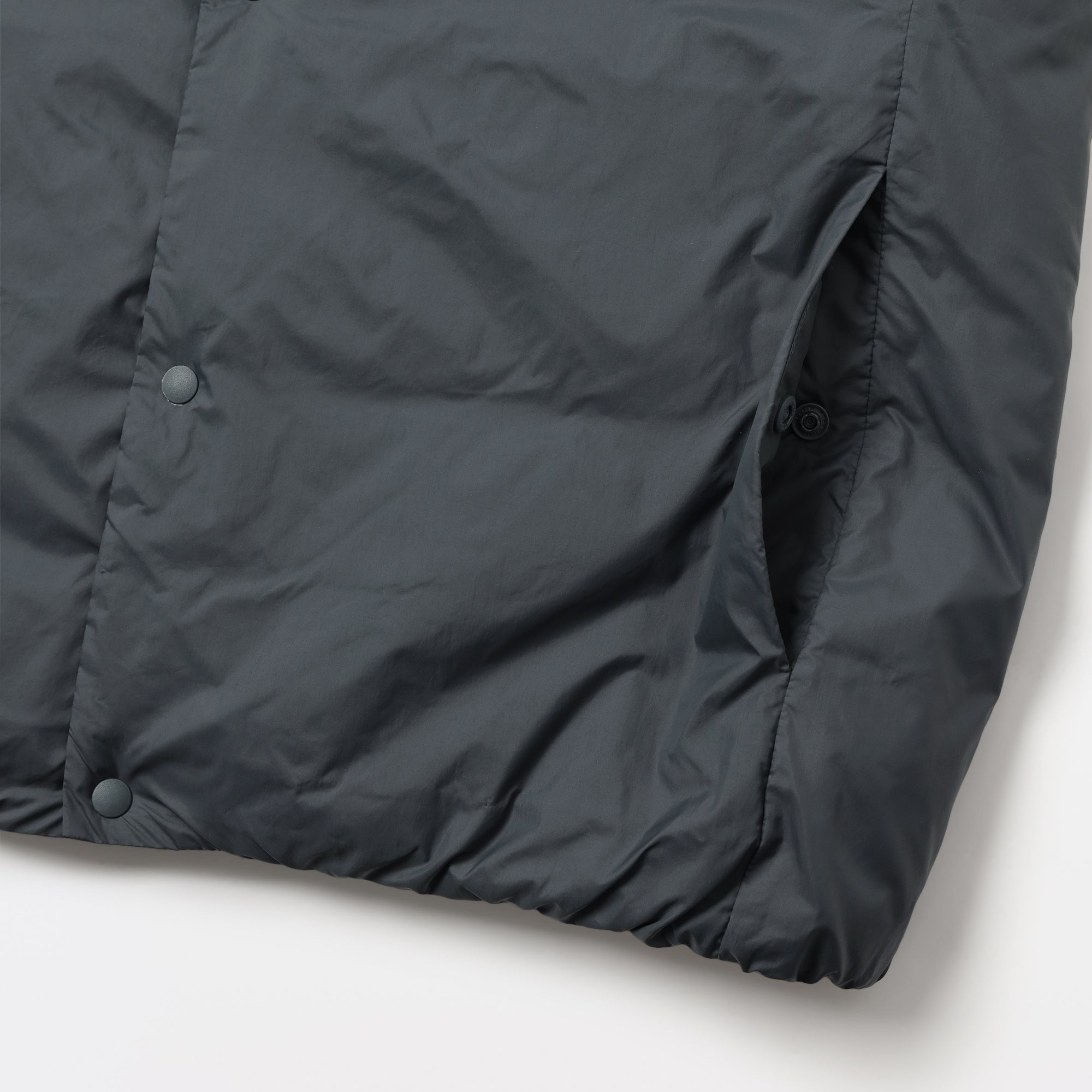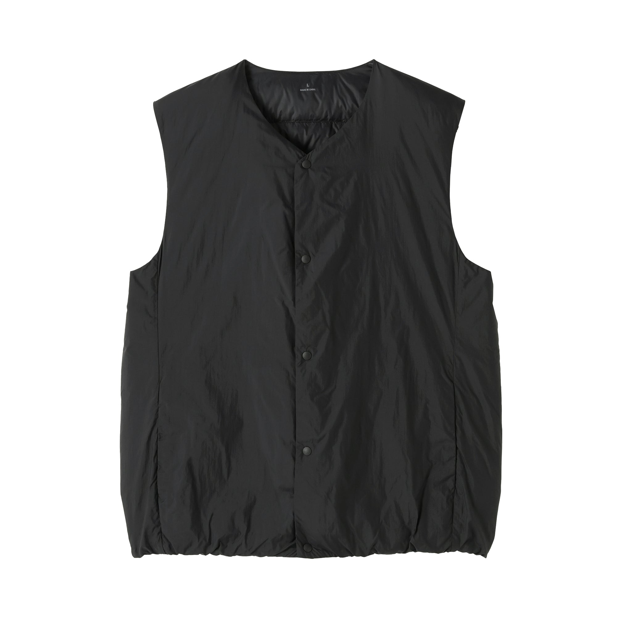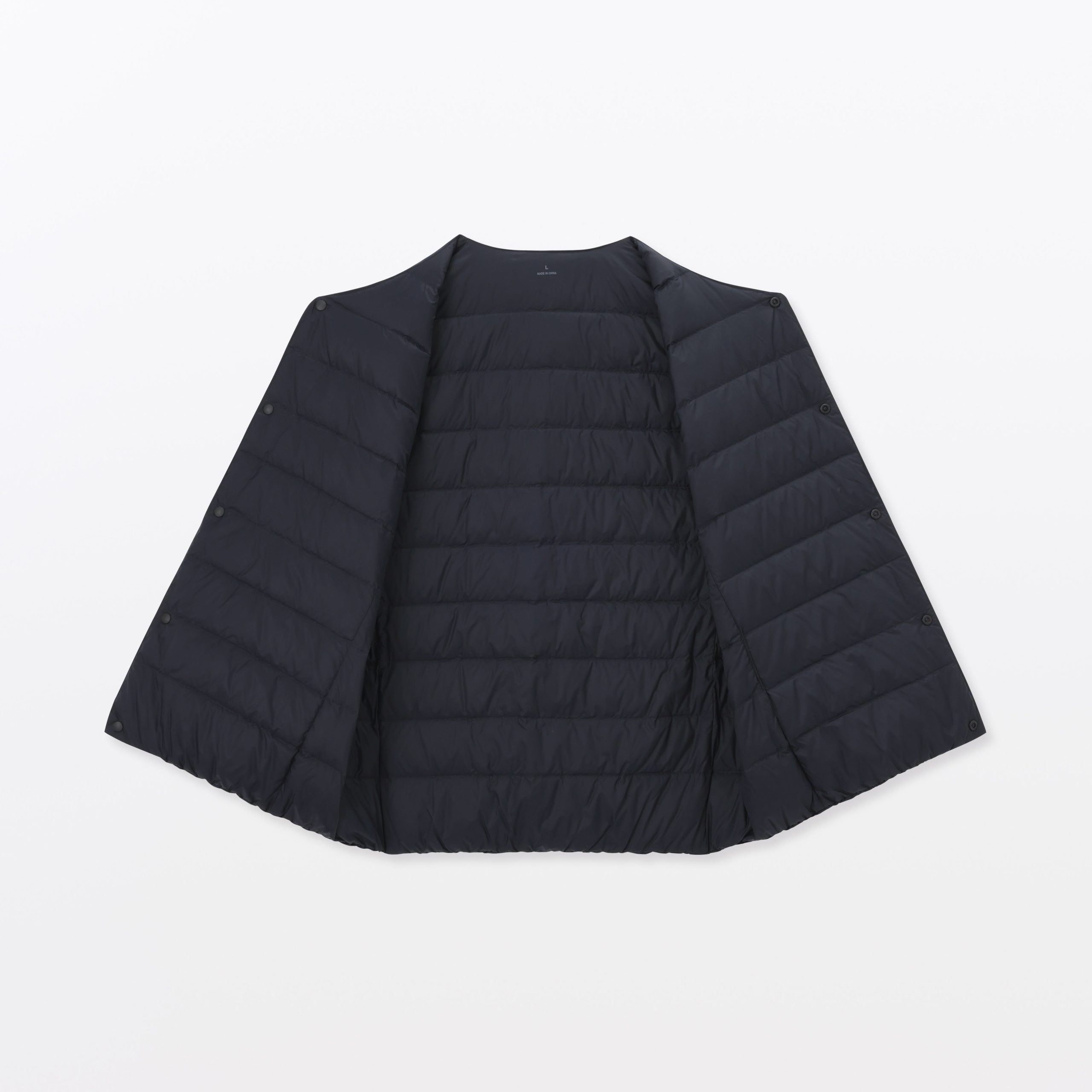 A men’s lightweight down collarless vest made with recycled nylon fabric and fill power 750 down. Designed to be foldable and easy to carry. Thick and light enough to be layered in the winter.