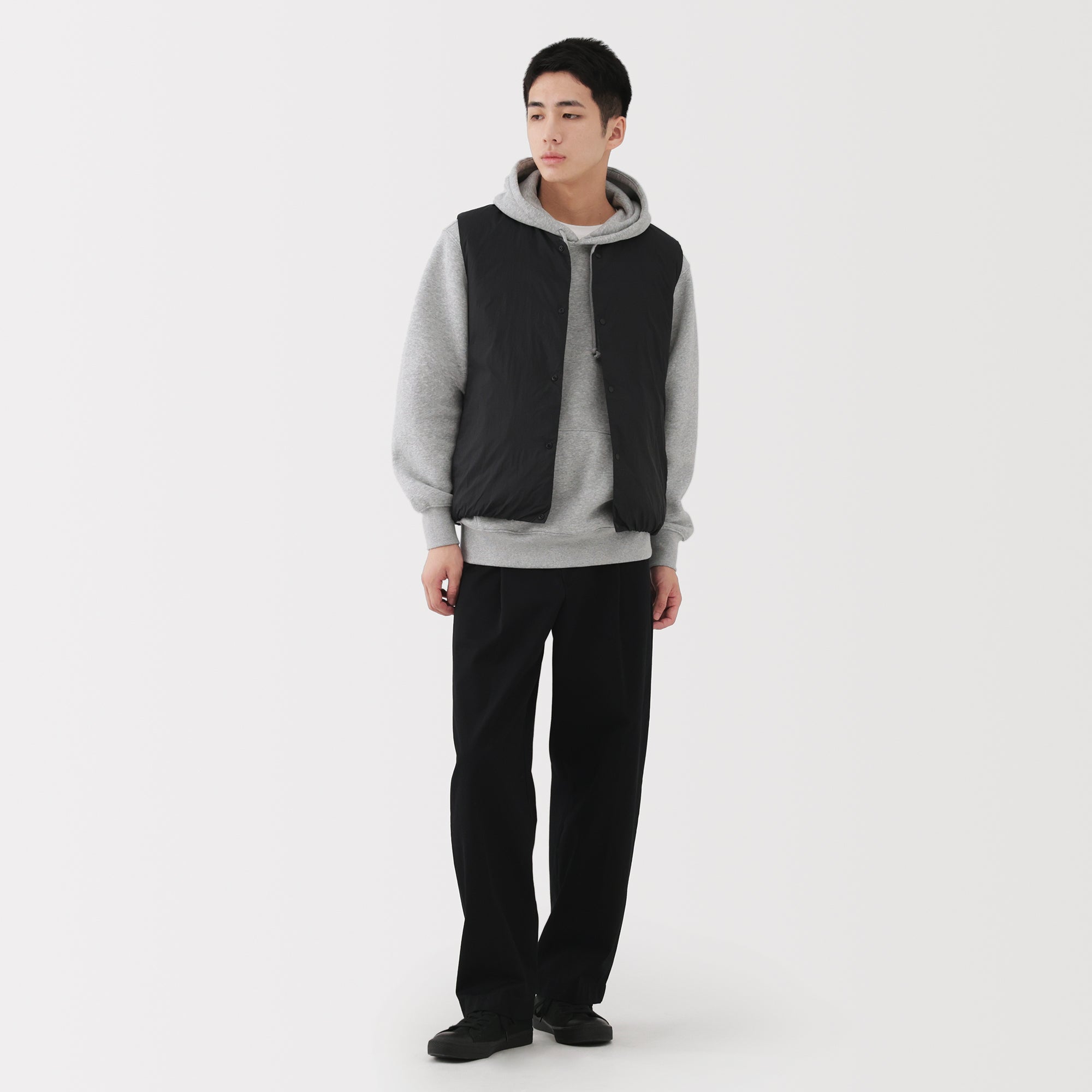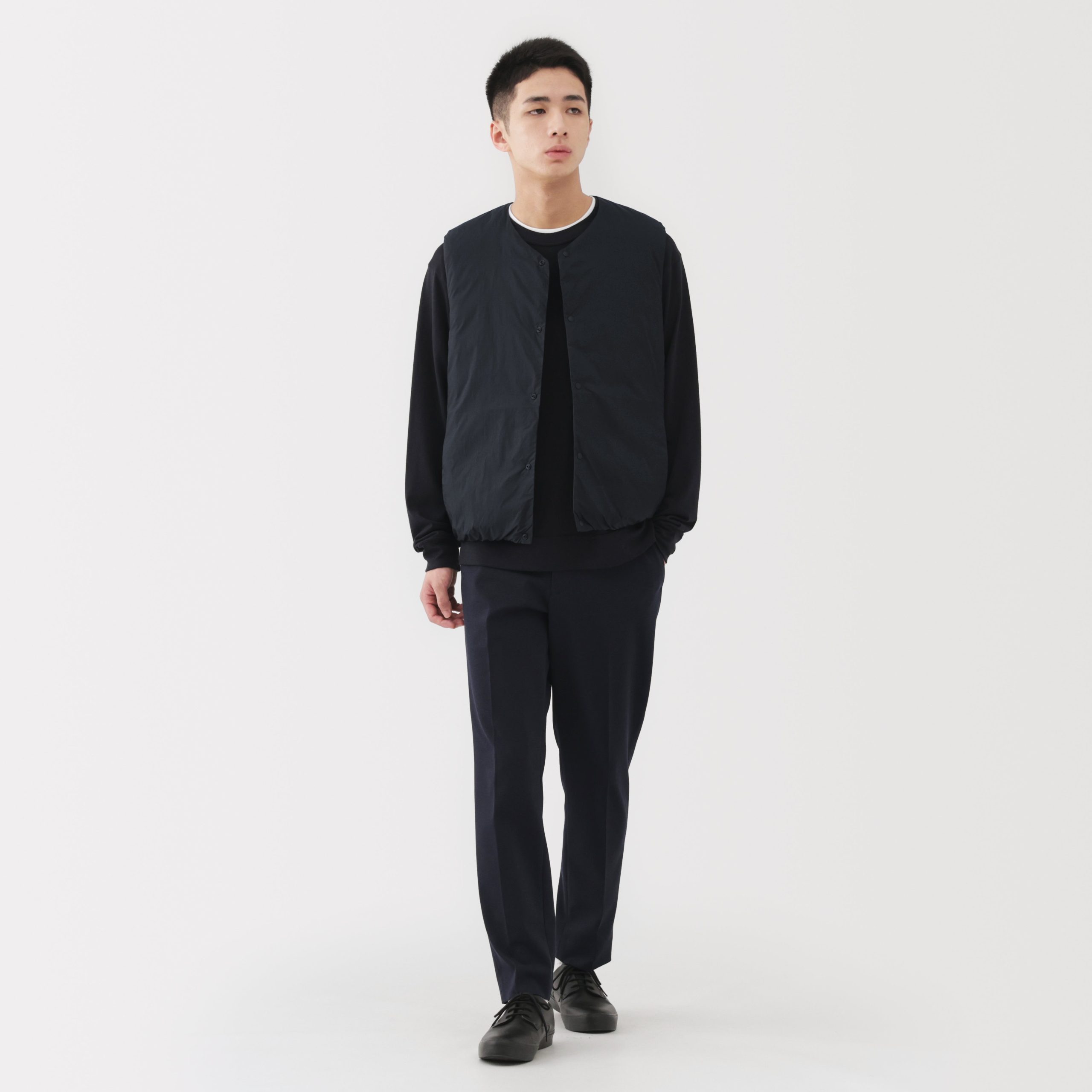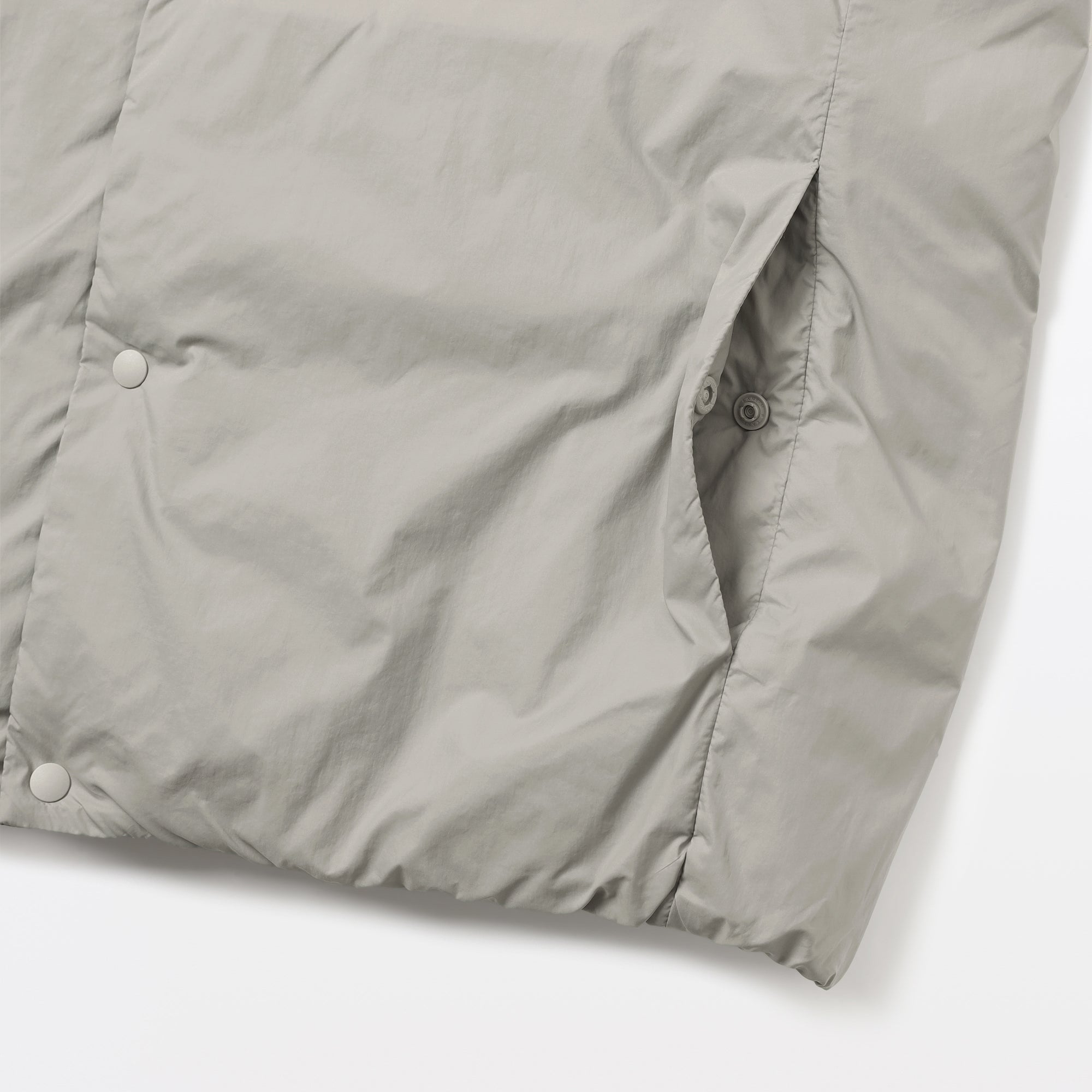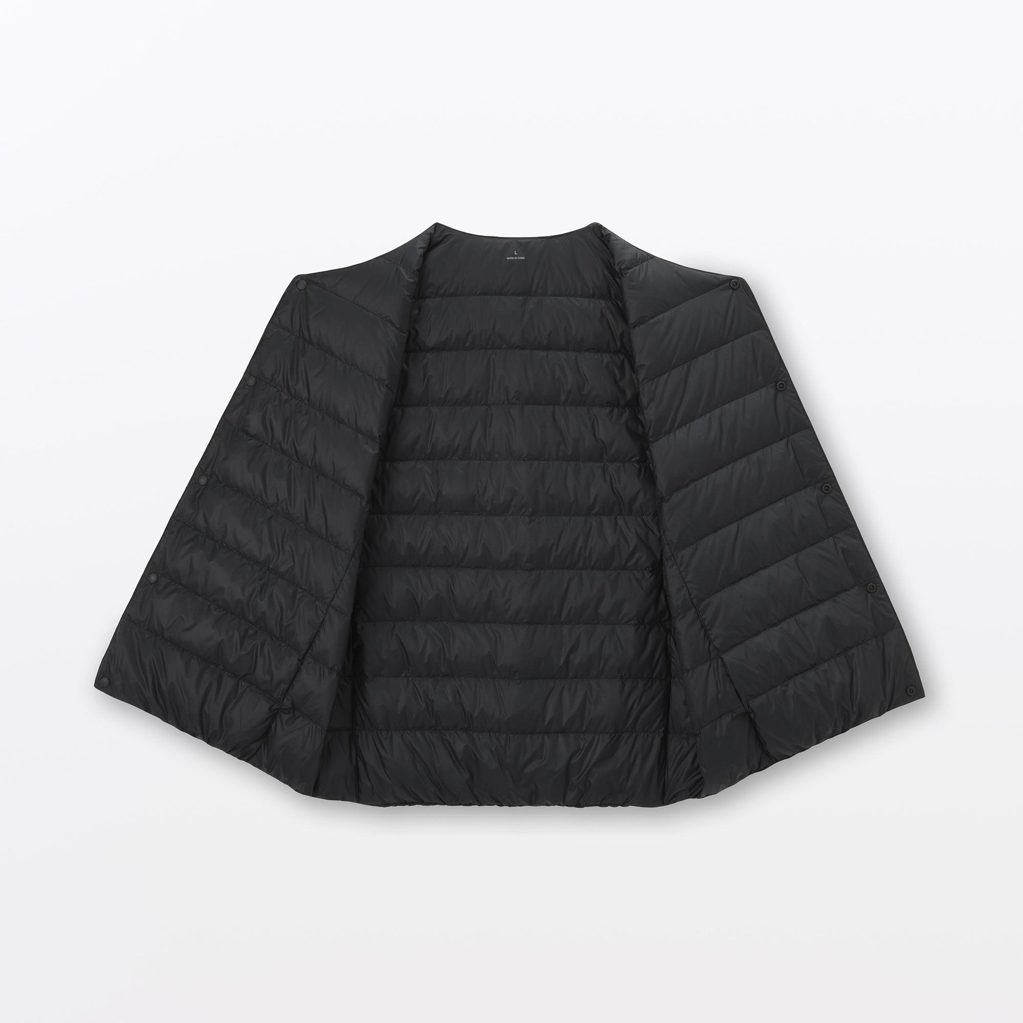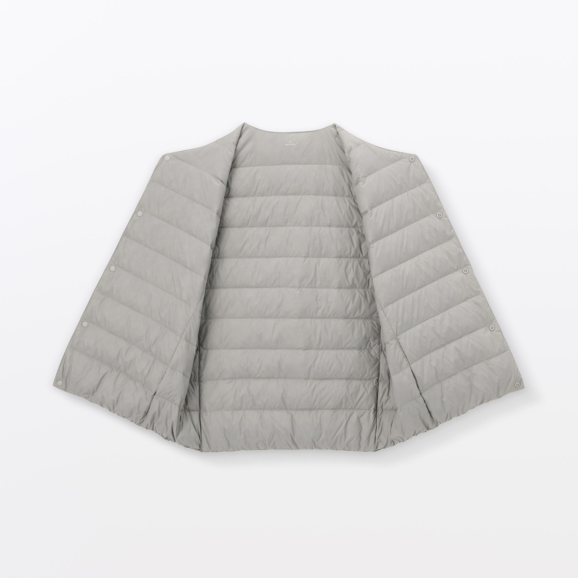 A men’s lightweight down collarless vest made with recycled nylon fabric and fill power 750 down. Designed to be foldable and easy to carry. Thick and light enough to be layered in the winter.