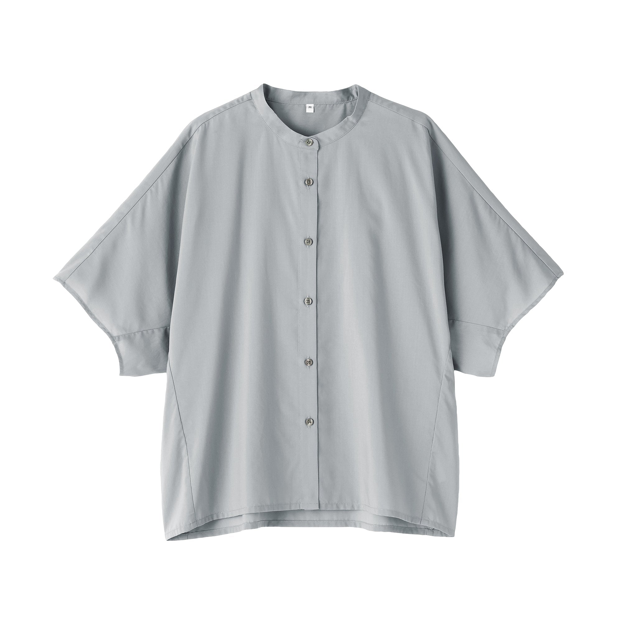 Made using recycled natural fibres. this button-up blouse is lightweight and smooth. It features loose dolman sleeves and a relaxed. feminine silhouette that is comfortable to wear.