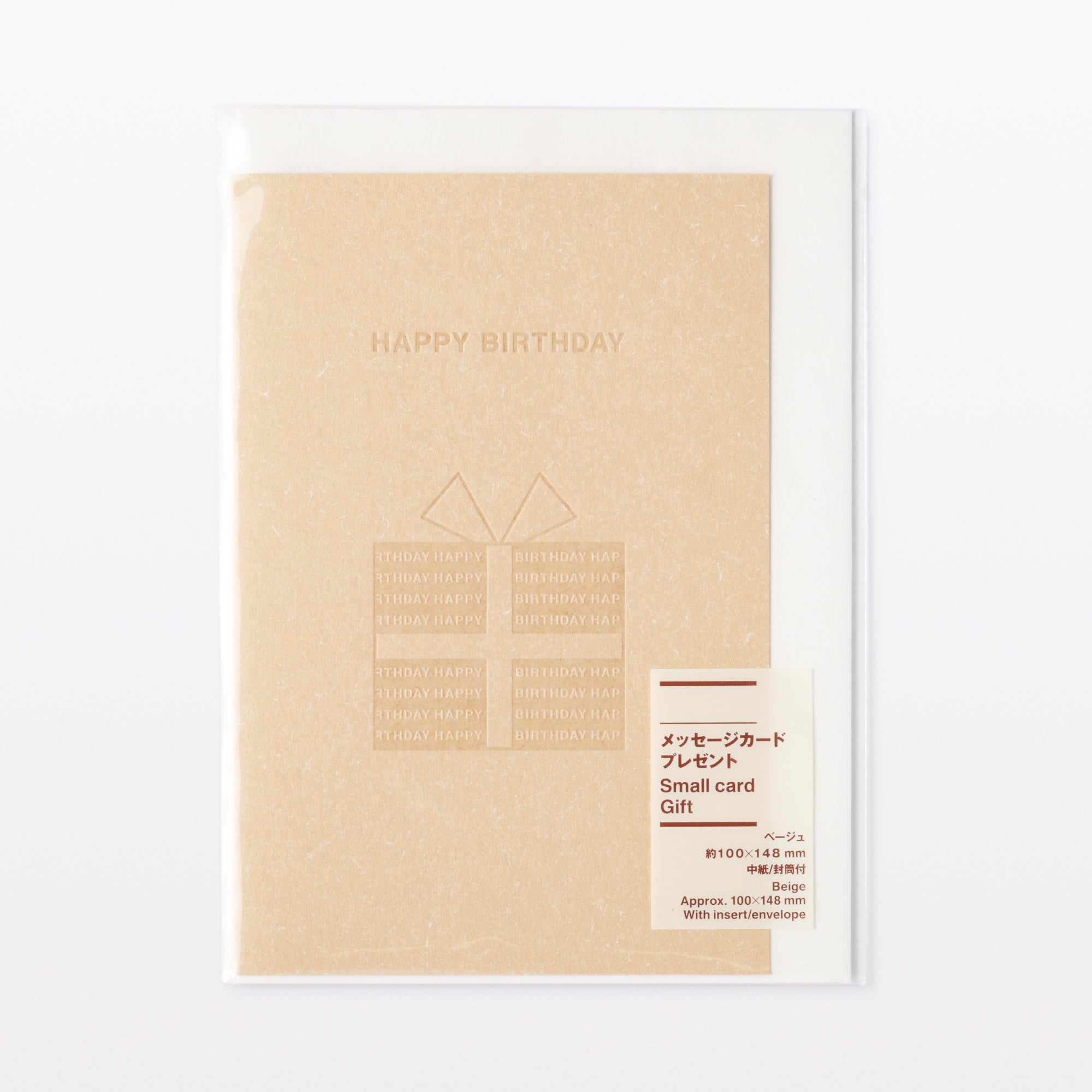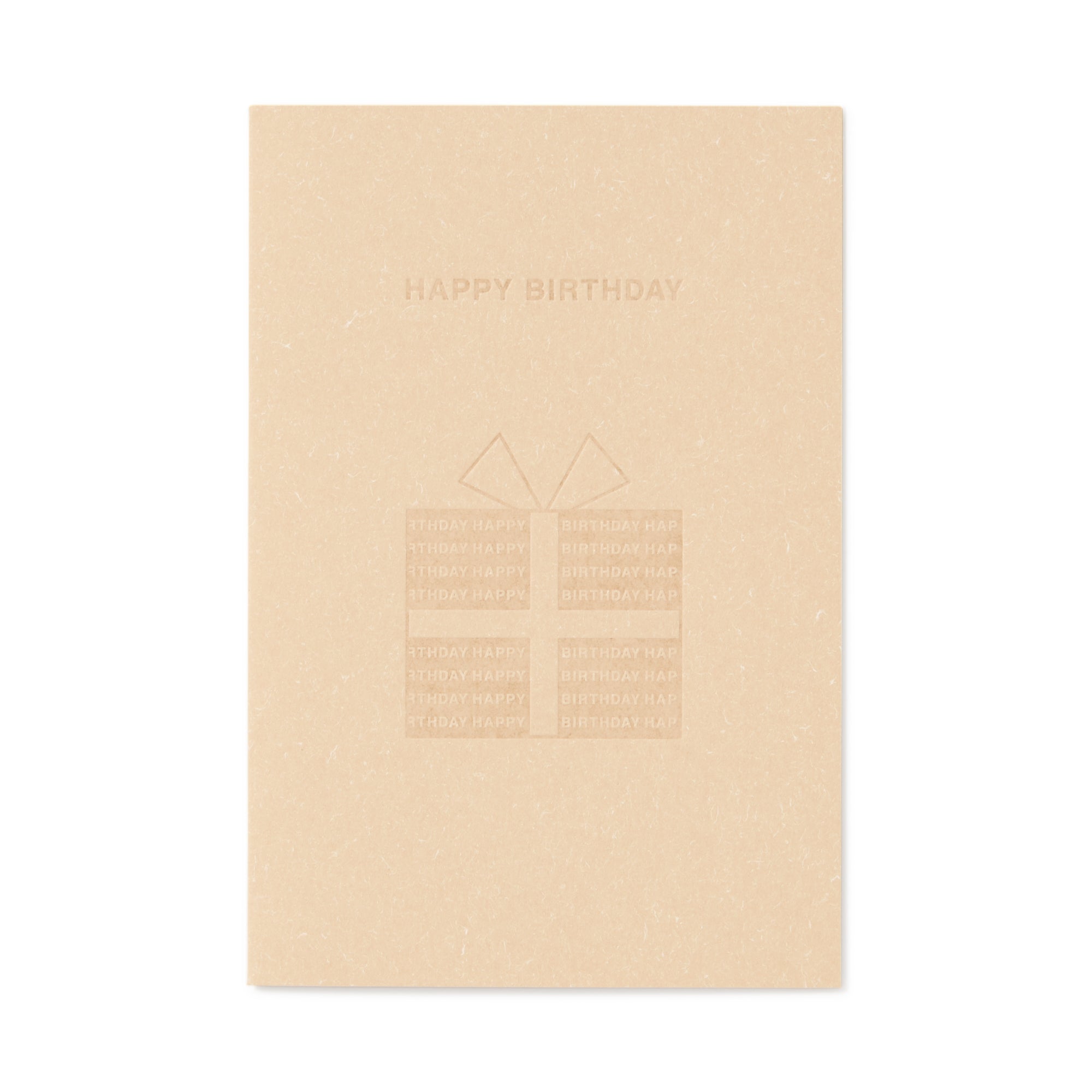 A folded message card featuring a debossed wrapped gift box with HAPPY BIRTHDAY written on it. The inside of the card is blank. so you’re able to decorate it freely. Includes an envelope for the card.