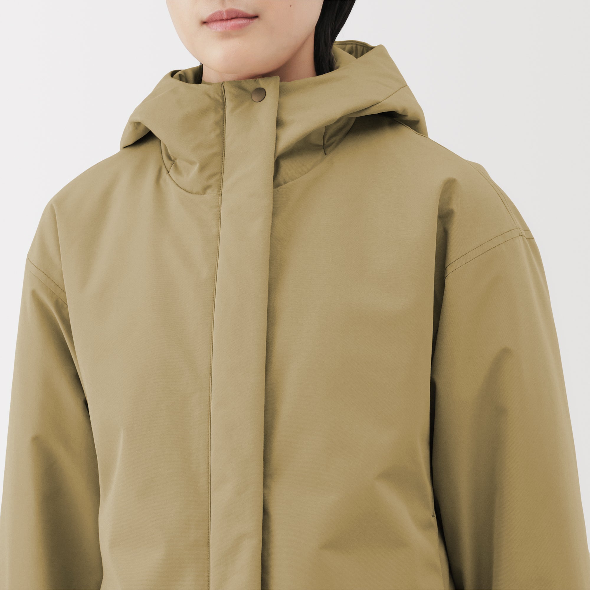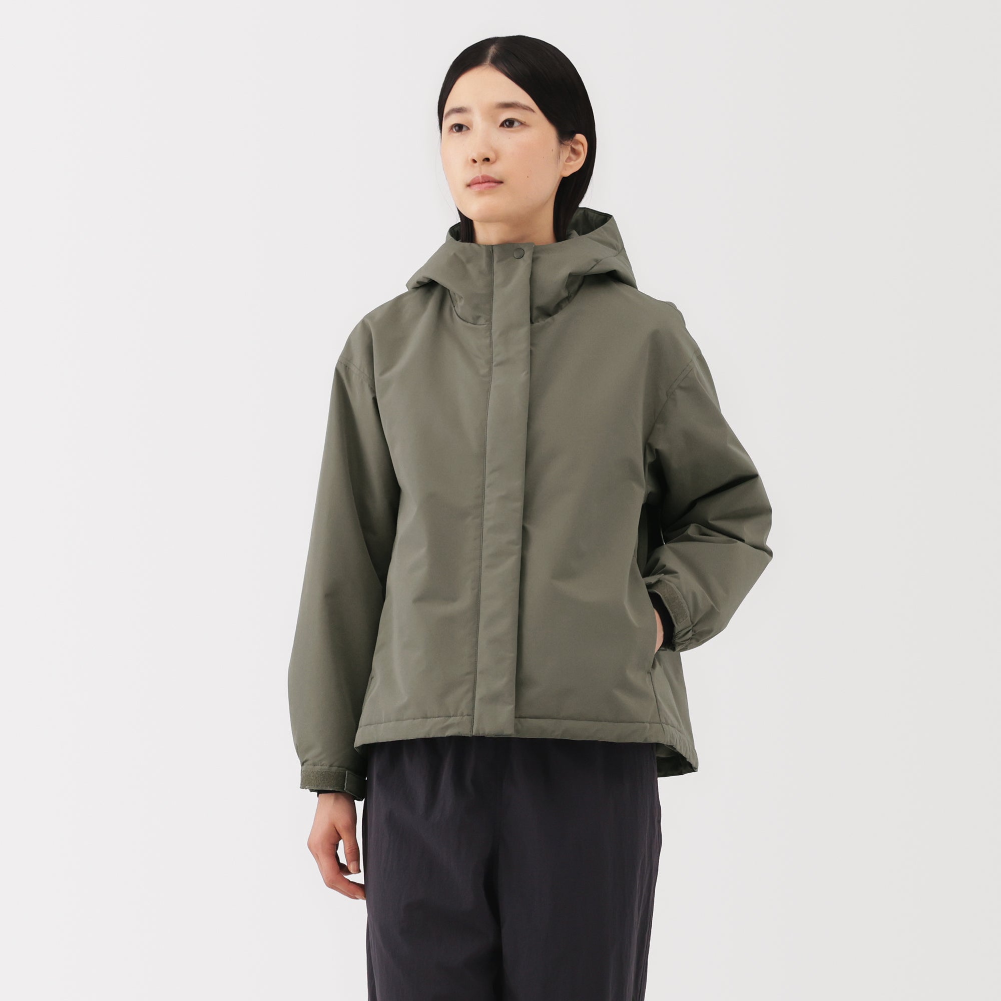 A women’s water repellent padded jacket with a hood that will keep you warm and dry in the winter. Uses recycled polyester.