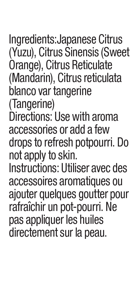 This essential oil is a blend of yuzu. sweet orange and tangerine. It is best used for reducing stress and anxiety. Use with aroma accessories or add a few drops to refresh potpourri.