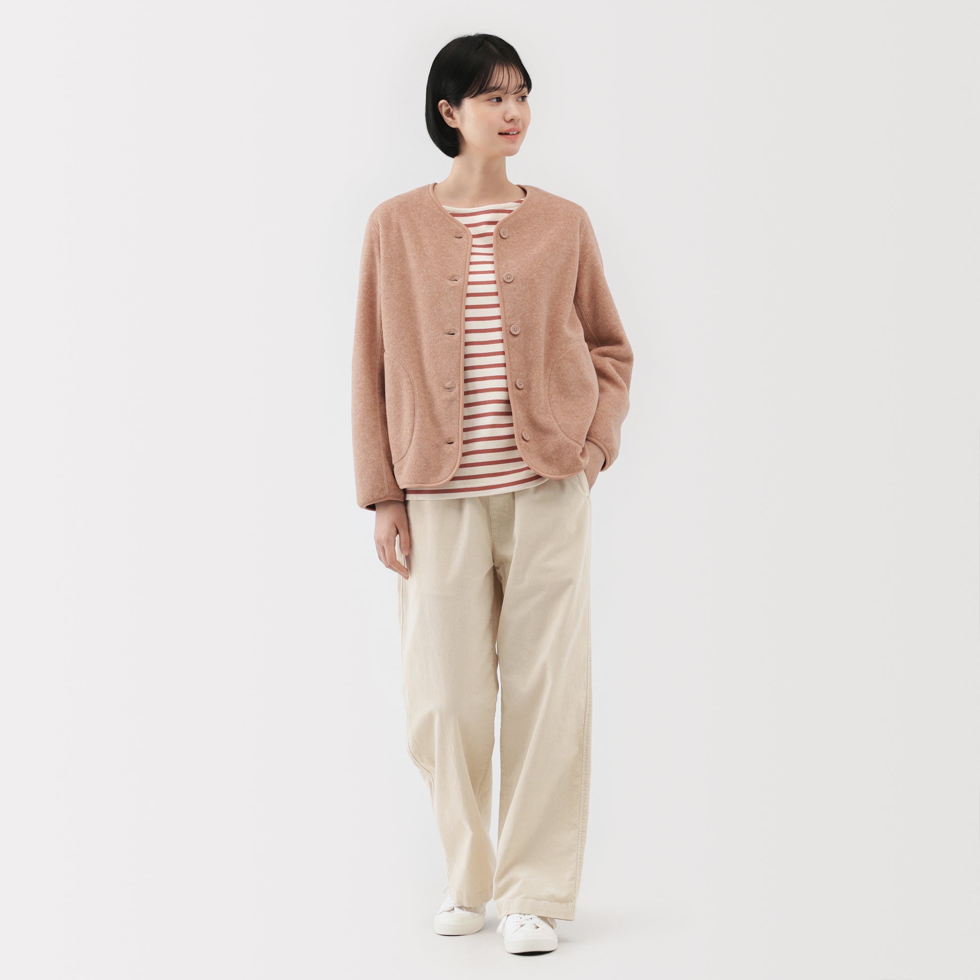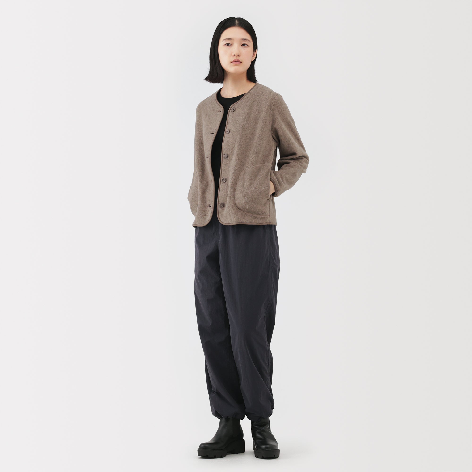 Designed for easy recycling as part of a resource-circulating initiative. all of the components. from the main fabric to accessories such as sewing thread and buttons. are made from the same recycled polyester material. This eliminates the need for complicated processes such as disassembly and material sorting during recycling.