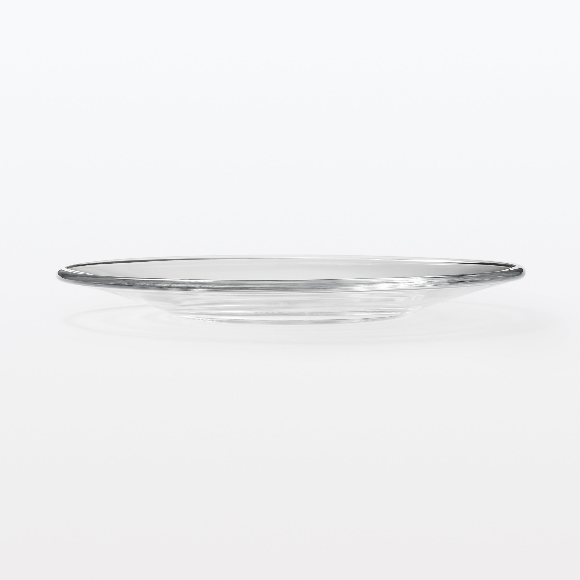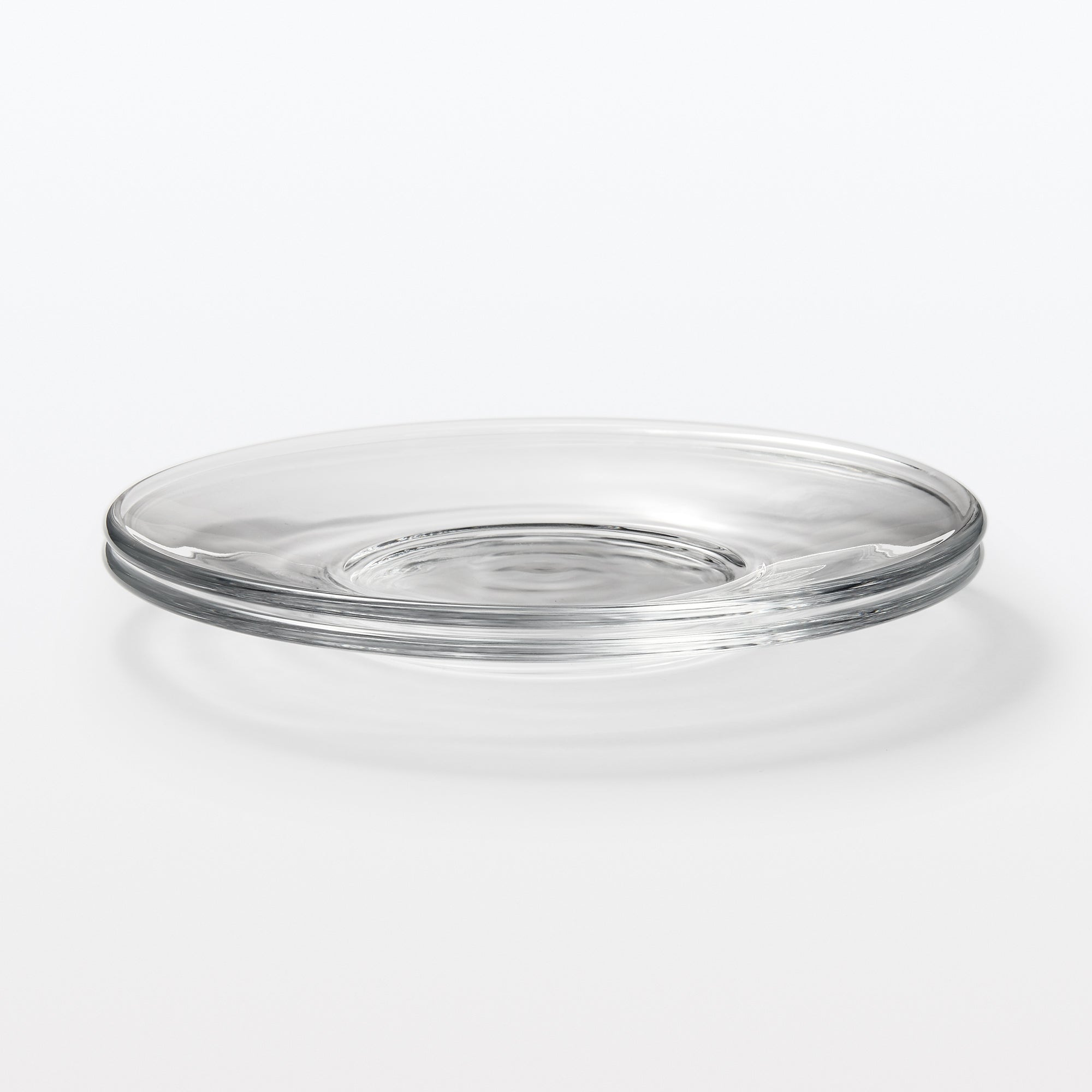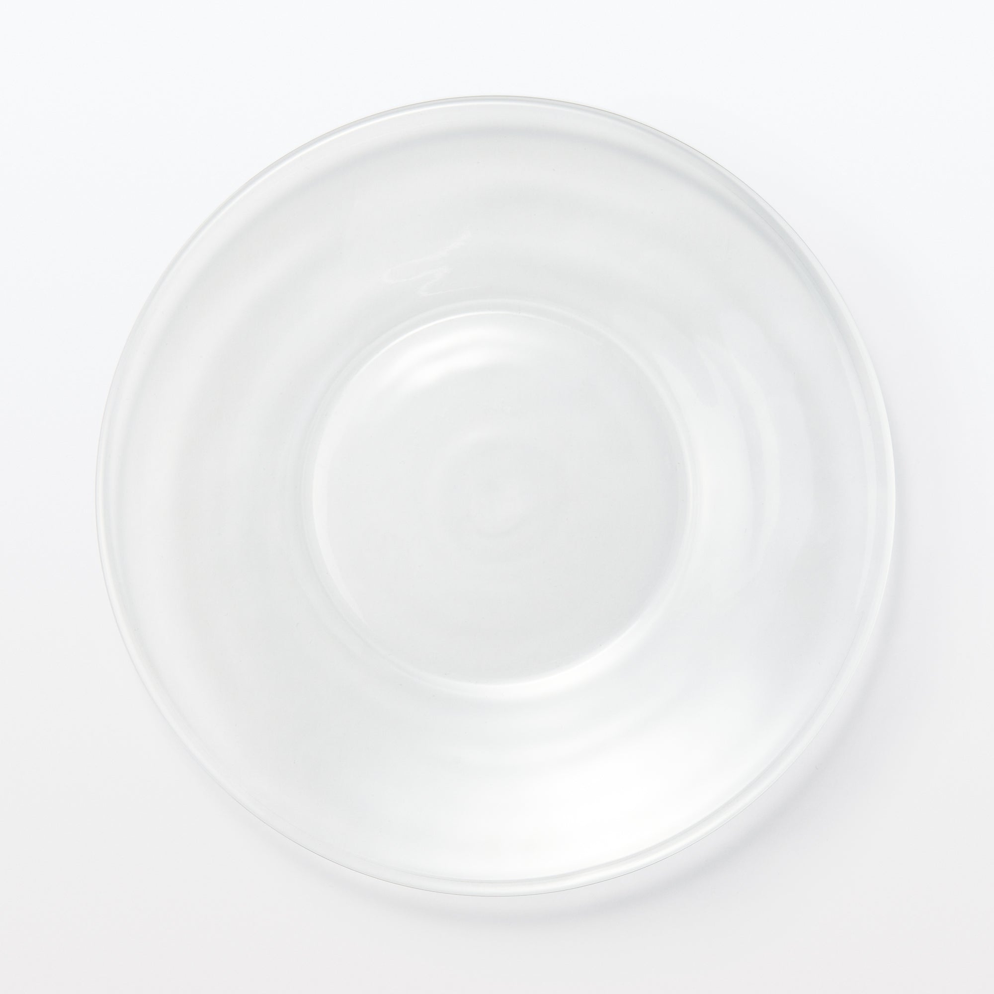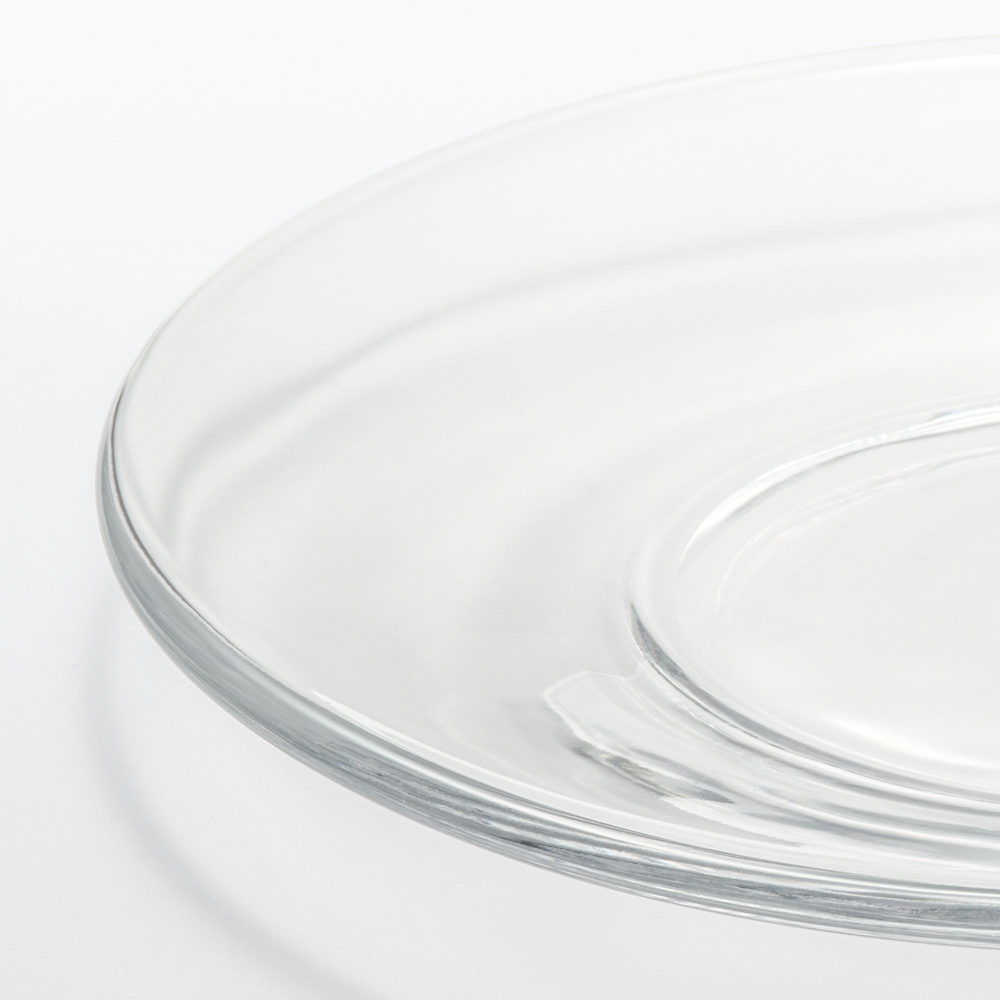 A transparent plate made from soda glass. It’s wavy surface texture is reminiscent of hand blown glass.