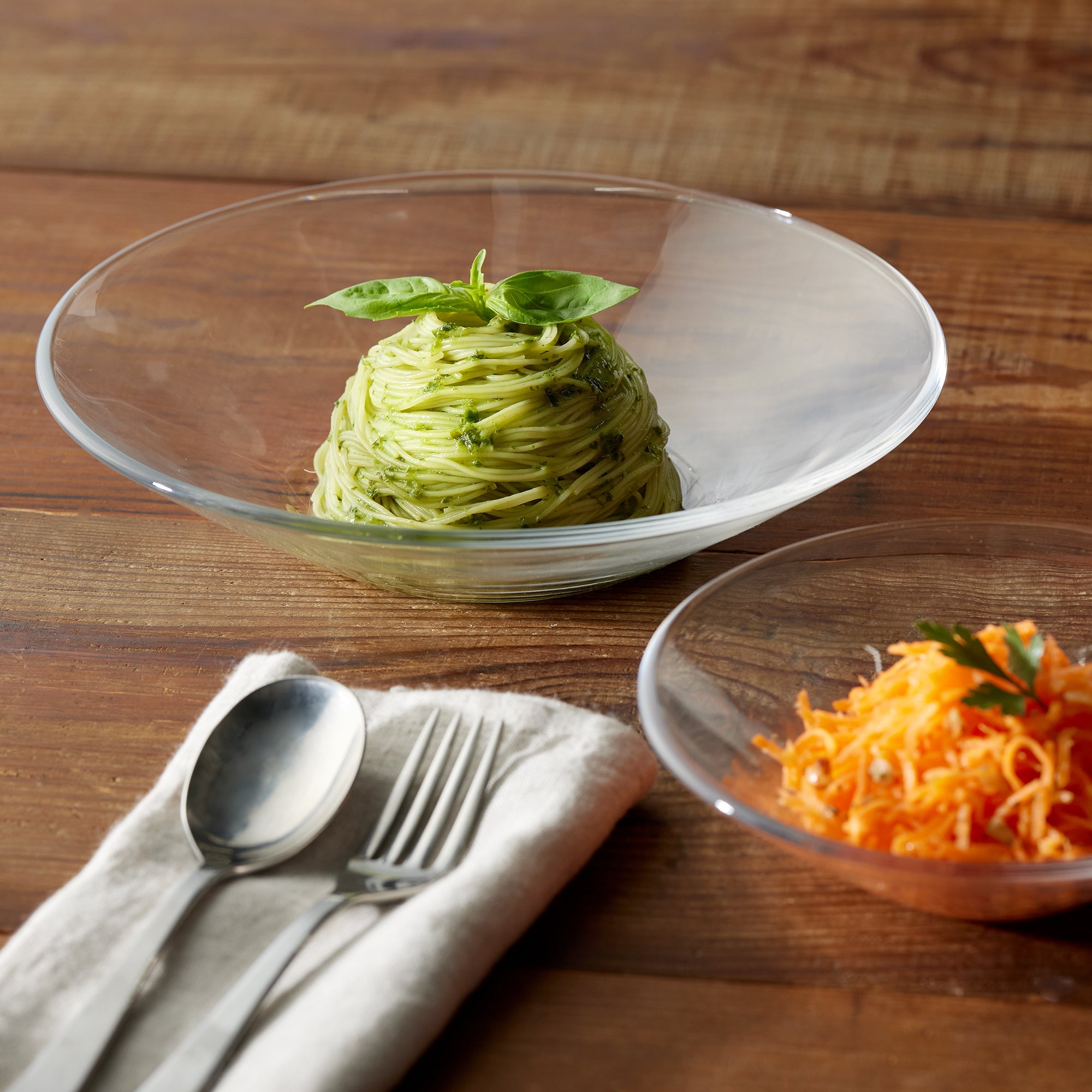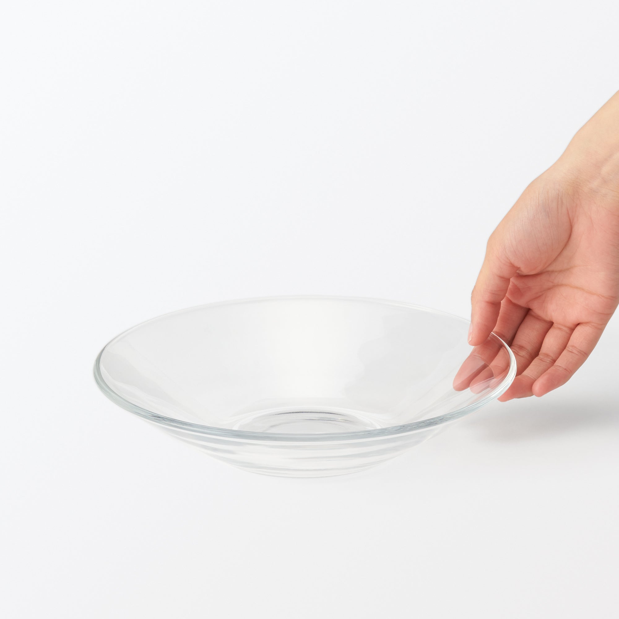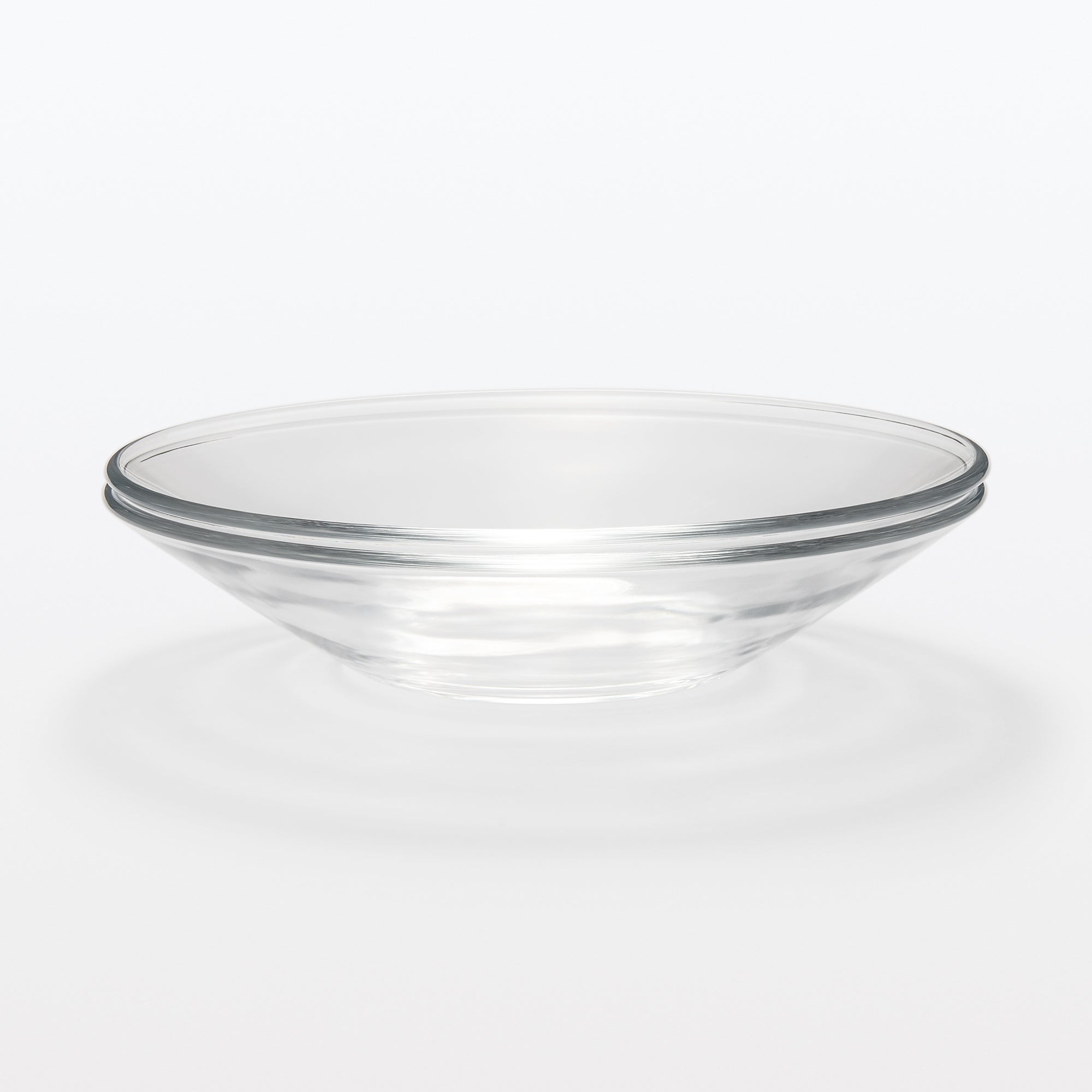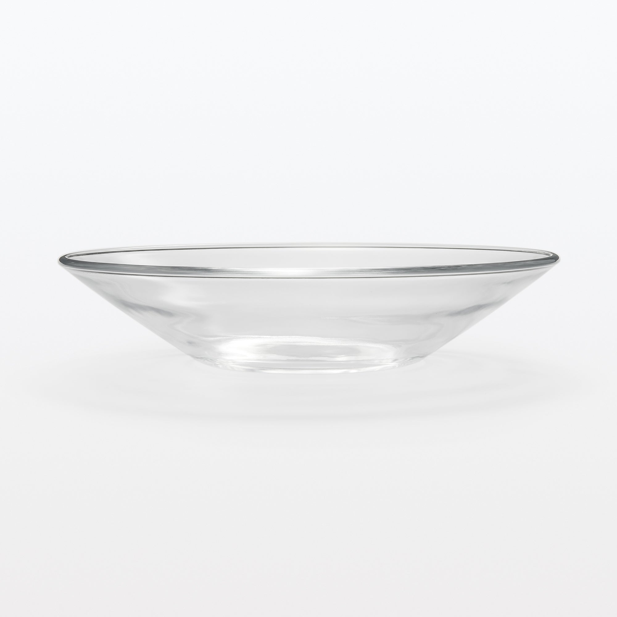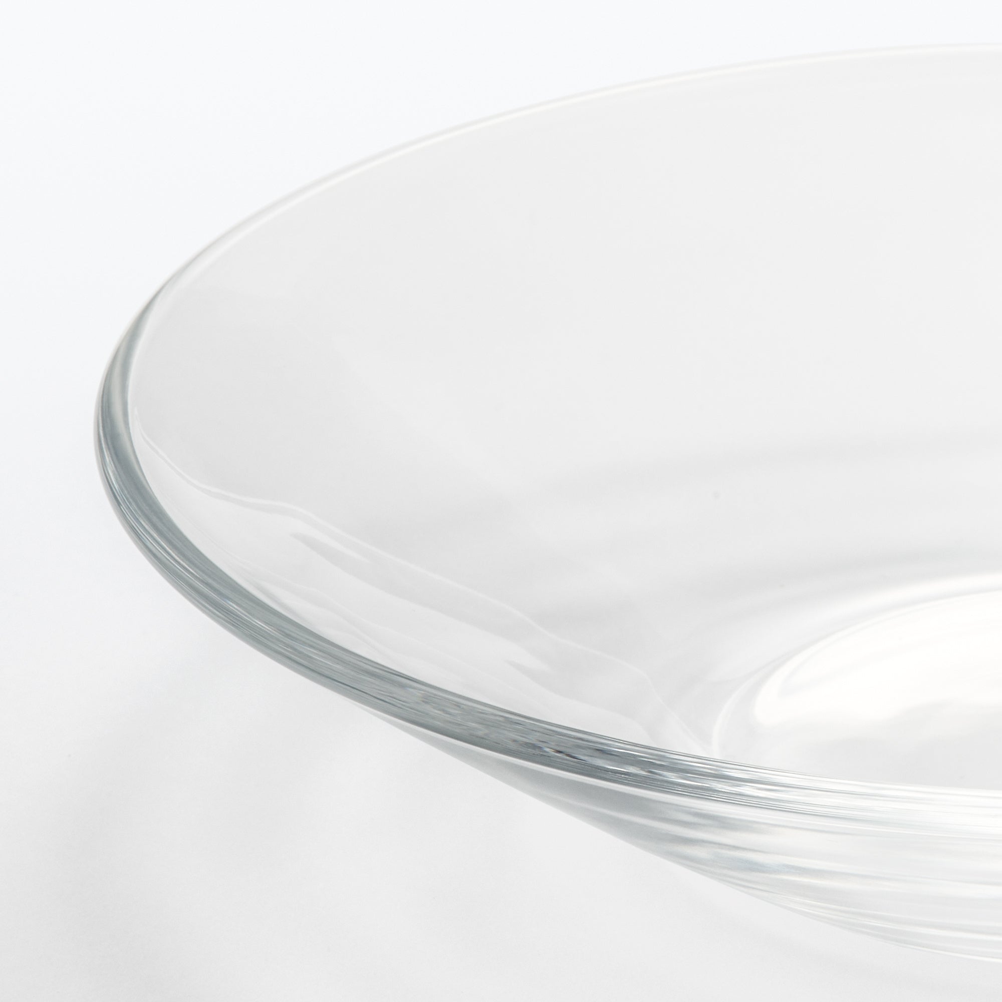 A transparent bowl made from soda glass. It’s wavy surface texture is reminiscent of hand blown glass.