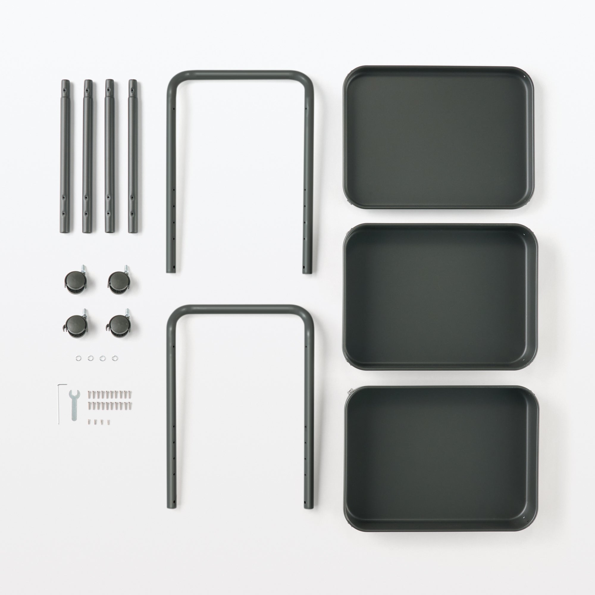 A simple wagon rack made using trays attached to a bent steel pipe. Recommended for use around the kitchen. desks. or storying children’s supplies. You can easily move it wherever you need it. so you can use it anywhere.