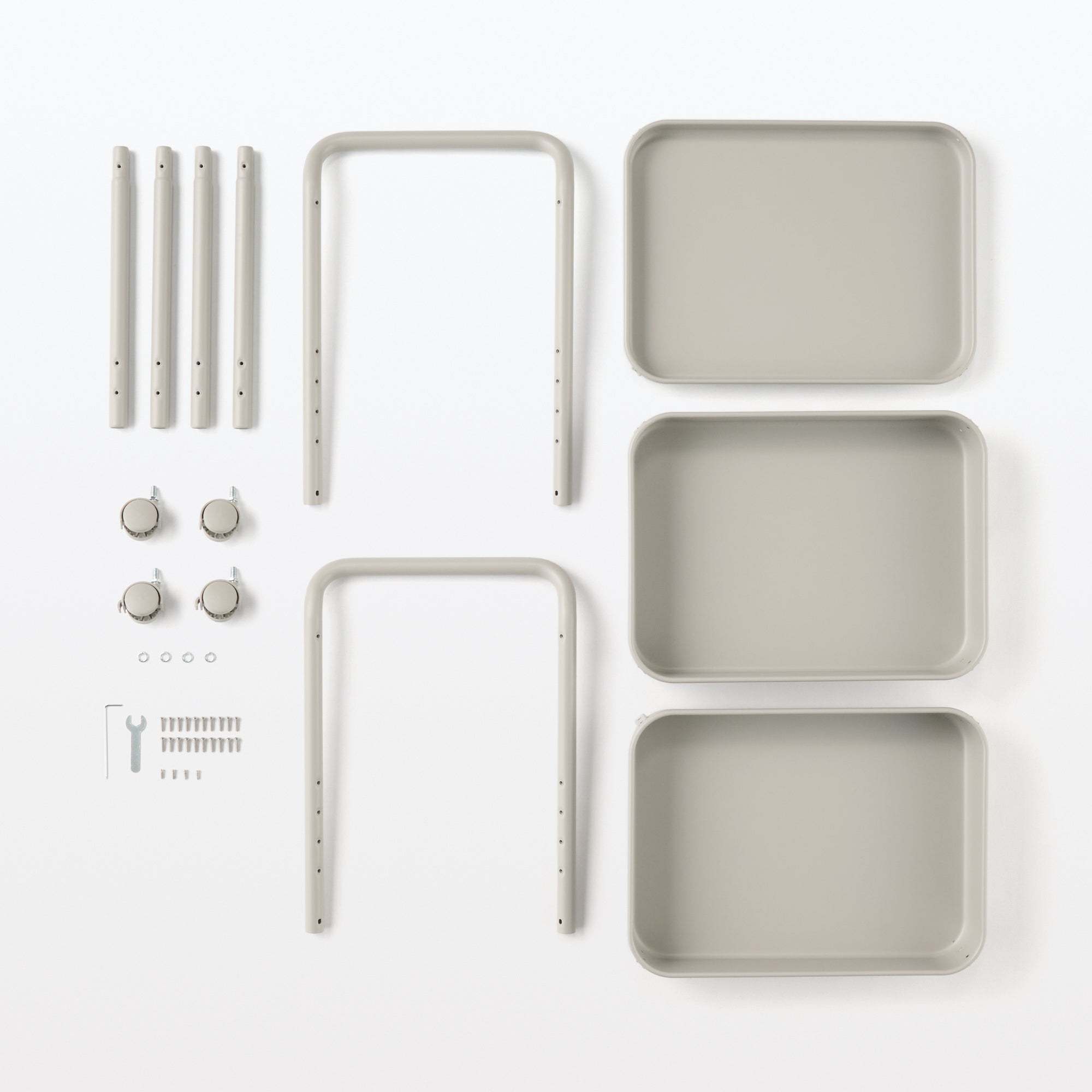 A simple wagon rack made using trays attached to a bent steel pipe. Recommended for use around the kitchen. desks. or storying children’s supplies. You can easily move it wherever you need it. so you can use it anywhere.
