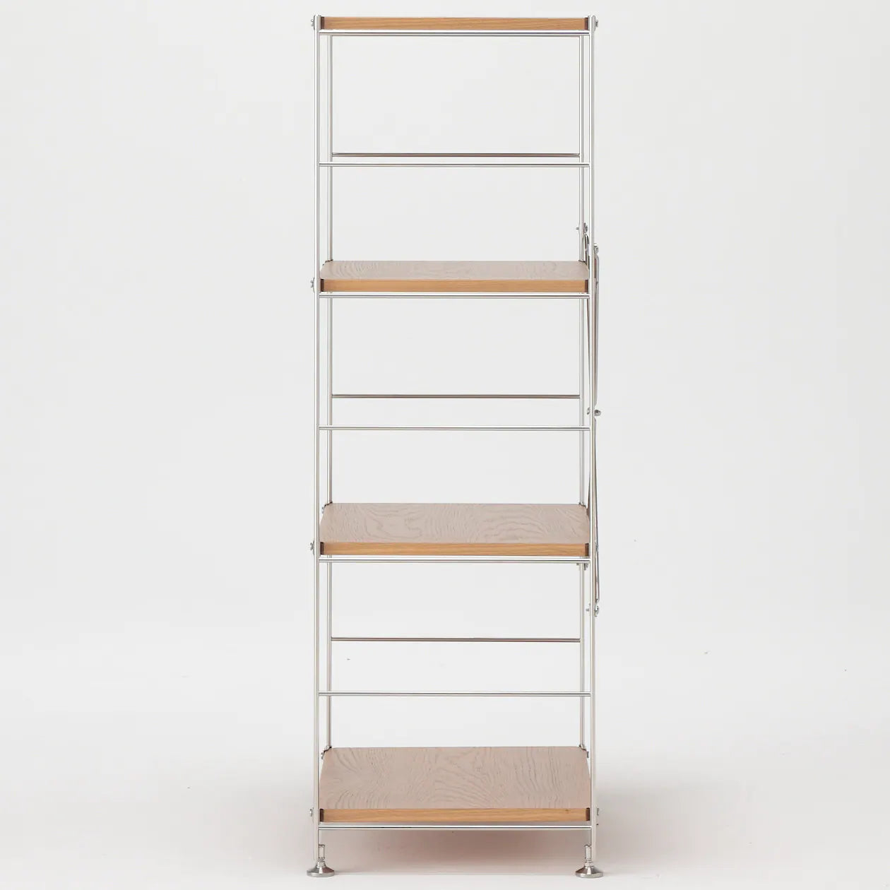 Each shelf is adjustable to the height of your need. Create an organized and stylish space with the SUS Shelving Unit. Made with a combination of wood and metal. it provides a strong and durable solution for all your storage needs.?