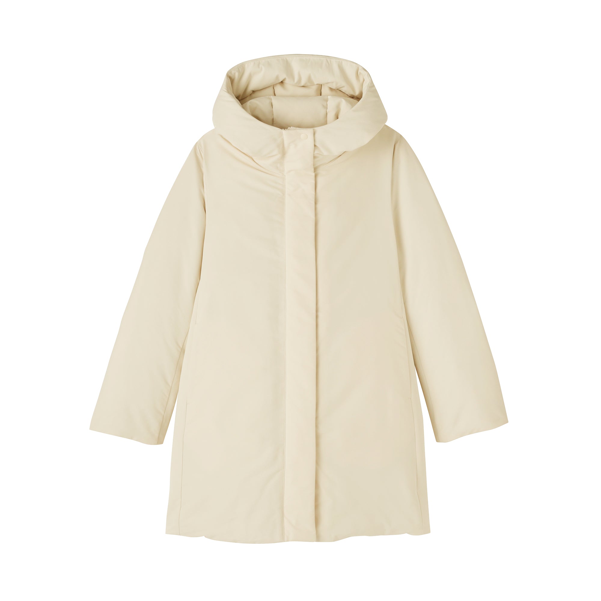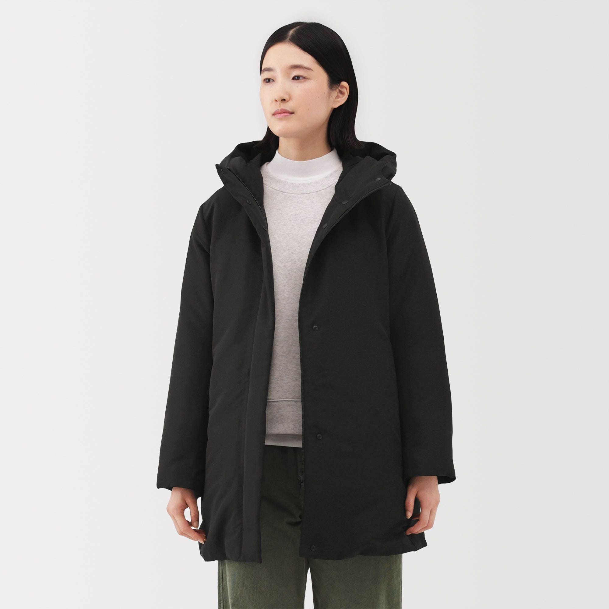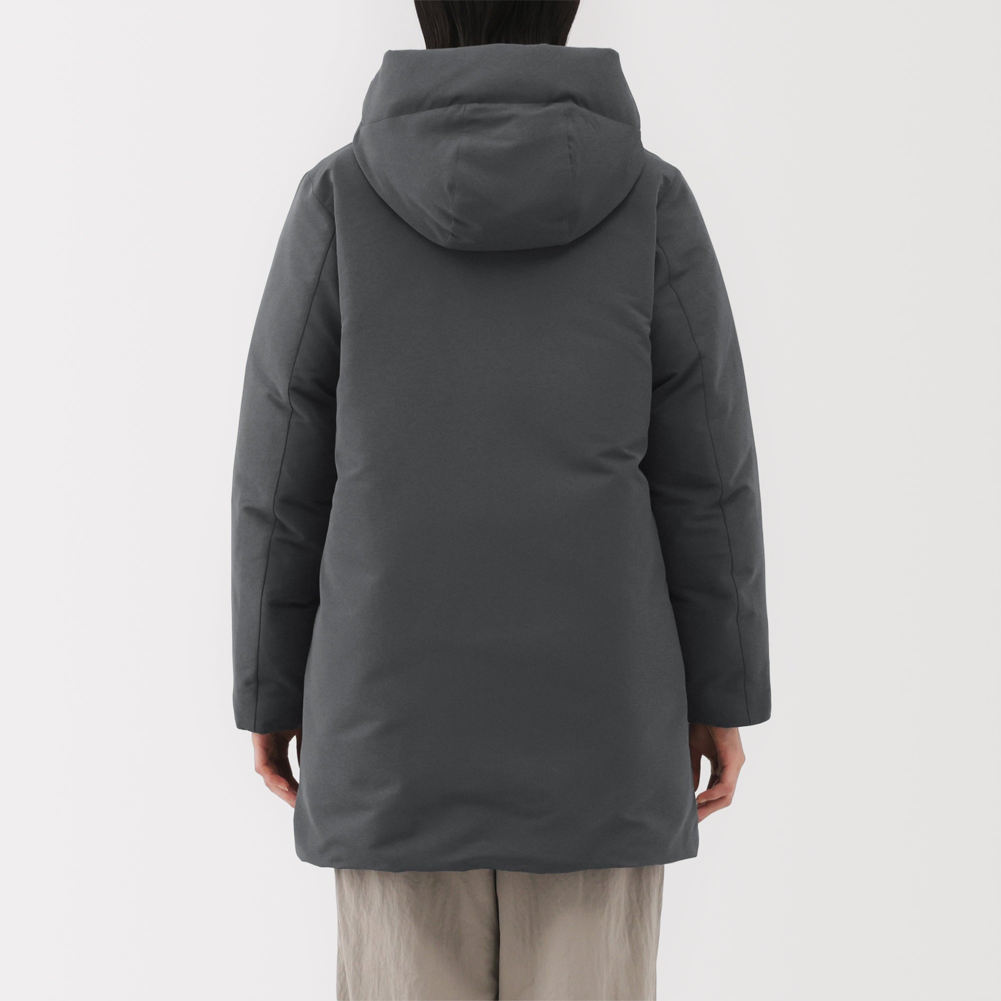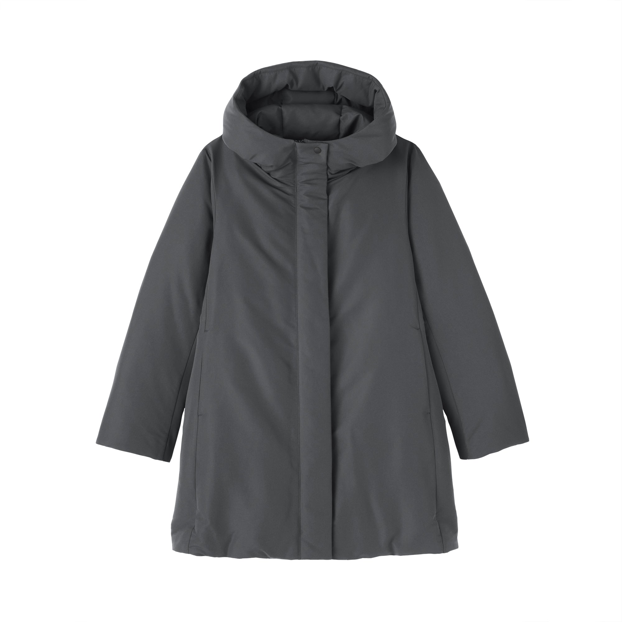 A fluffy women’s water-repellent down coat with fill power 750 down. Its mid-length design is easy to move in while also keeping you warm and cozy in the winter. This coat features a non-quilted outer fabric. giving it a more neat and polished look. Designed to protect you from the elements. with a front placket to hide the neck and elasticized cuffs to keep warmth inside. The pockets are lined with soft fleece to keep your hands warm.