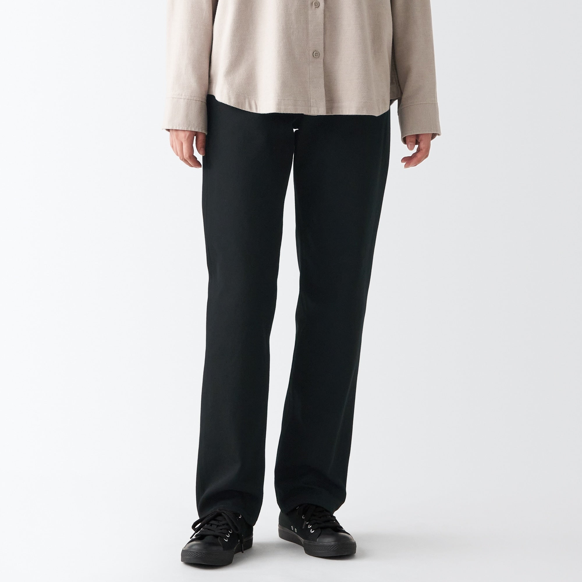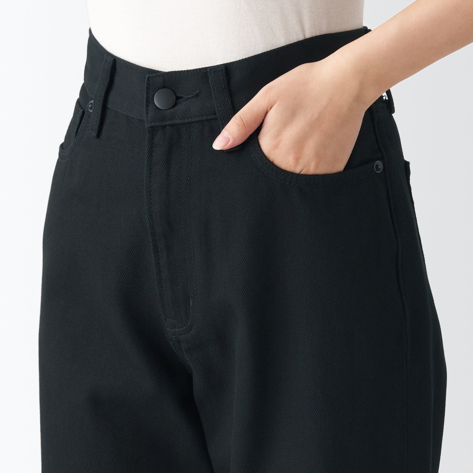 It has a tapered silhouette with moderate room around the stomach and buttocks and tapers toward the hem. The deep. high-rise waist wraps around your hips.