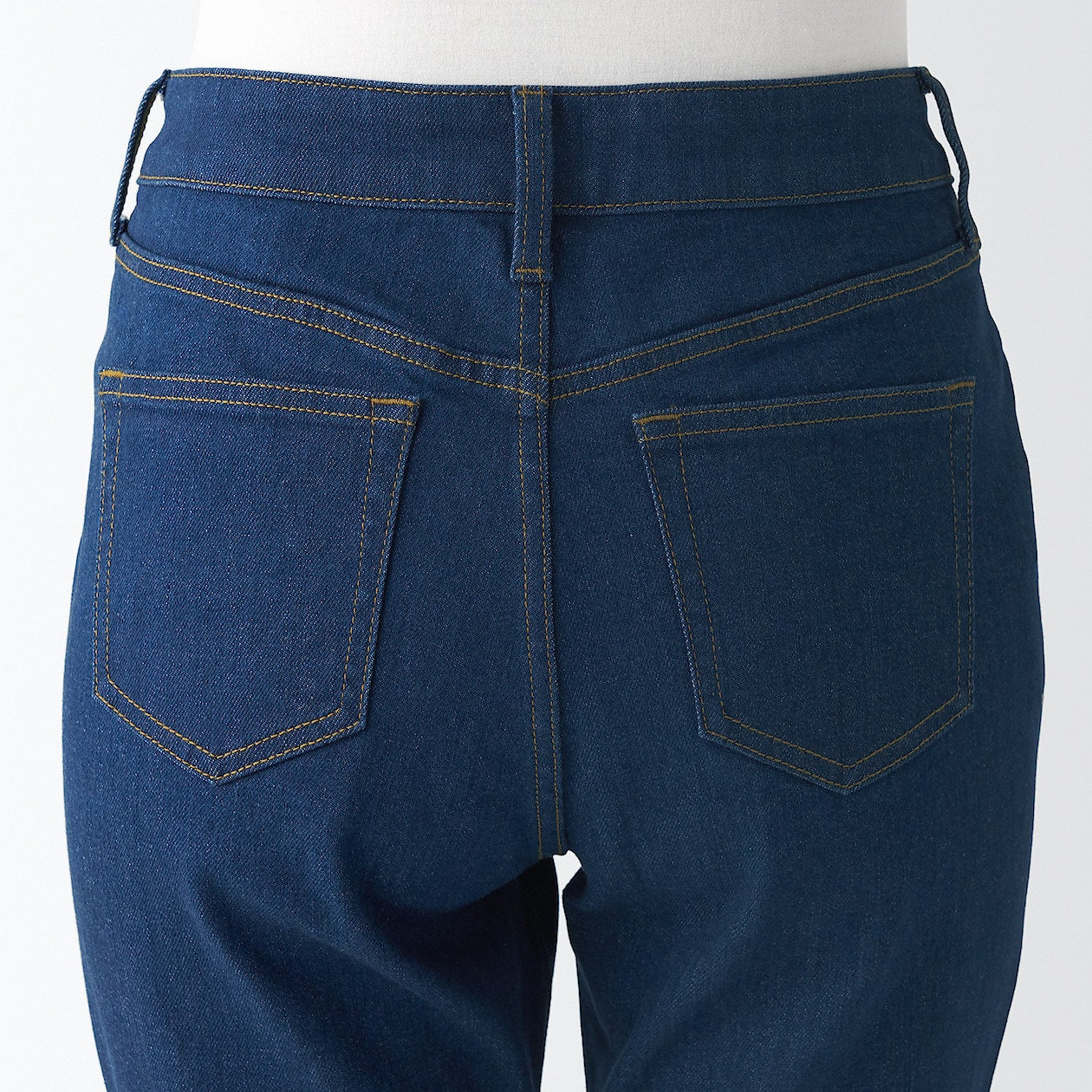 The slim silhouette follows the leg line from the thigh to the knee. shaping the outline of your legs. The mid-rise waist hugs your waist perfectly and the front width of the denim gives the illusion of a narrower waist.