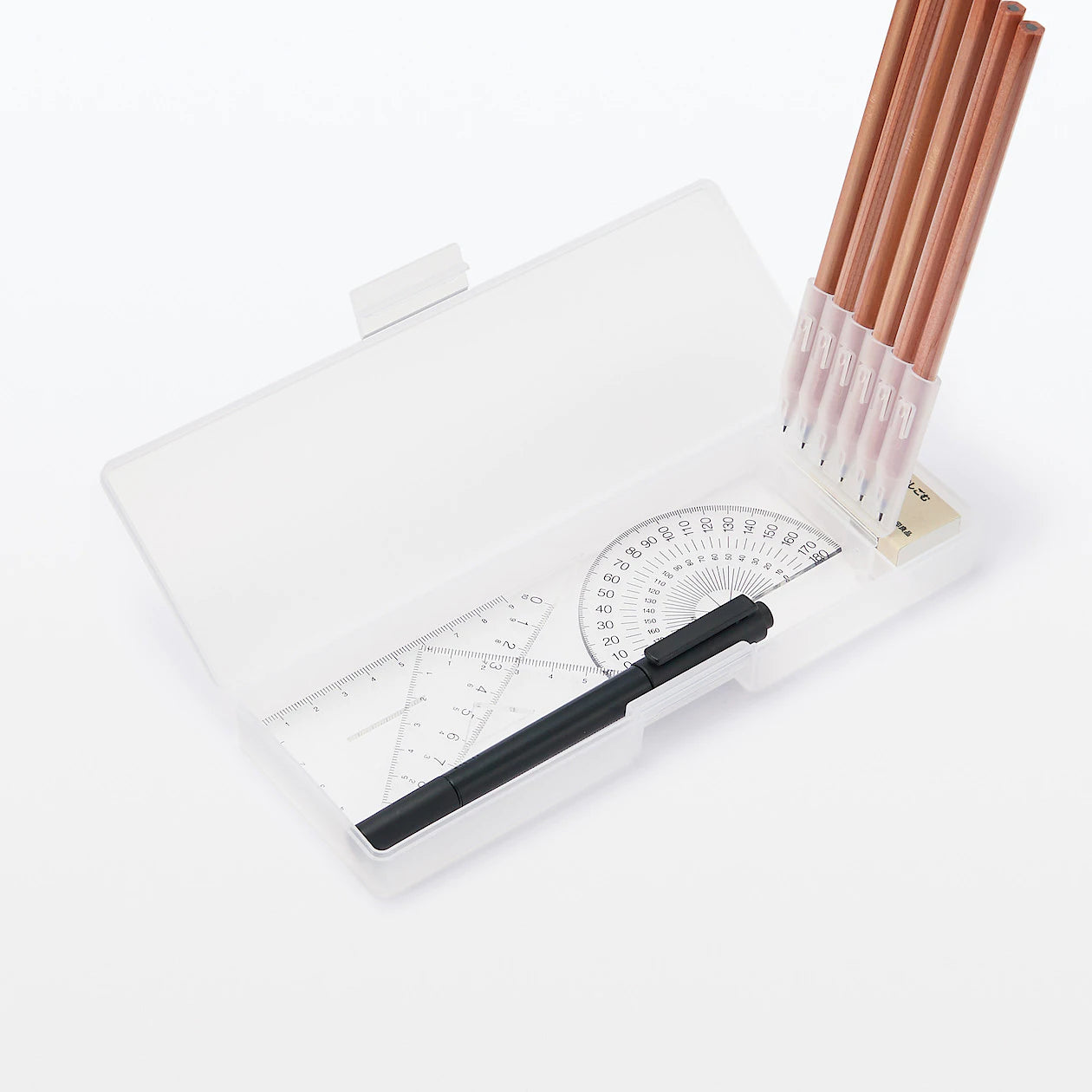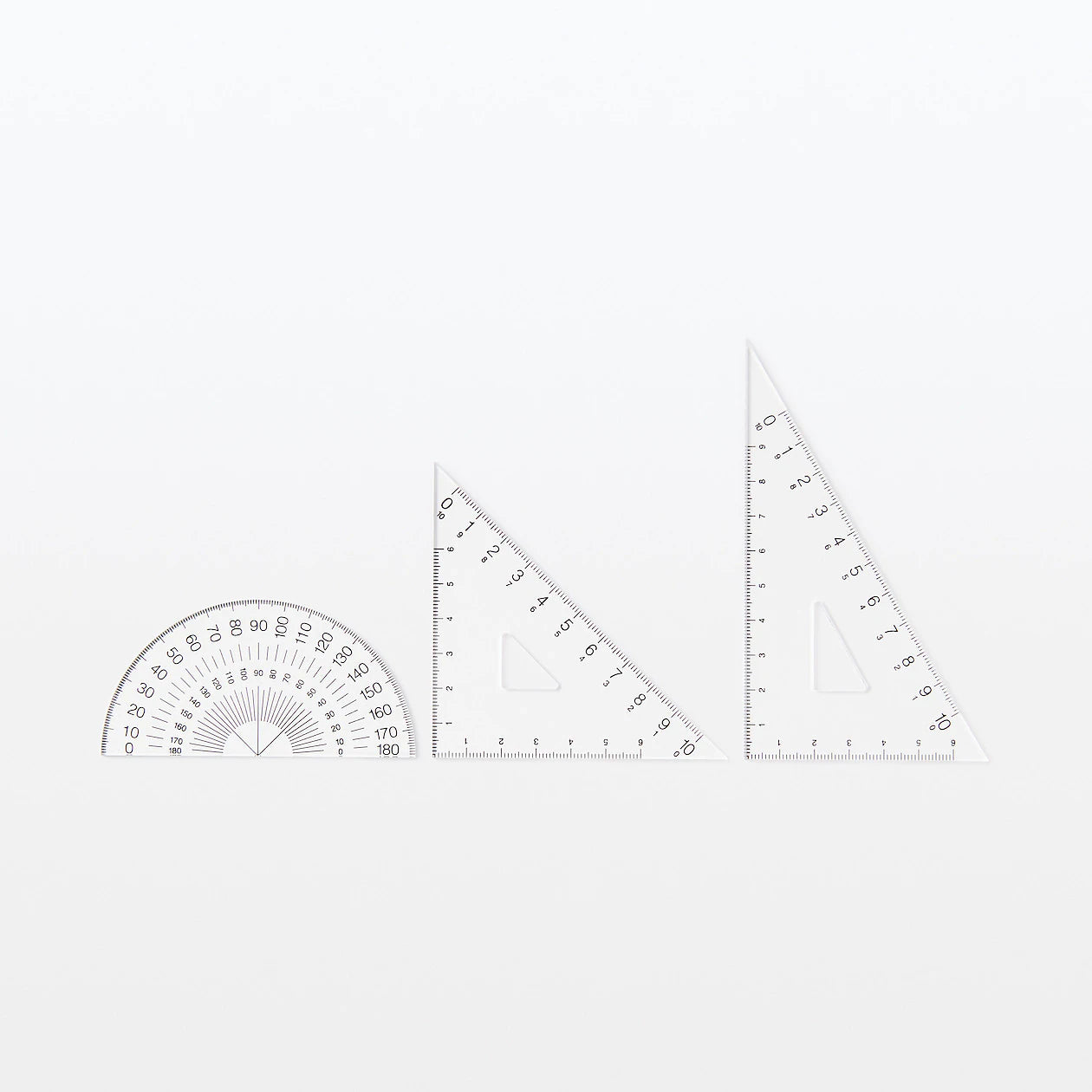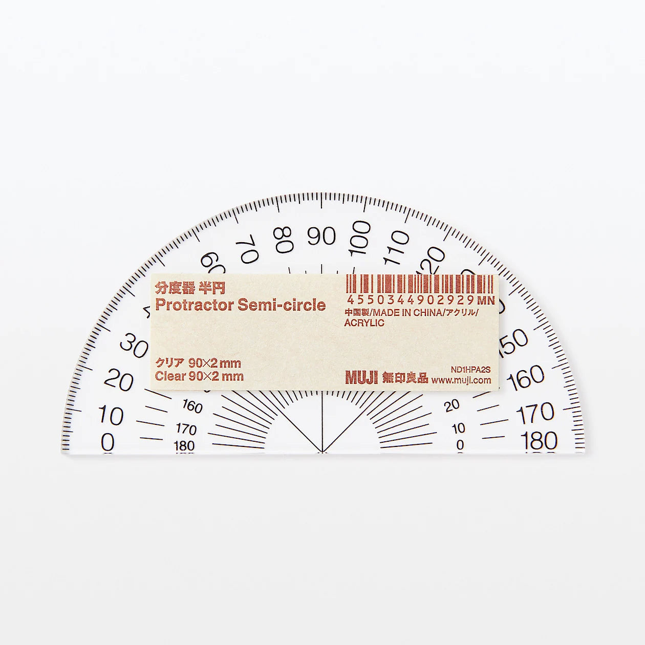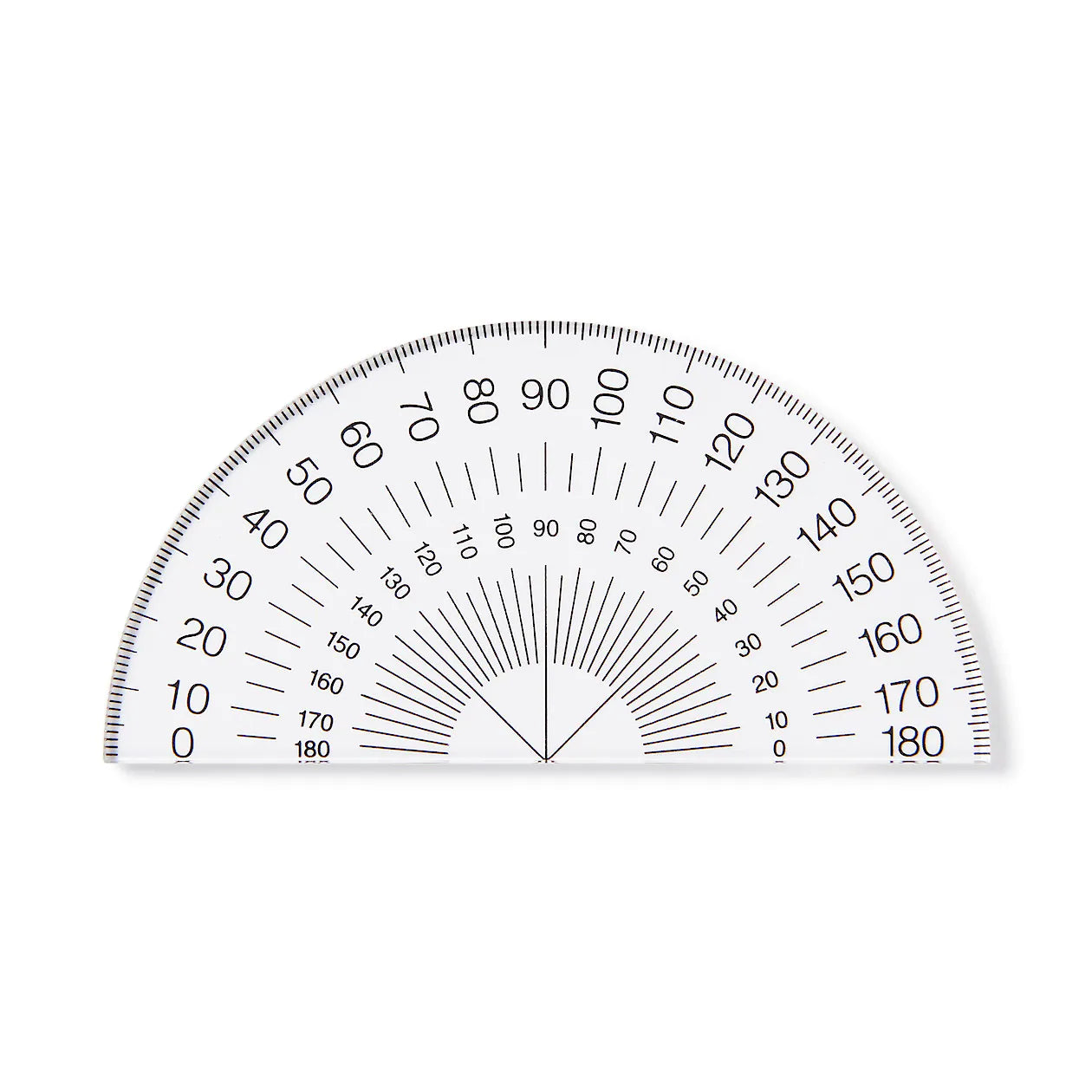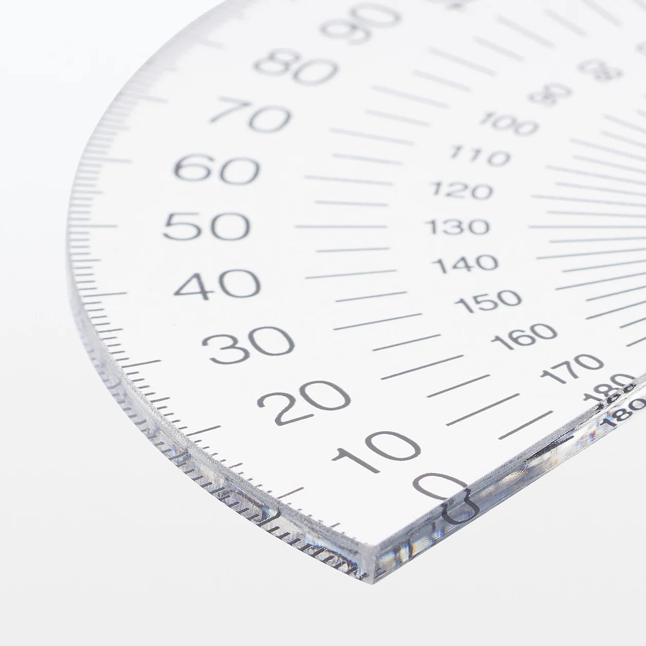 A clear protractor. with scales on both sides so angles can be measured from either the left or right.