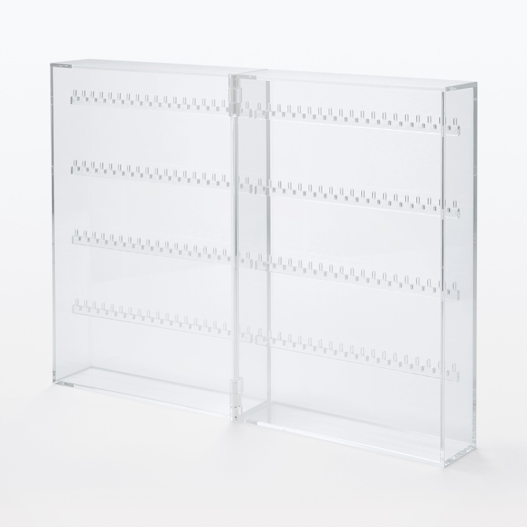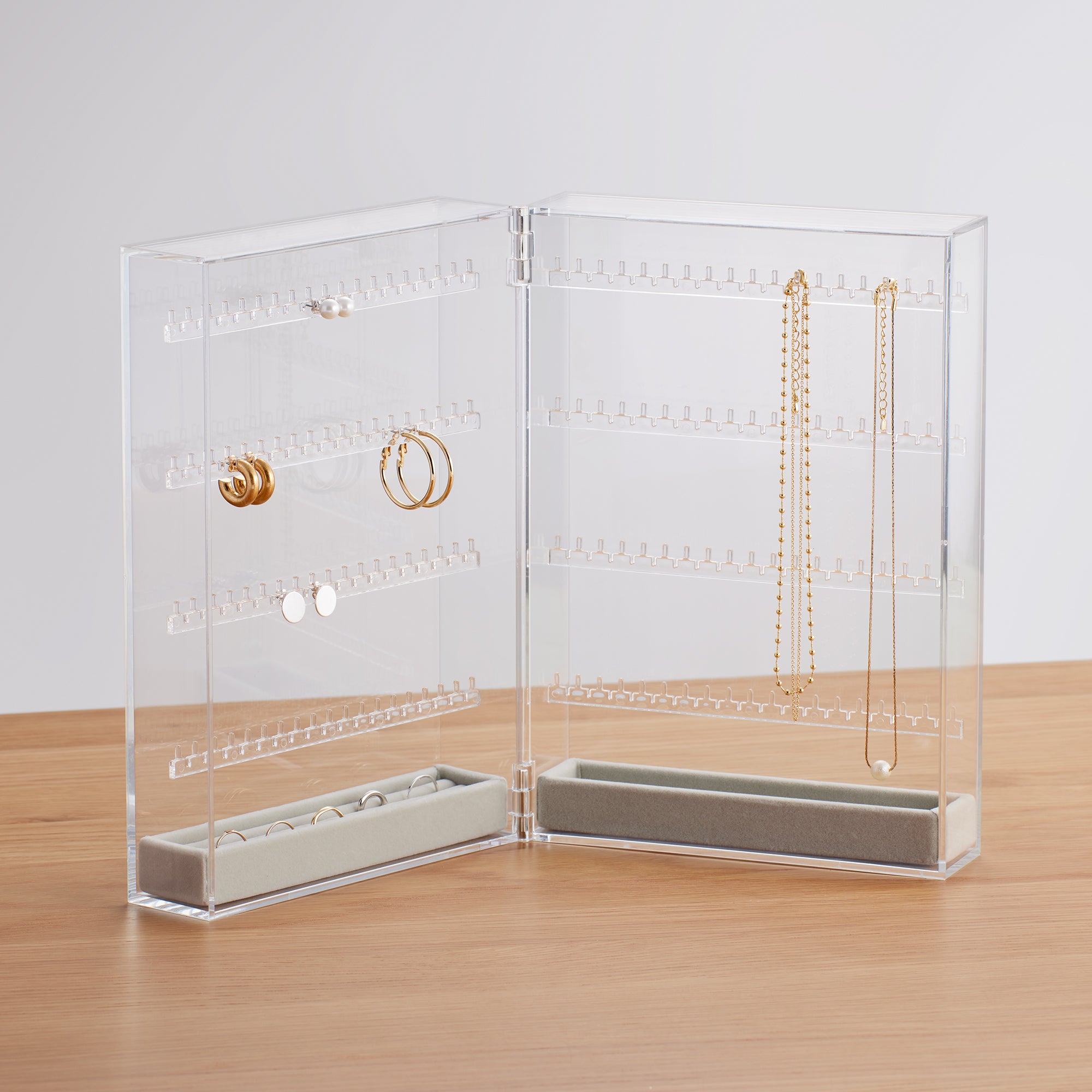 A transparent case with 4 hook tiers that make it ideal for hanging necklaces and earrings. There is also room at the bottom to place a (sold separately) for even more optimized storage.