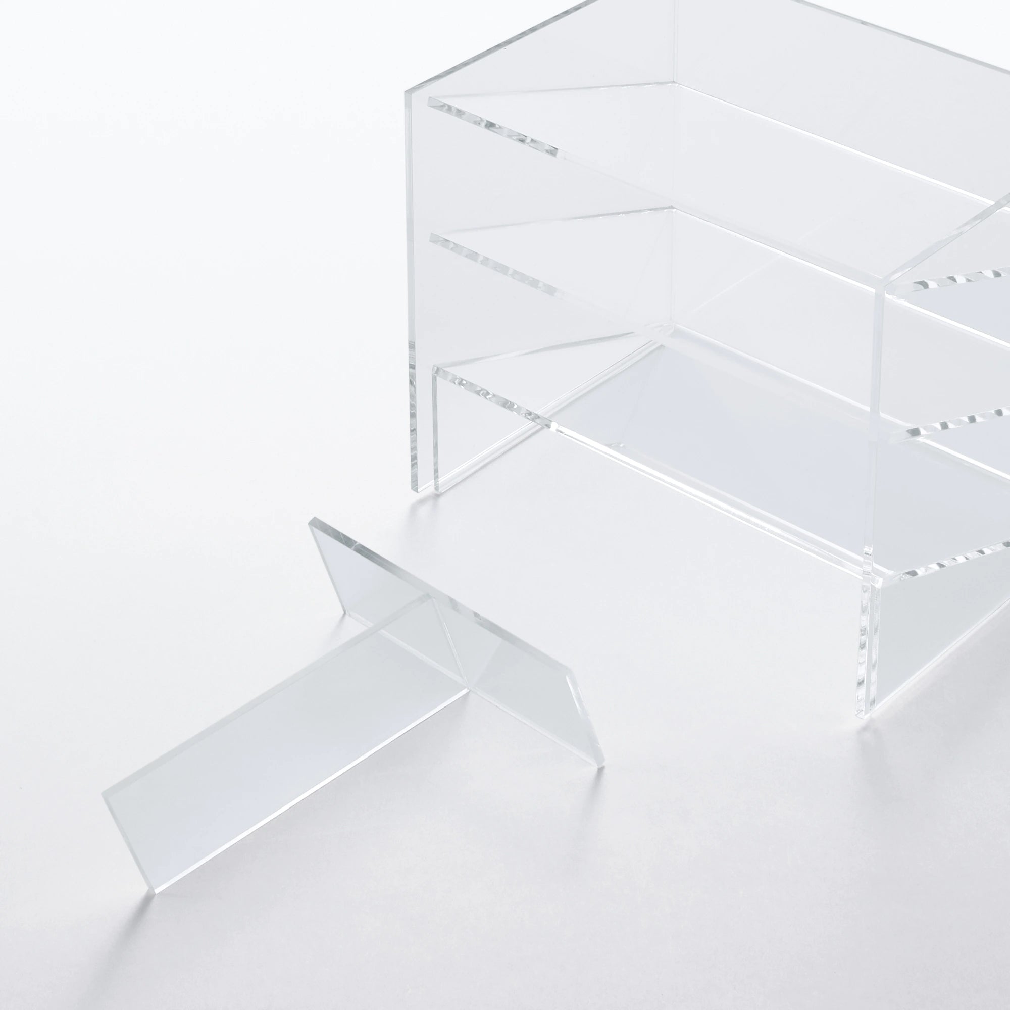 A free-standing accessories rack with three slanted partitions to organize small items on your desk while saving space. Designed with an open top so you can easily store & grab your most-used essentials. This rack is not meant to be stacked.