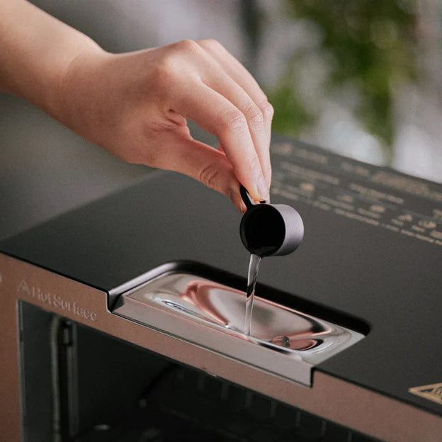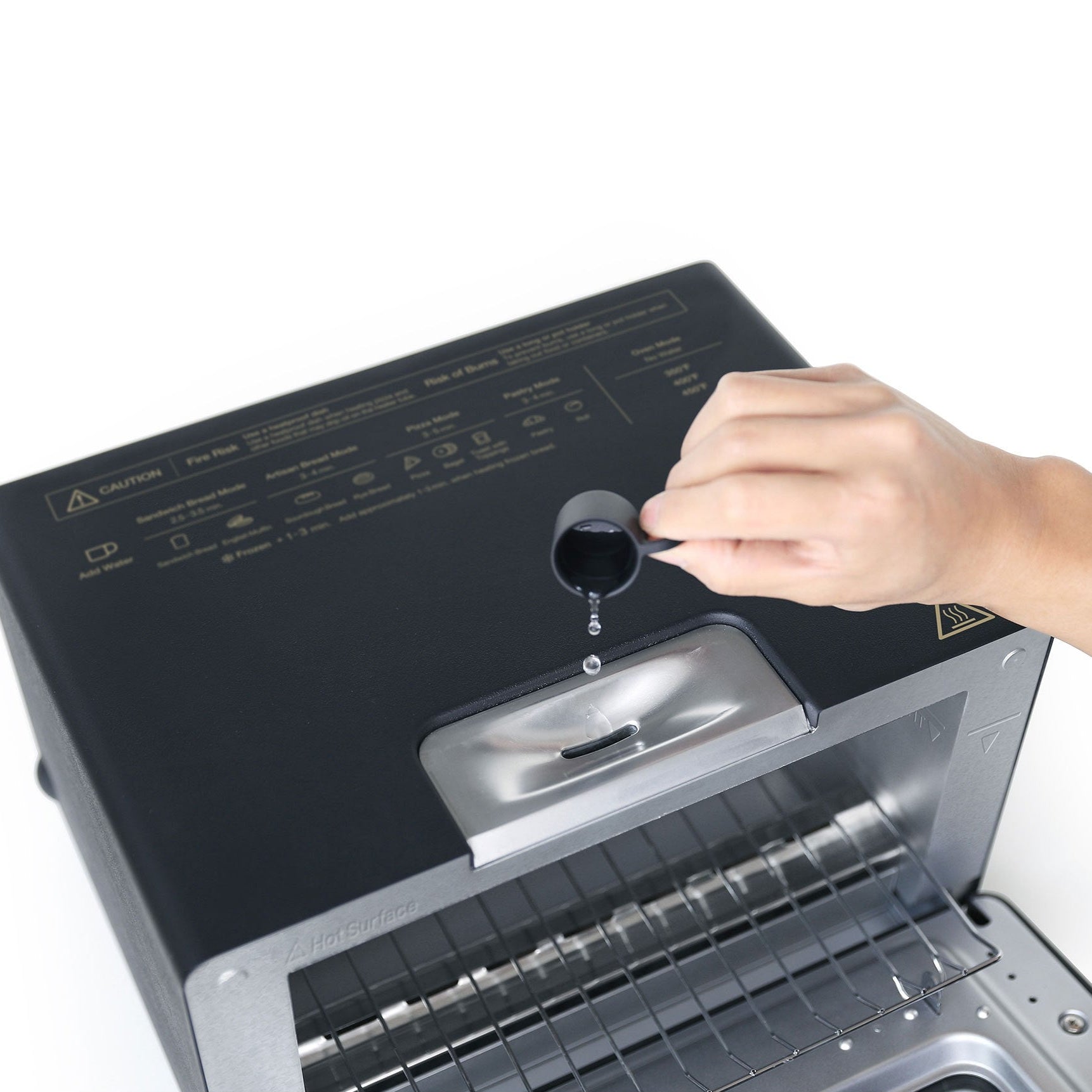 Steam technology: Simply pour five cc’s of water at the start of each toast. Heating more rapidly than air. a thin layer of steam envelops the bread. lightly toasting its surface. while keeping its inner moisture and flavor from escaping.