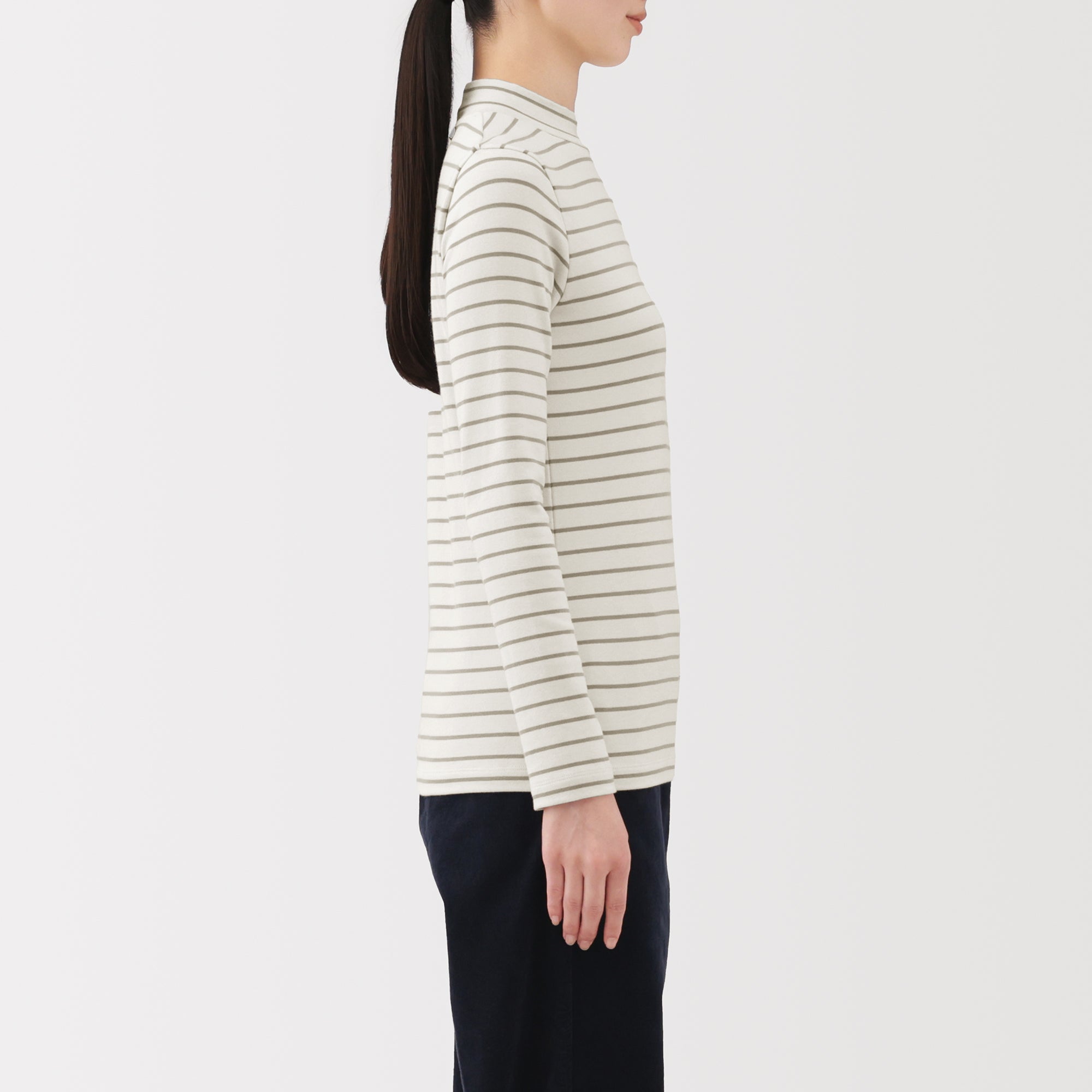 A ribbed mock neck t-shirt with a lightly brushed interior for warmth and a soft. smooth feel against the skin. The high neck fits around the neck to provide protection from the cold. Made with organic cotton.