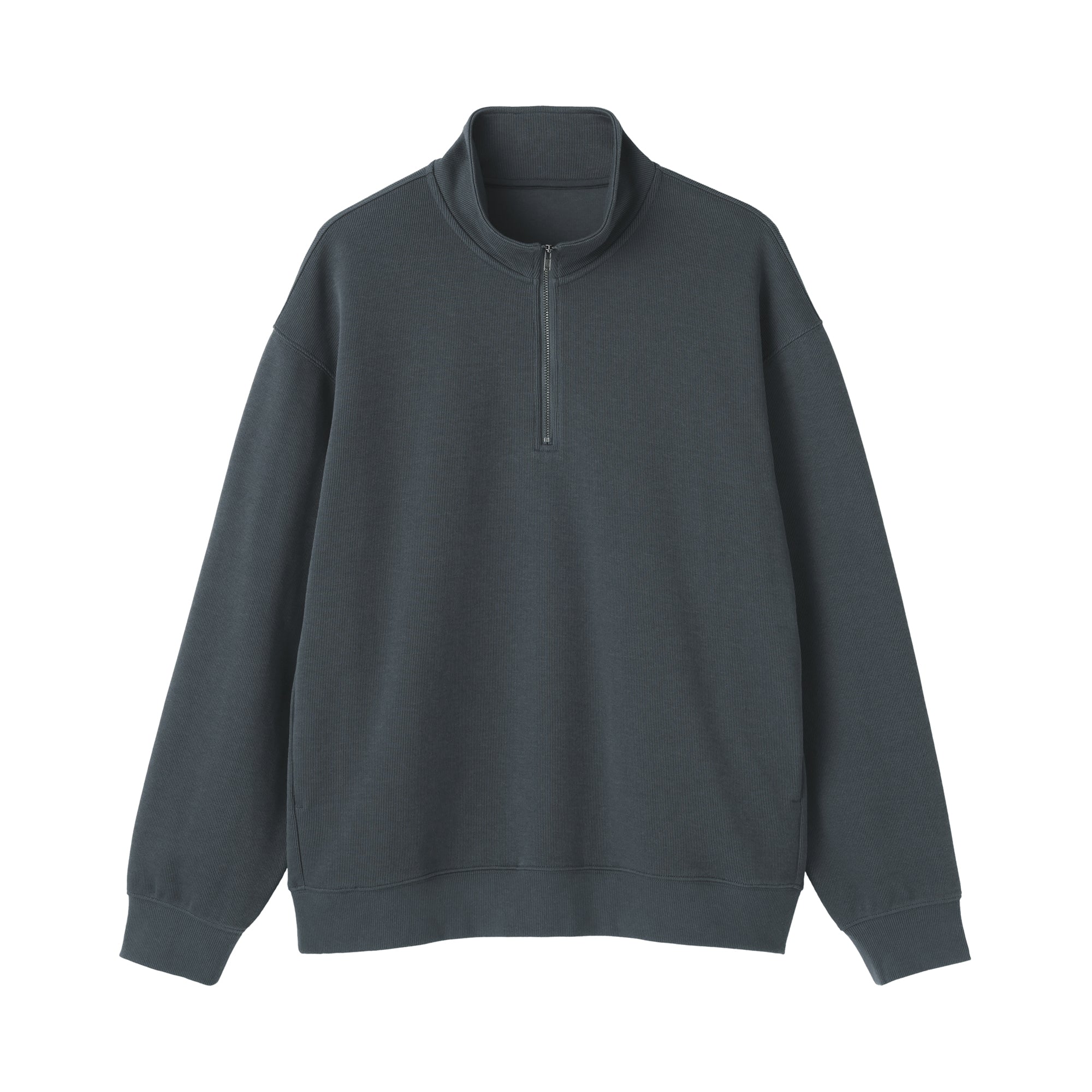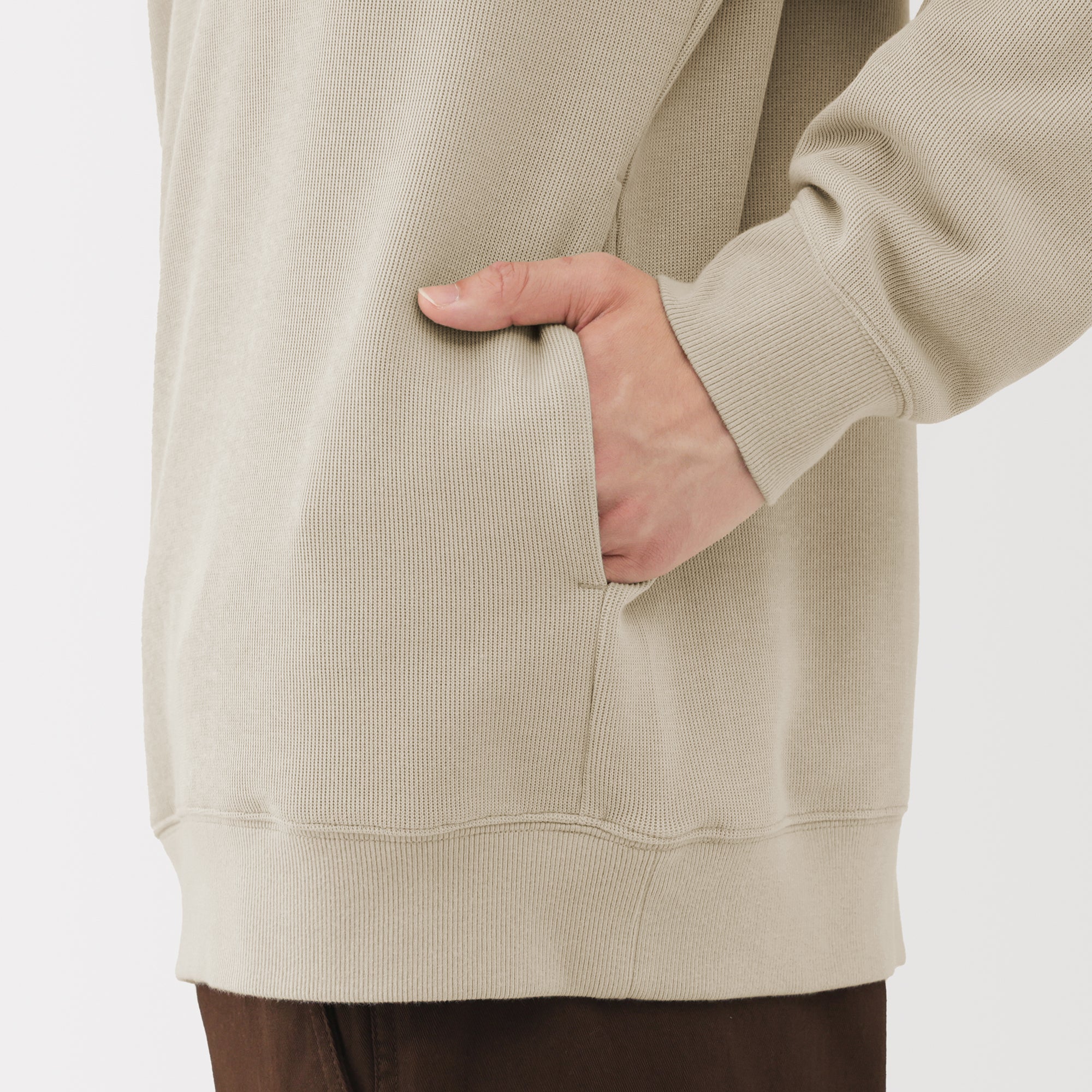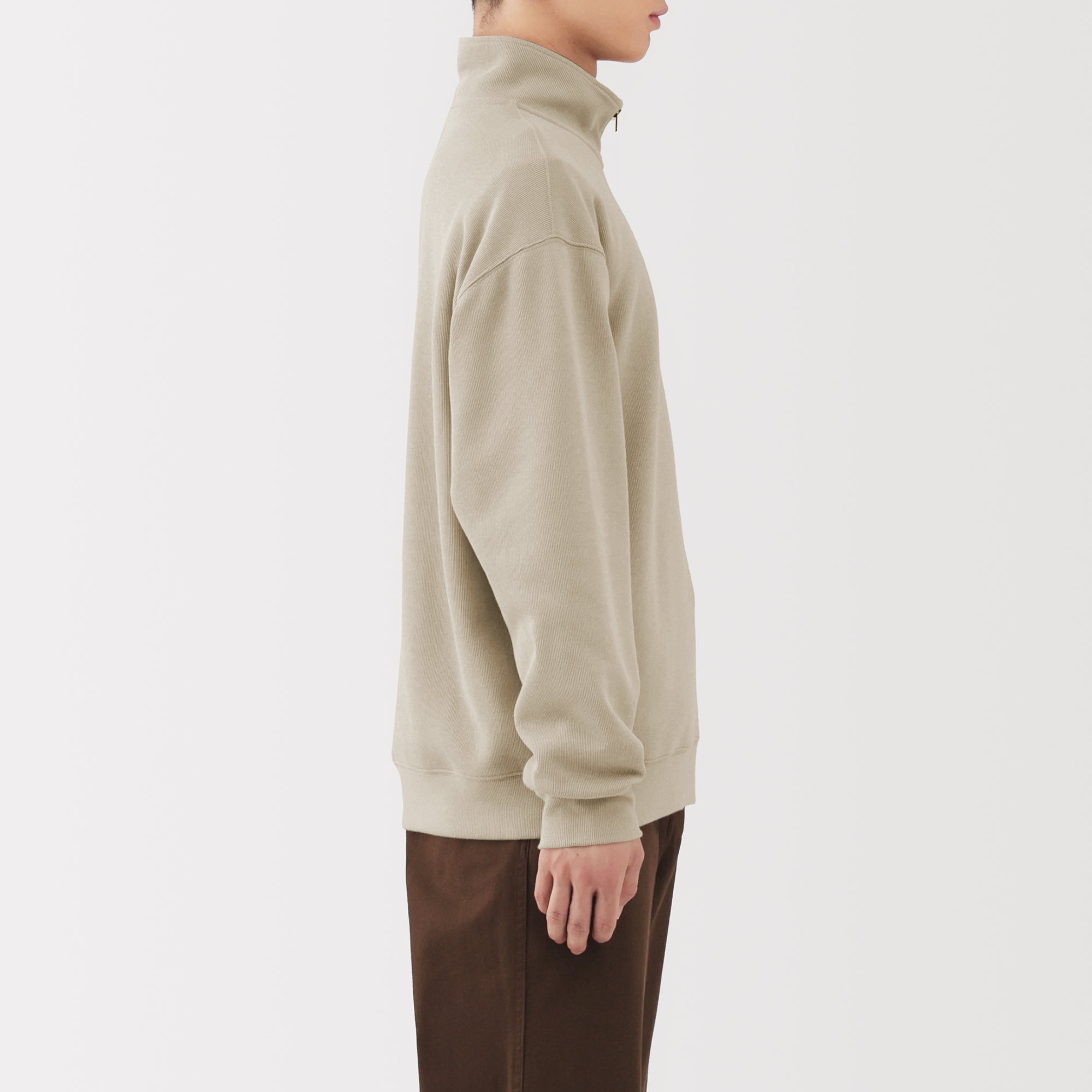 This men’s half zip pullover is made with a blend of cotton and recycled polyester. It is knitted in a double layered structure that keeps it airy and lightweight. with just the right amount of thickness for comfort. The material is smooth and glossy. giving it a clean and elegant look.