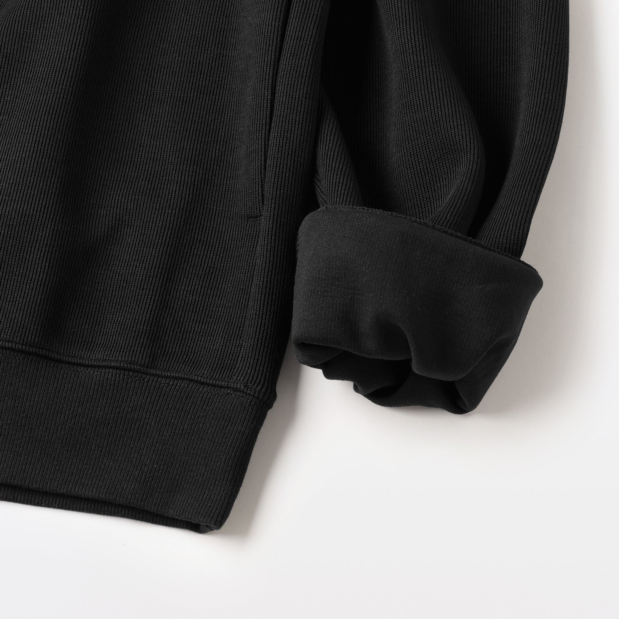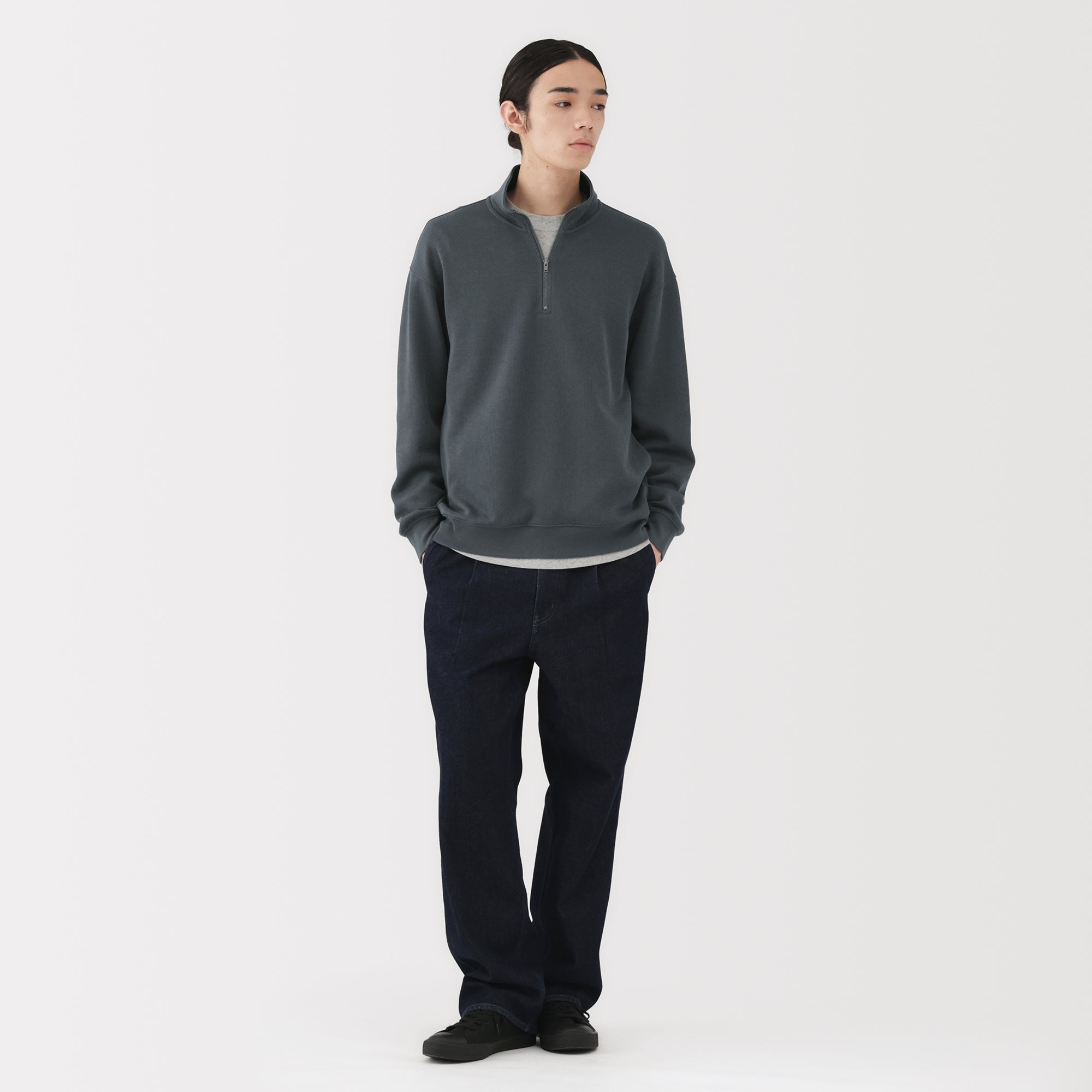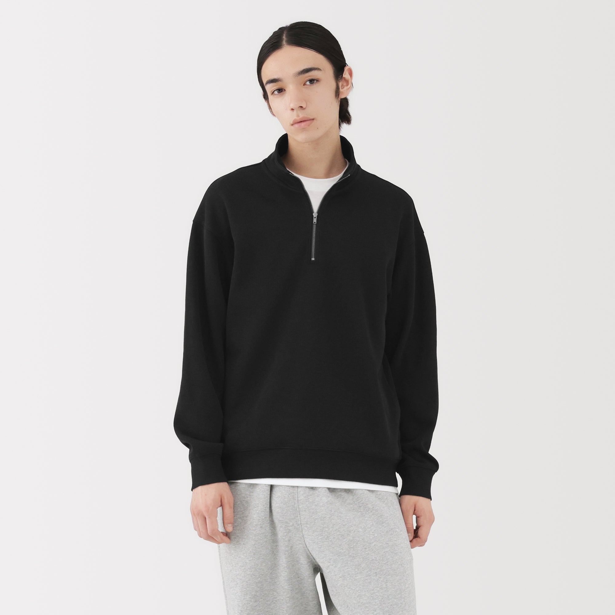 This men’s half zip pullover is made with a blend of cotton and recycled polyester. It is knitted in a double layered structure that keeps it airy and lightweight. with just the right amount of thickness for comfort. The material is smooth and glossy. giving it a clean and elegant look.