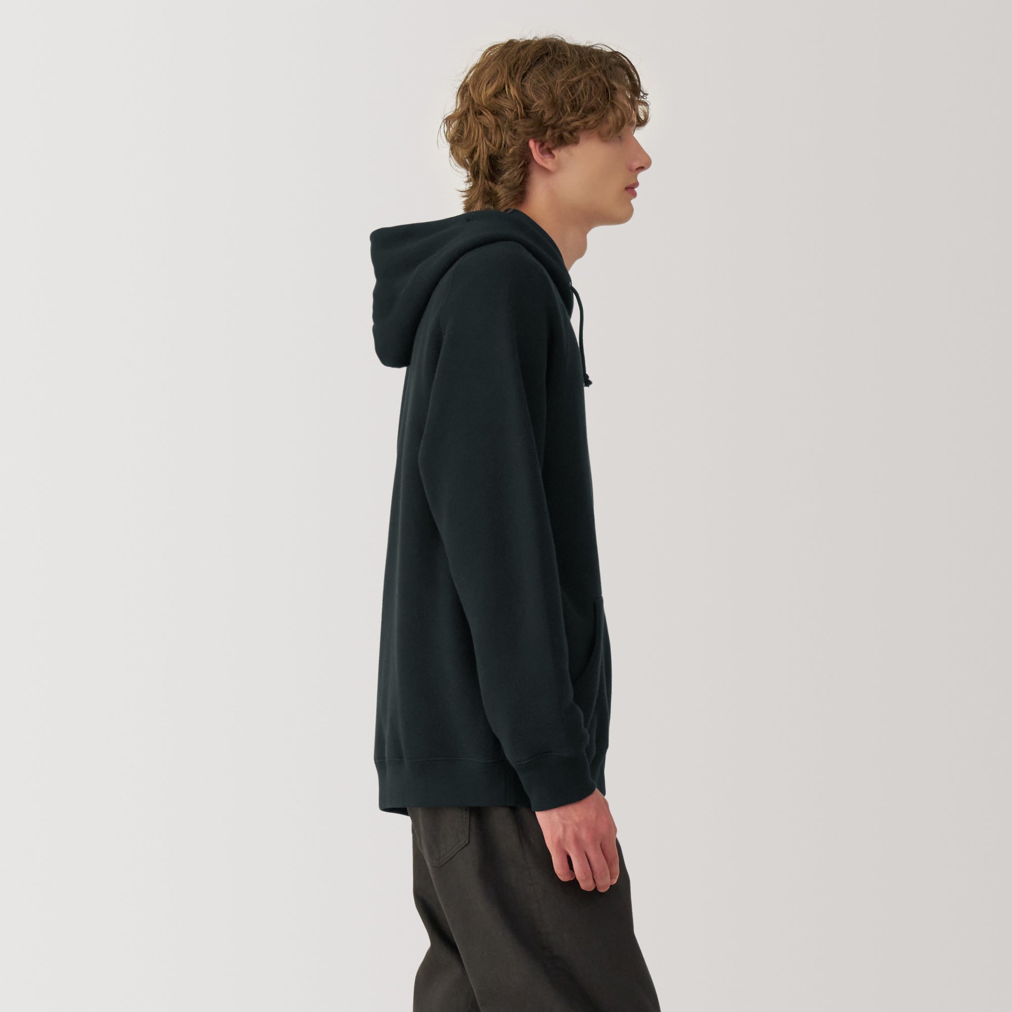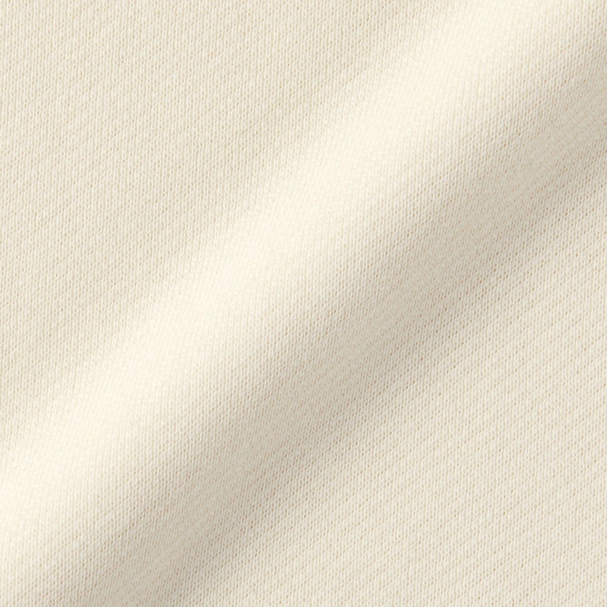 The softness of the fabric is achieved by using a traditional loopwheel machine. which knits very slowly from bottom to top to remove unnecessary tension on the yarn. Unlike modern high-speed machines that work top-to-bottom. causing fabric to sag due to its own weight. this slow and gentle process ensures a high-quality material with a fluffy. airy texture that is only possible with traditional knitting methods. The loopwheeling method may leave charming irregularities such as an uneven texture and a slub appearance that is unique to this traditional process.