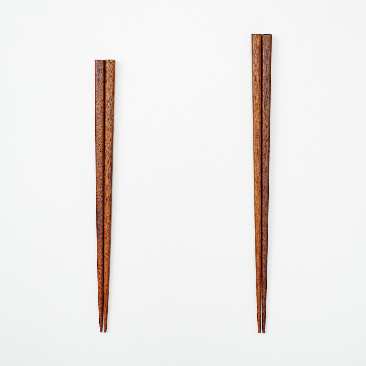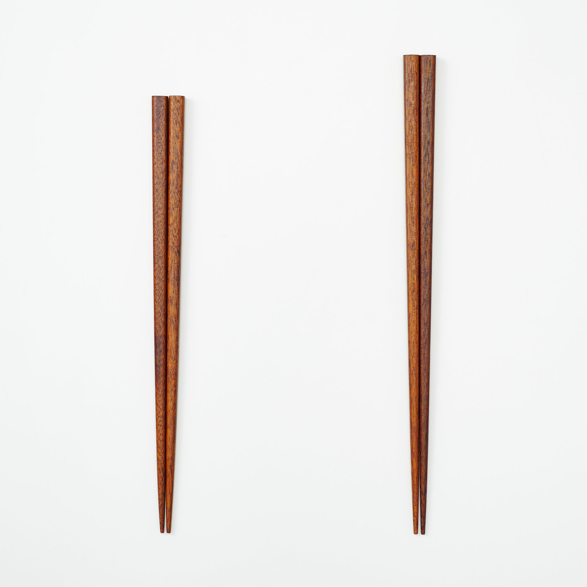 These chopsticks are made from Malas wood sourced from New Guinea. a dense. strong wood commonly used for constructing docks. bridges and ships. It is then rubbed with lacquer to provide a smooth finish that feels comfortable on the hand. The corners are a gentle. round shape.