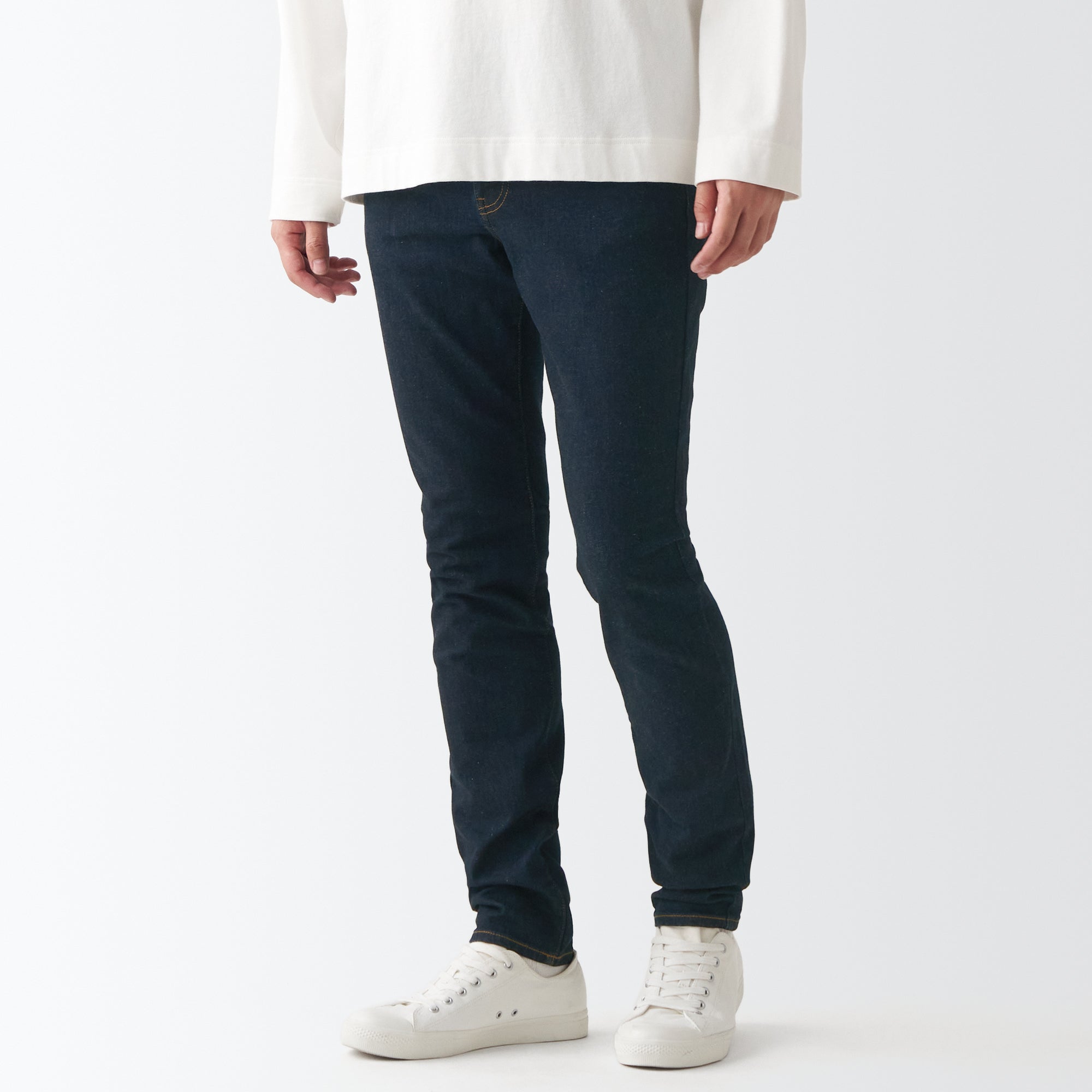 The Skinny Fit perfectly follows the shape line of your legs by using high elastic fabric. Designed with a thinner hem. and focusing on the silhouette. this is a timeless denim for everyday wear. Available in 2 colors. dark navy and black. that are easy to mix and match.