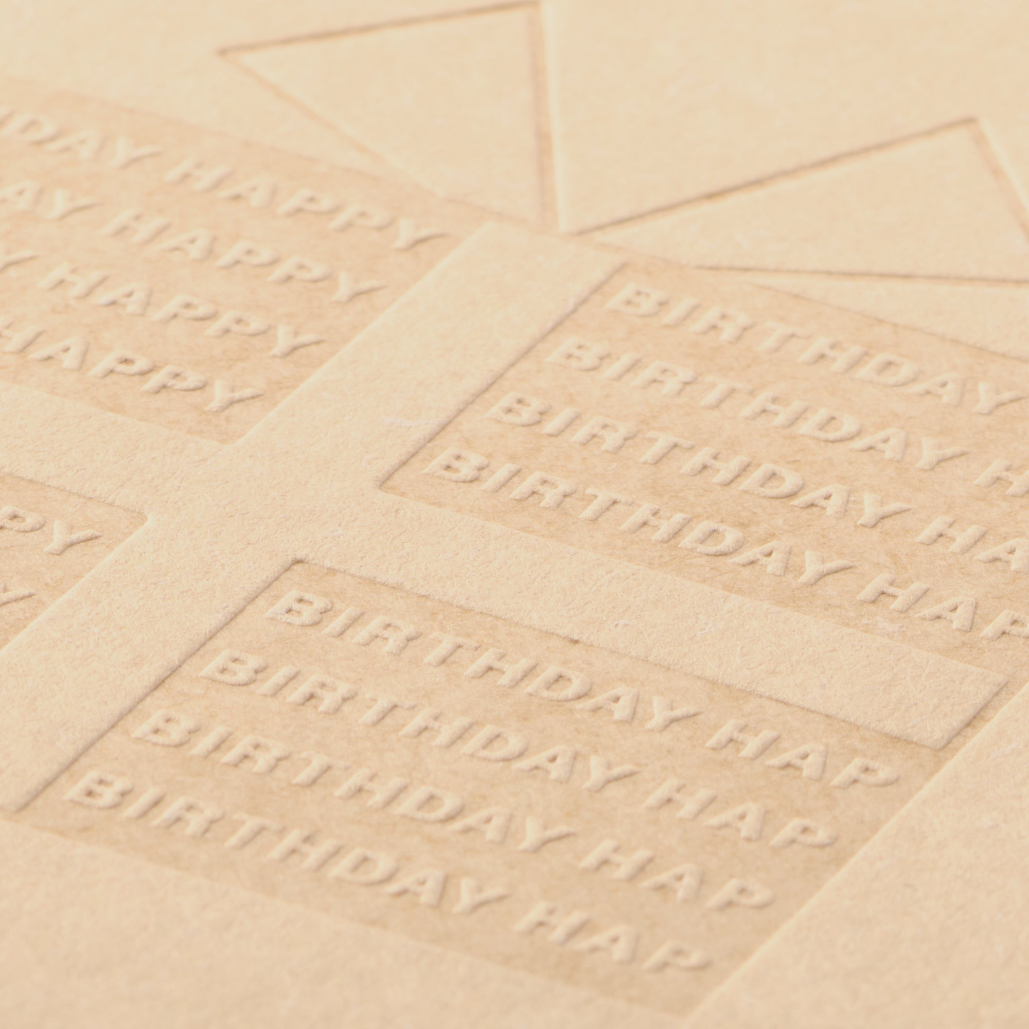 A folded message card featuring a debossed wrapped gift box with HAPPY BIRTHDAY written on it. The inside of the card is blank. so you’re able to decorate it freely. Includes an envelope for the card.
