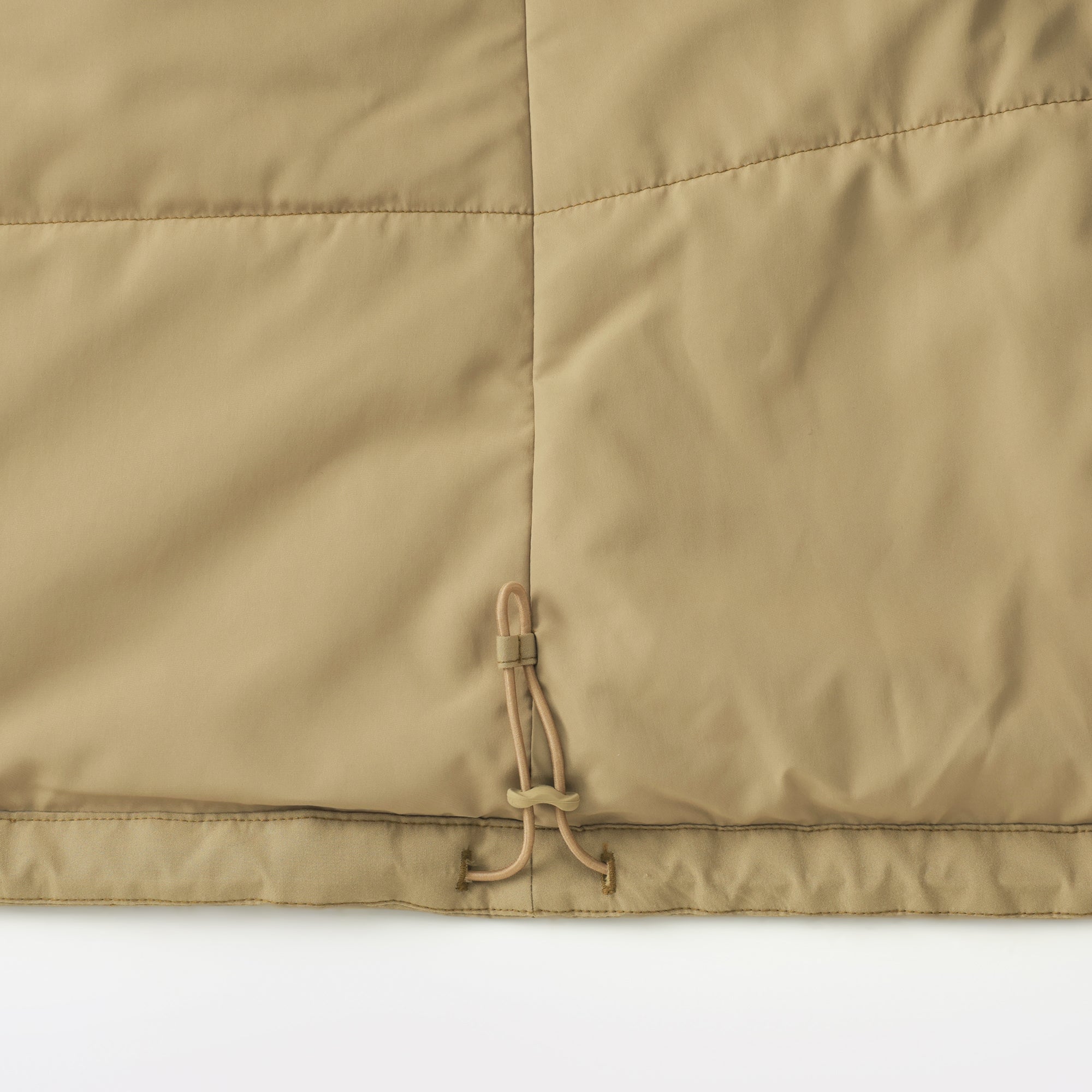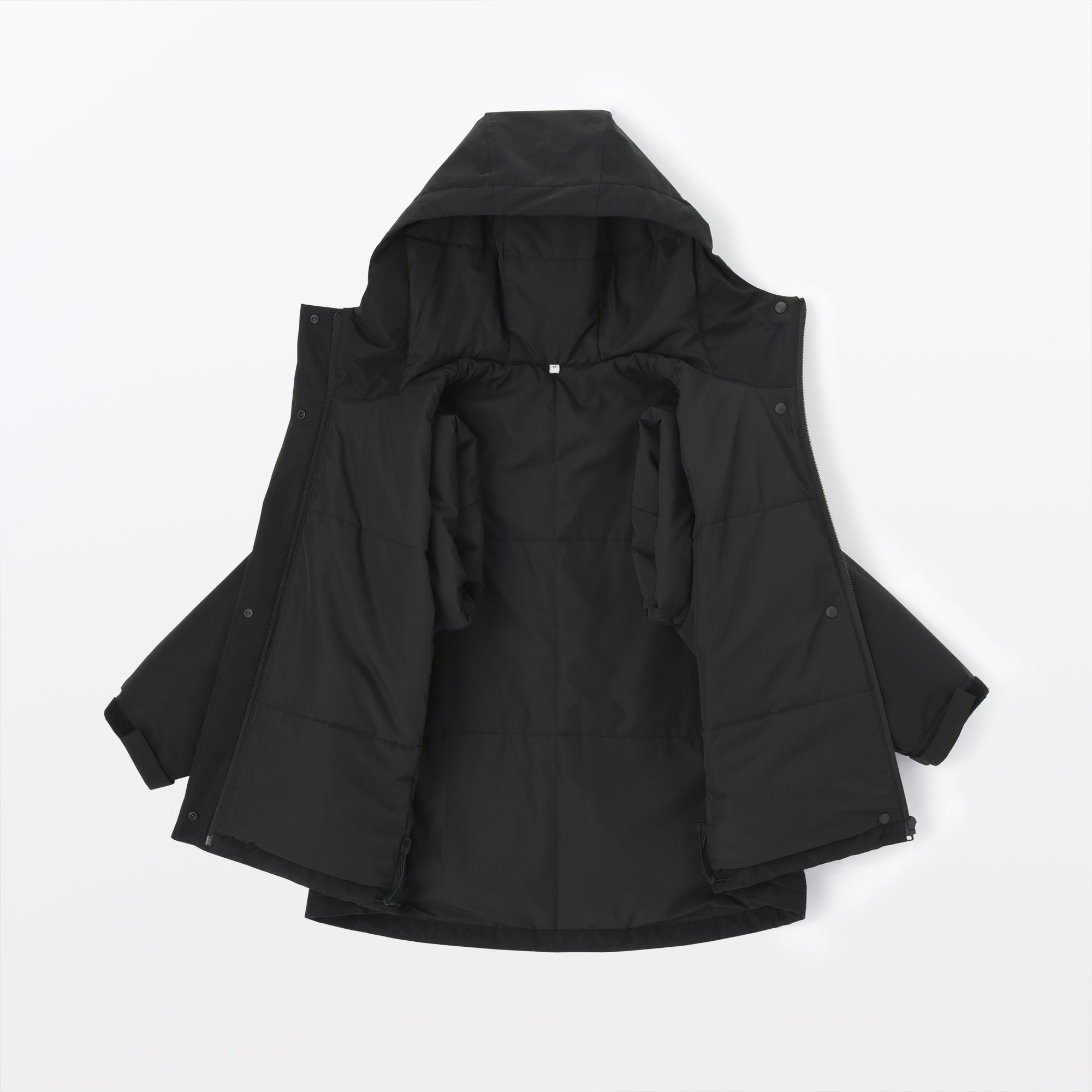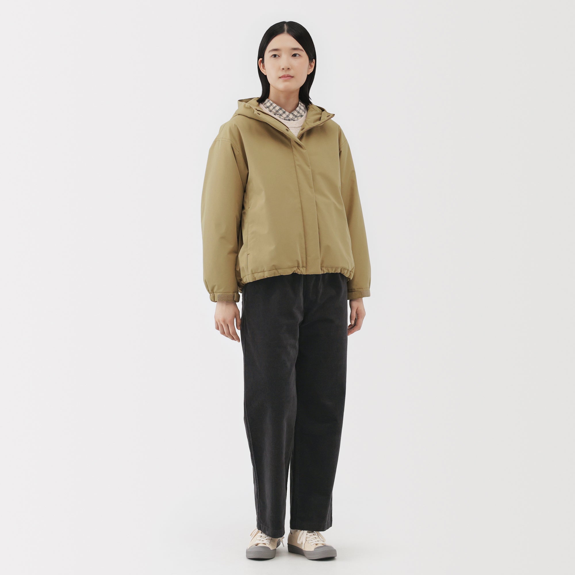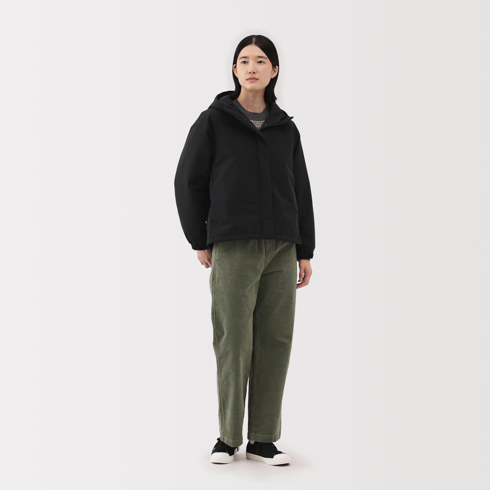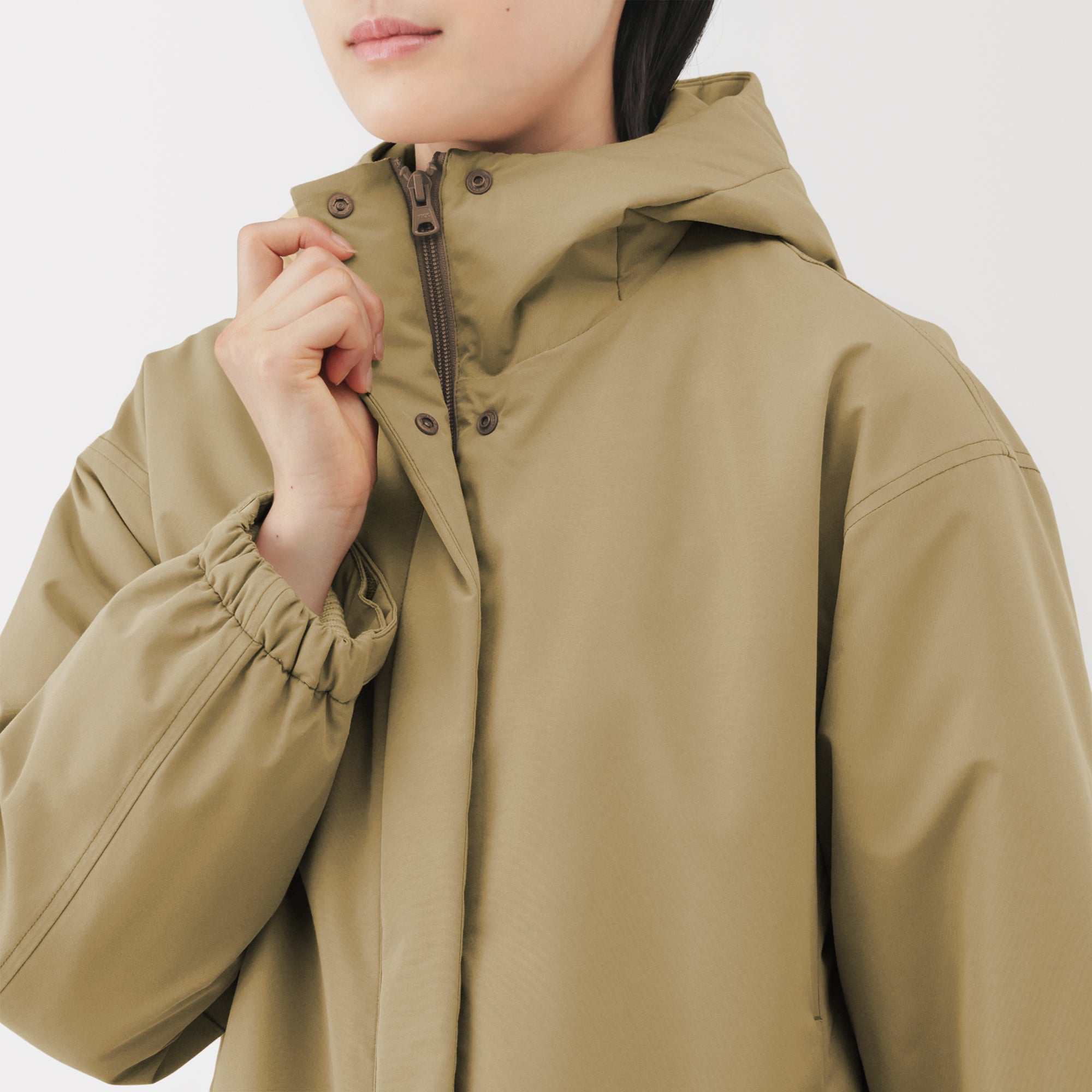 A women’s water repellent padded jacket with a hood that will keep you warm and dry in the winter. Uses recycled polyester.