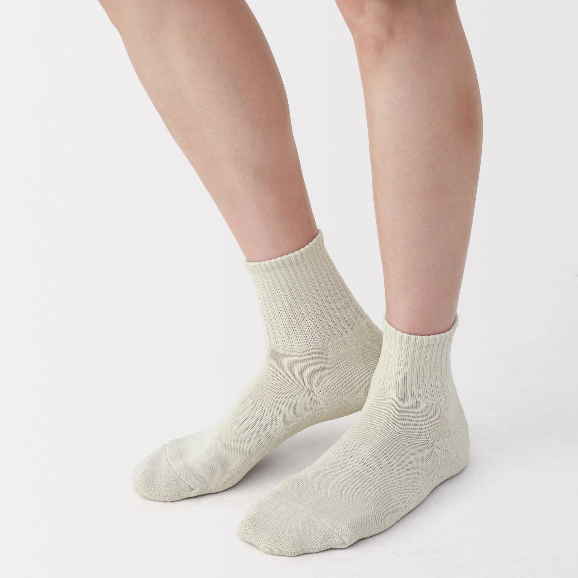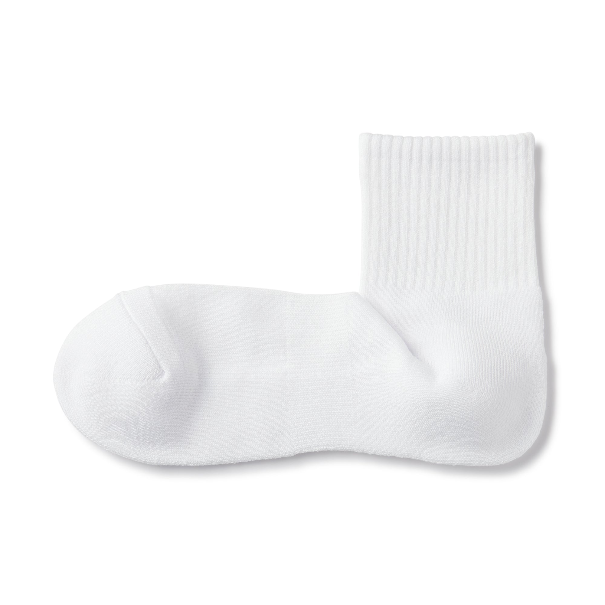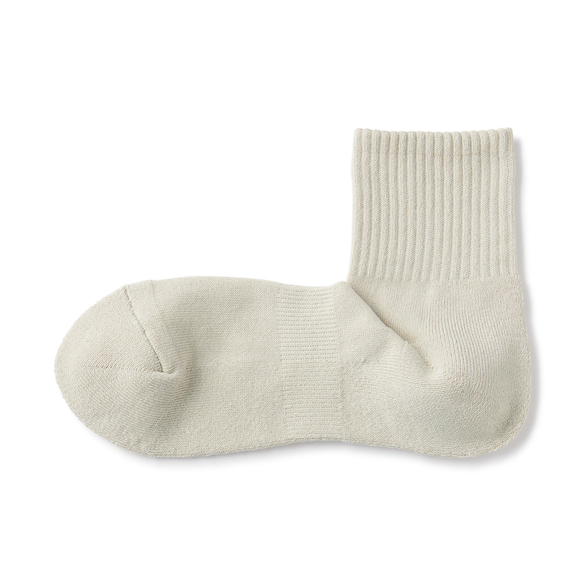 Soft pile-knitted sole with a sweat de-odorizing effect. The heel of the socks is knitted at a right angle to wrap comfortably and naturally around the heel.