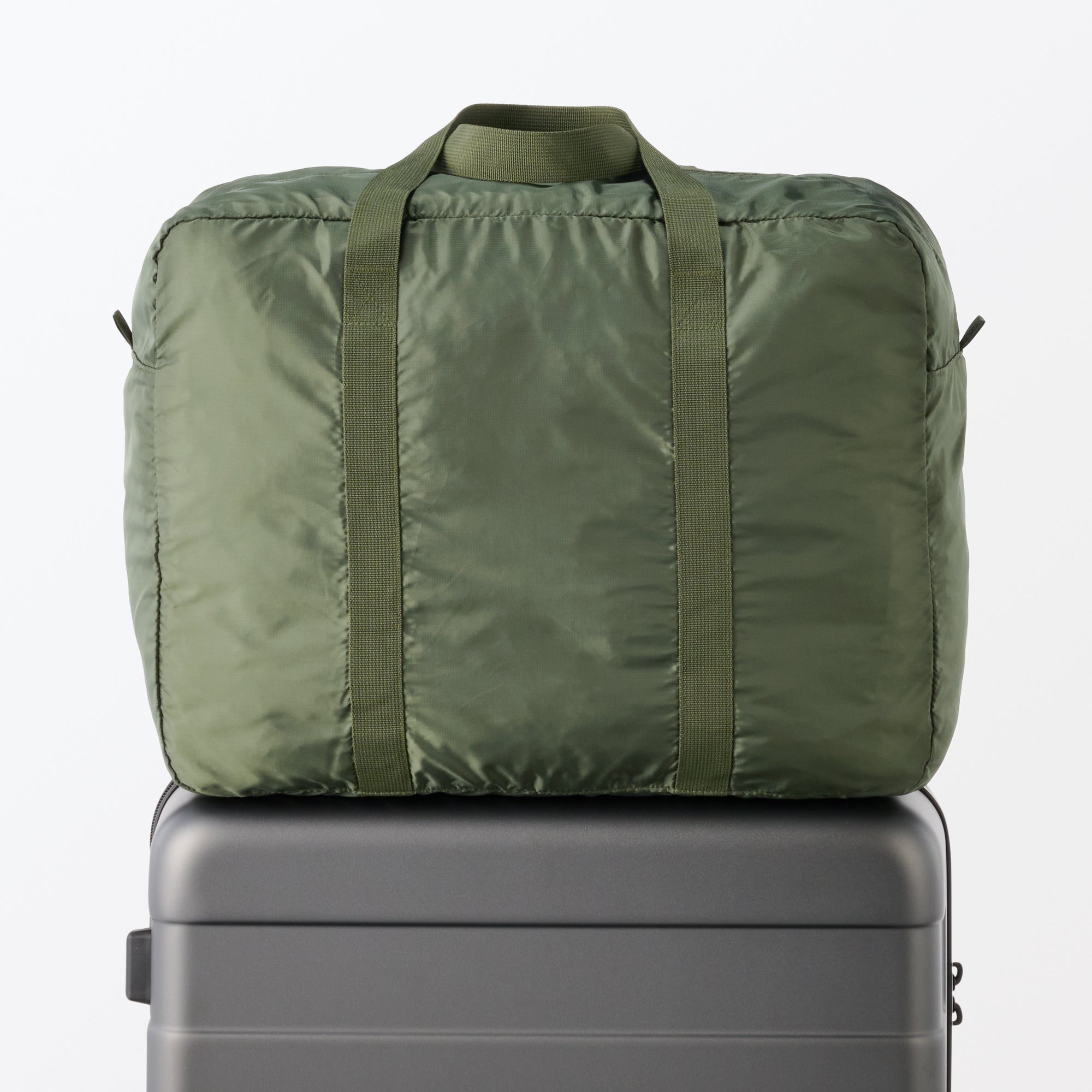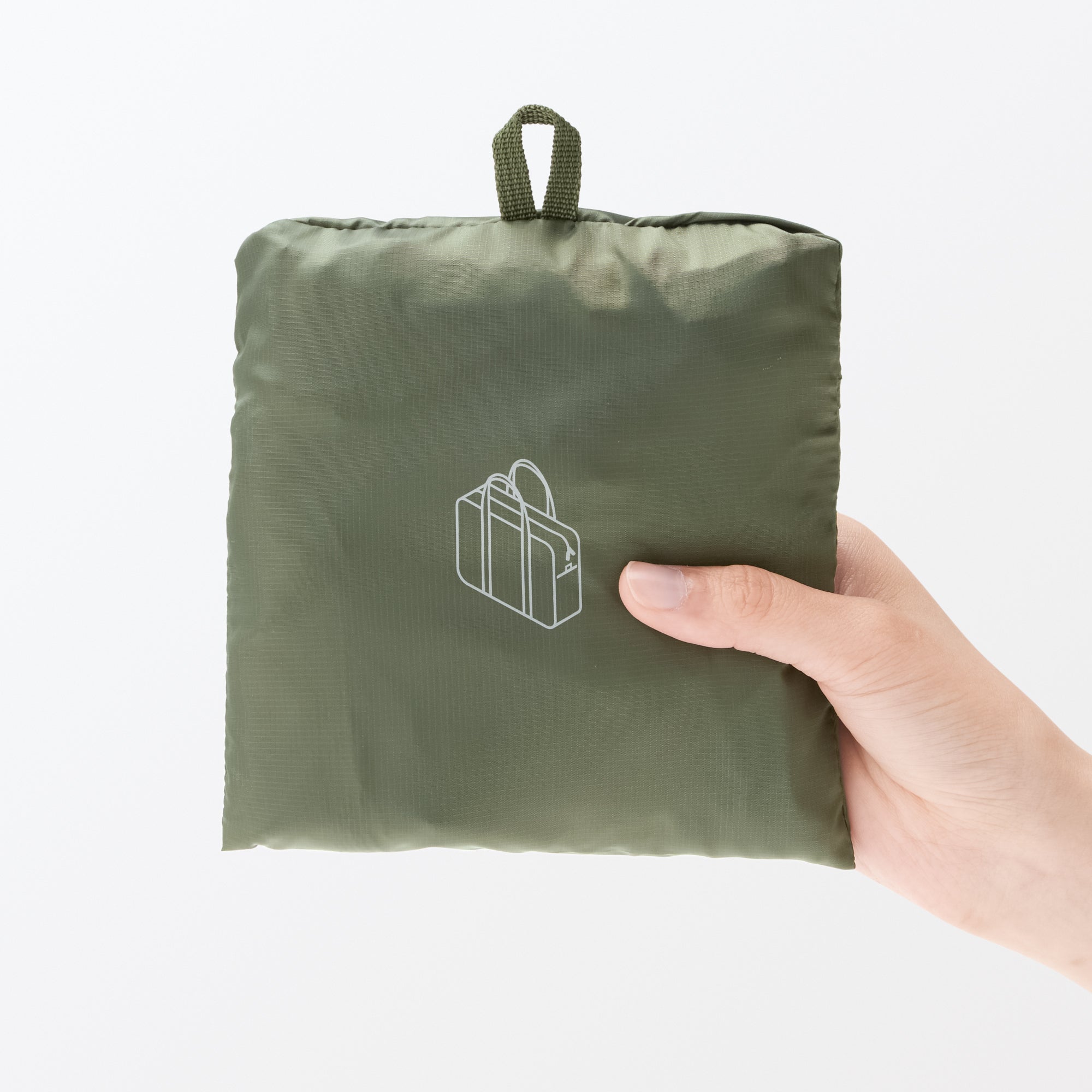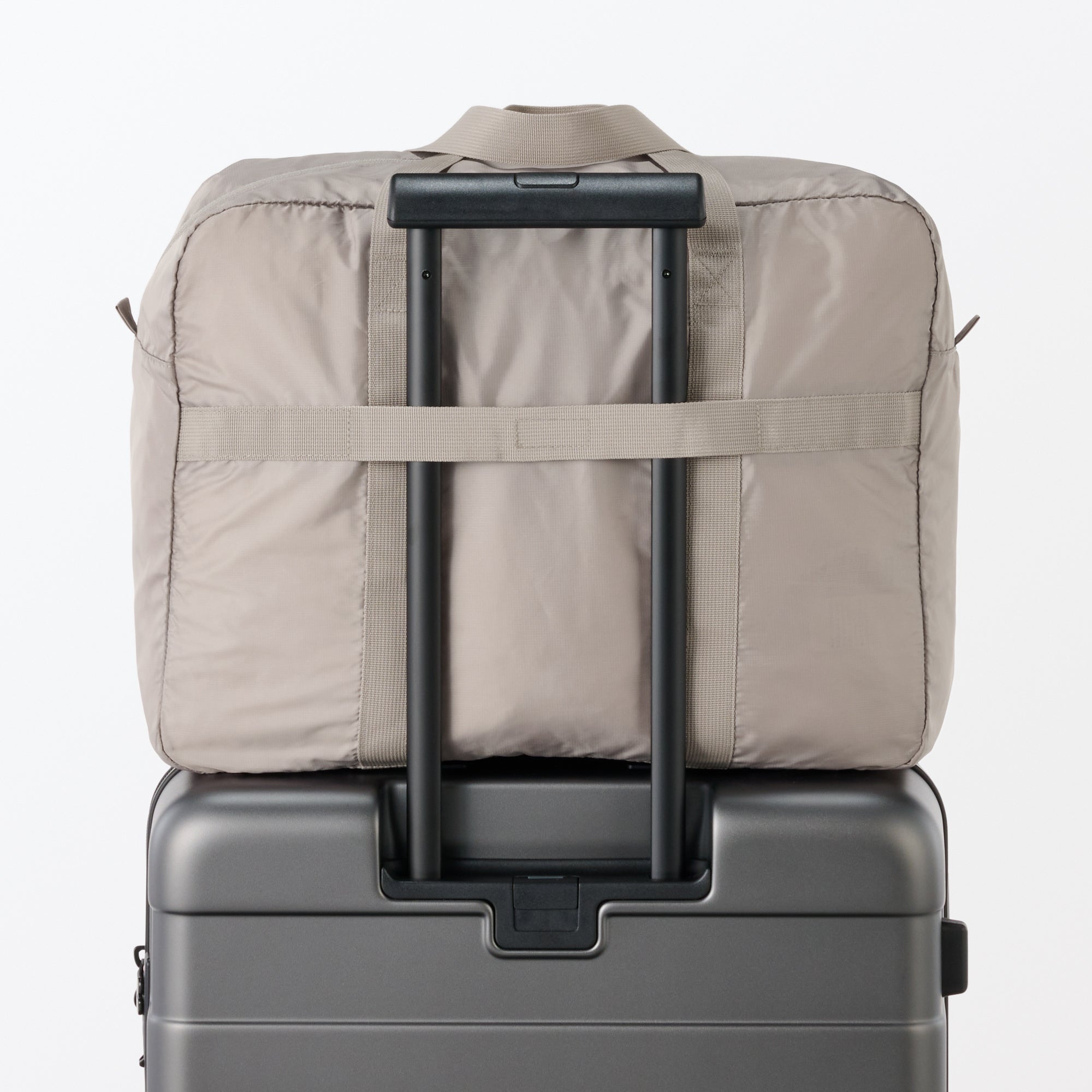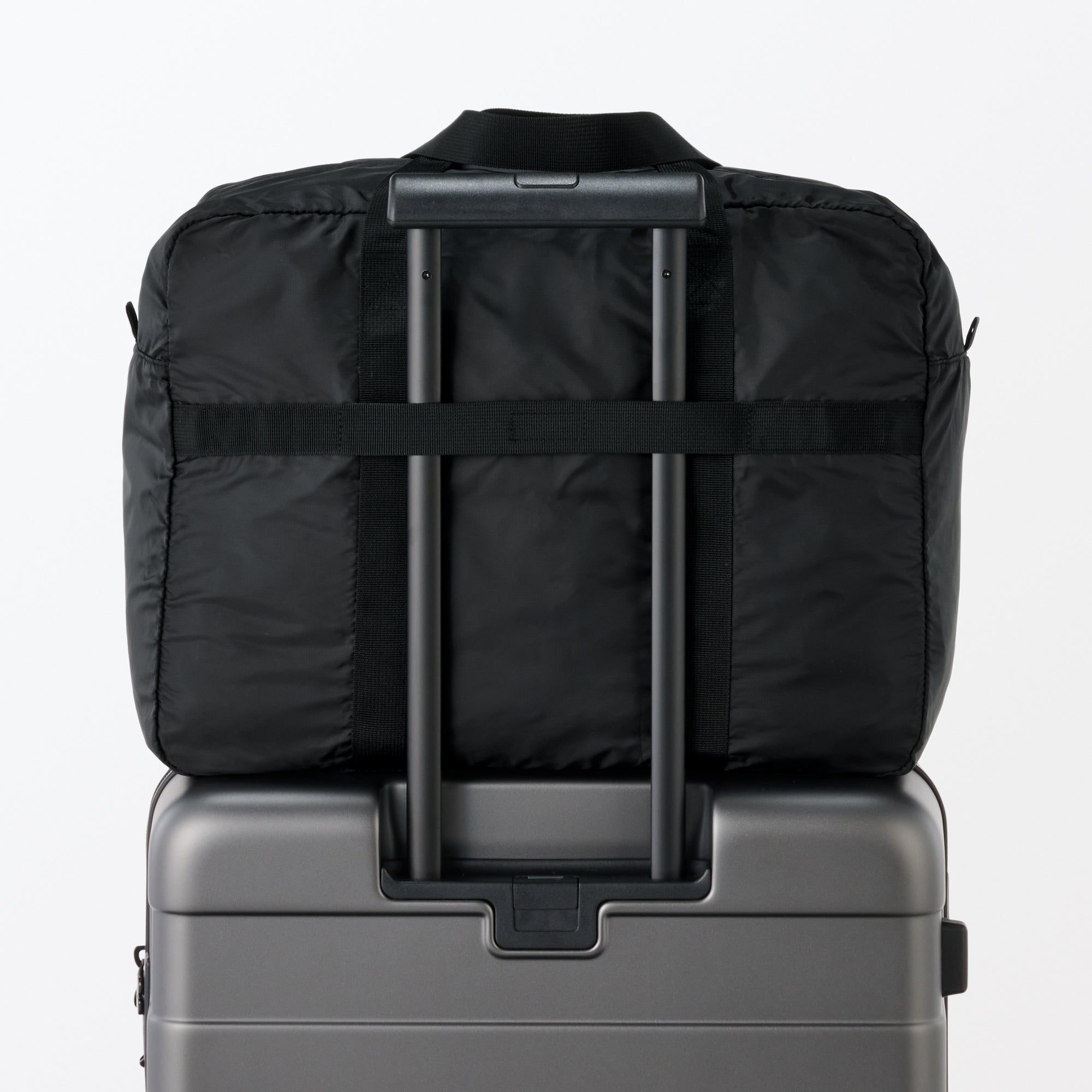 A weekend bag with a compact. foldable design that makes it easy to store when not in use. Made with a water-repellent recycled polyester material so it can be used in all types of weather. The bag also features a luggage strap for your convenience. allowing you to easily secure it to your suitcase handle.