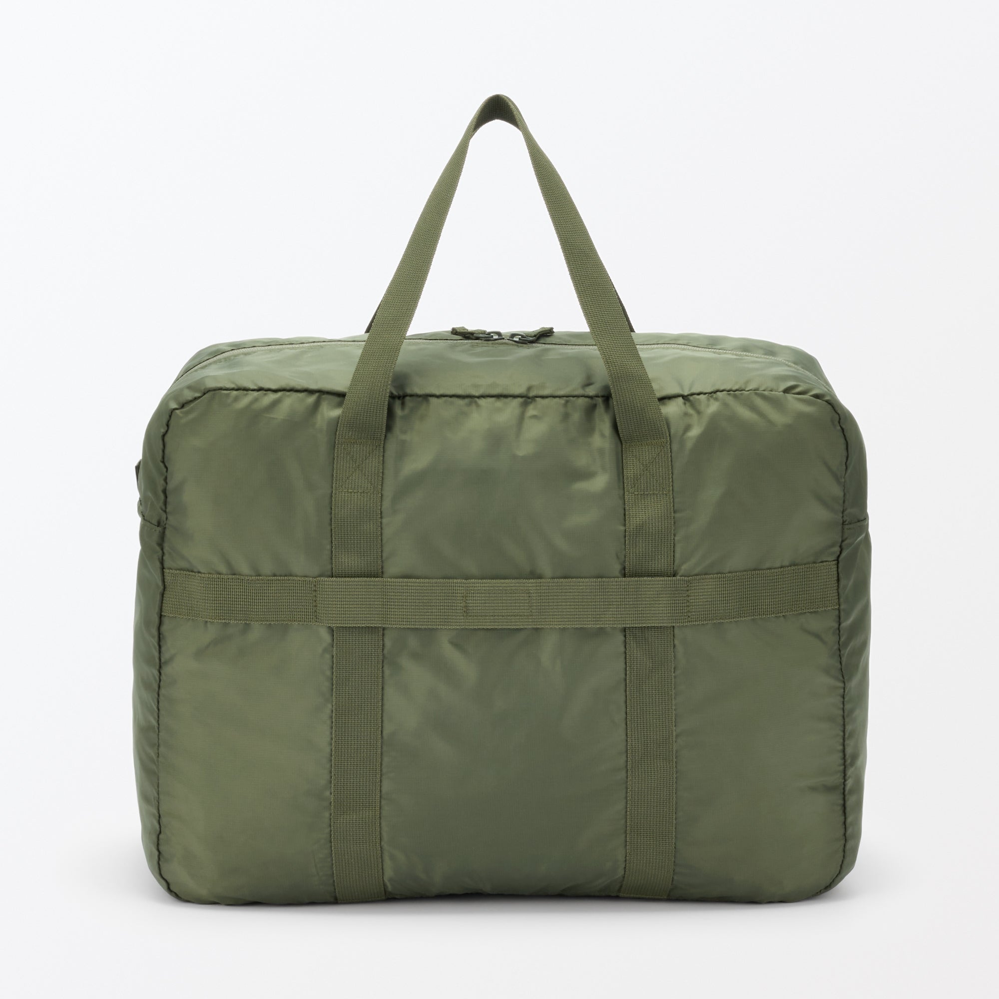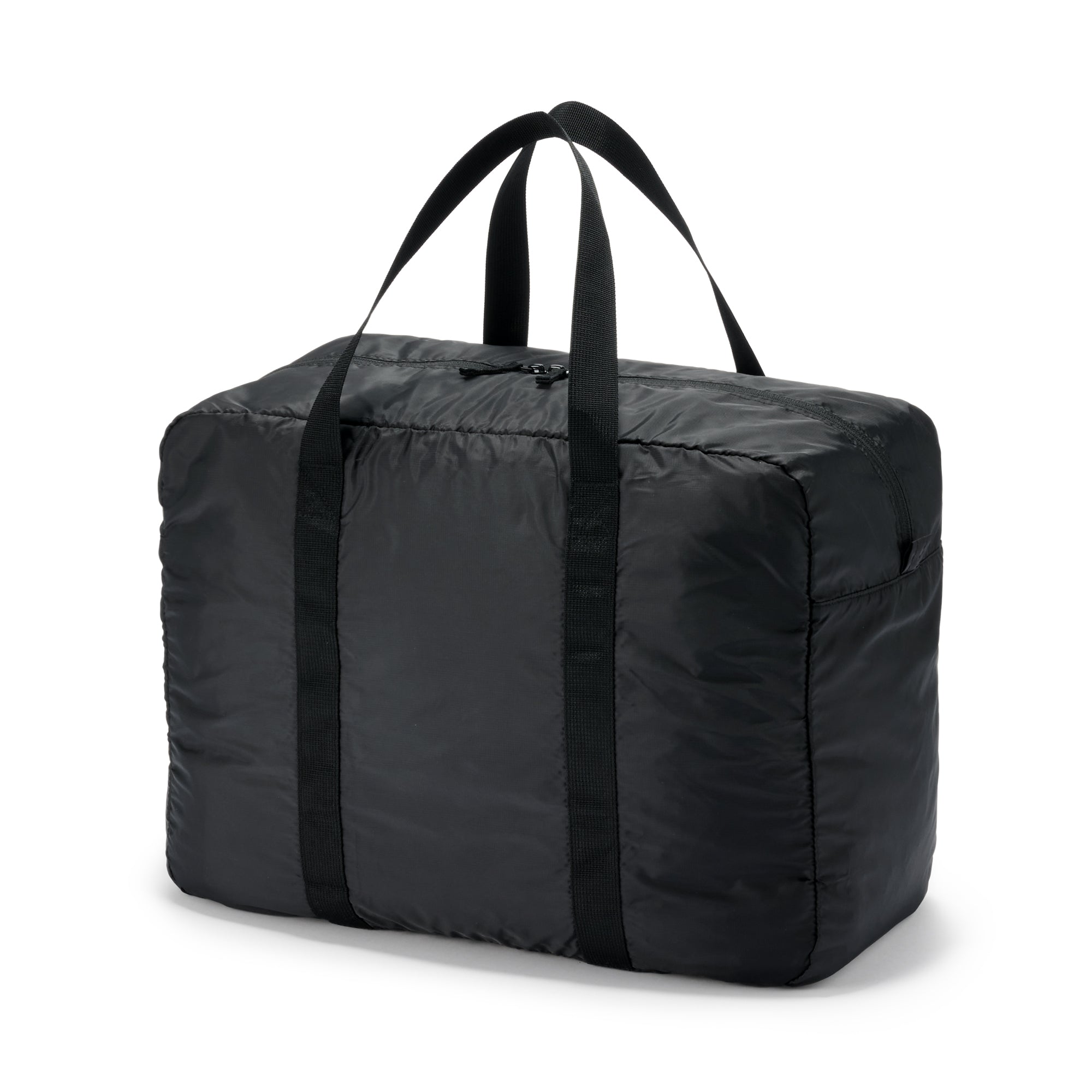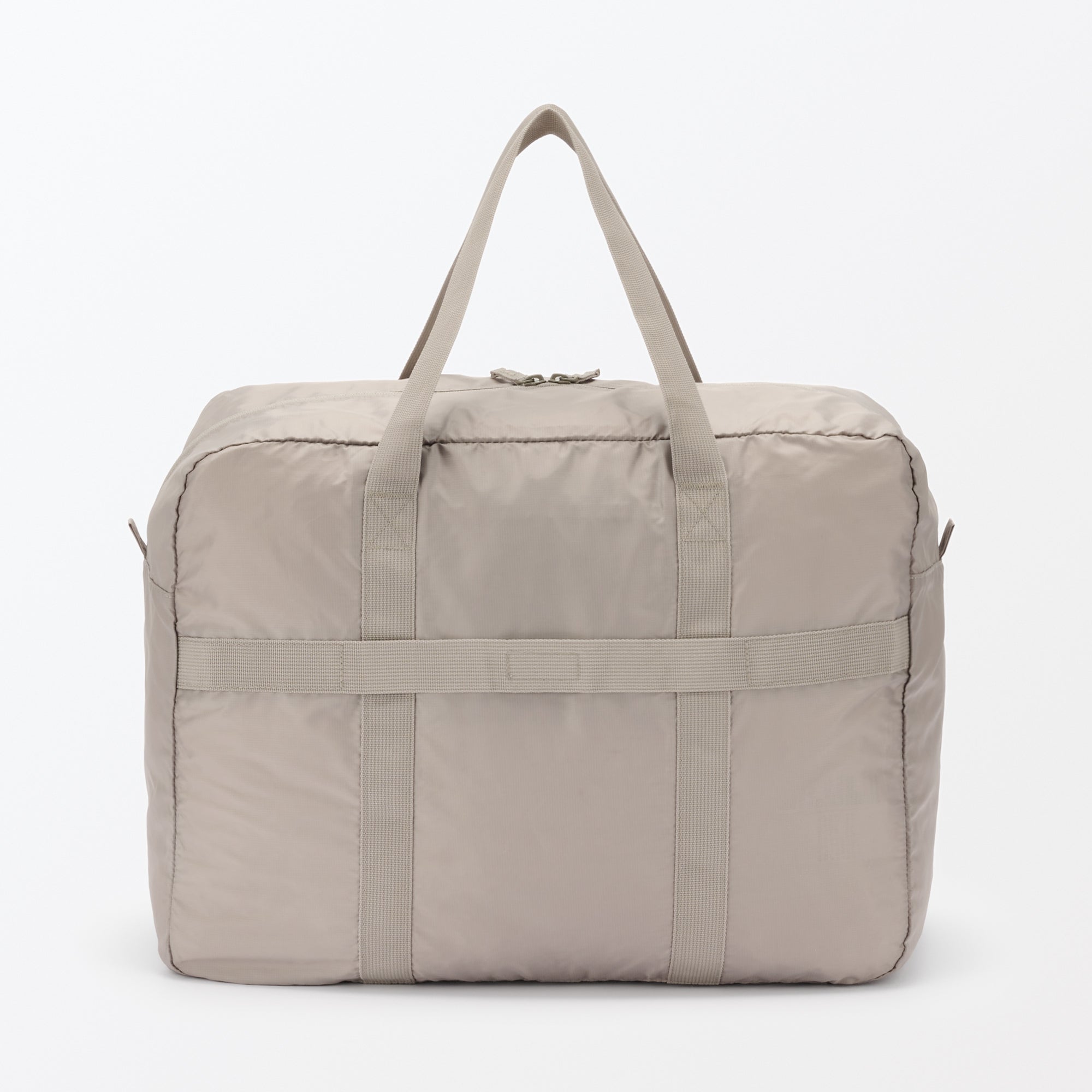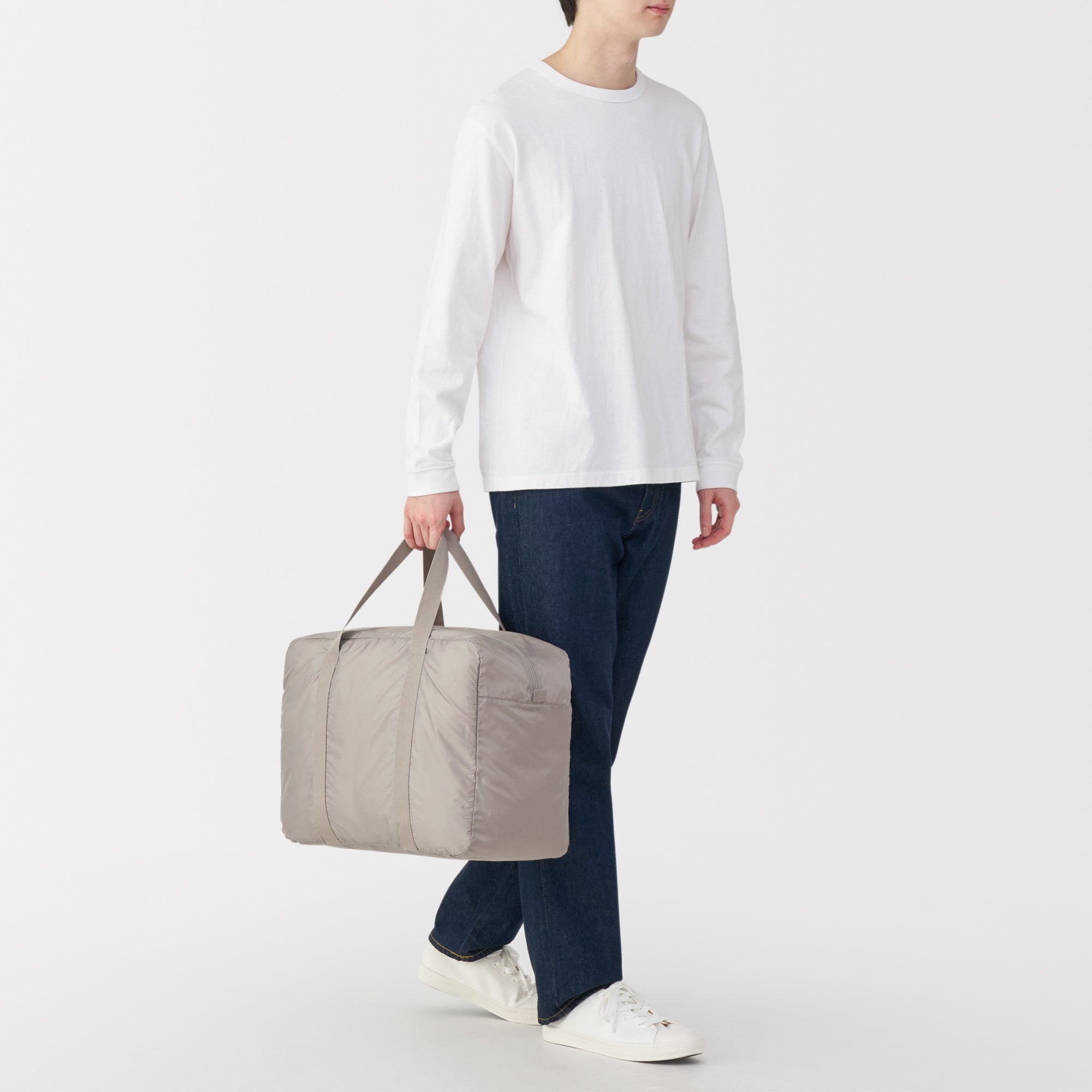 A weekend bag with a compact. foldable design that makes it easy to store when not in use. Made with a water-repellent recycled polyester material so it can be used in all types of weather. The bag also features a luggage strap for your convenience. allowing you to easily secure it to your suitcase handle.