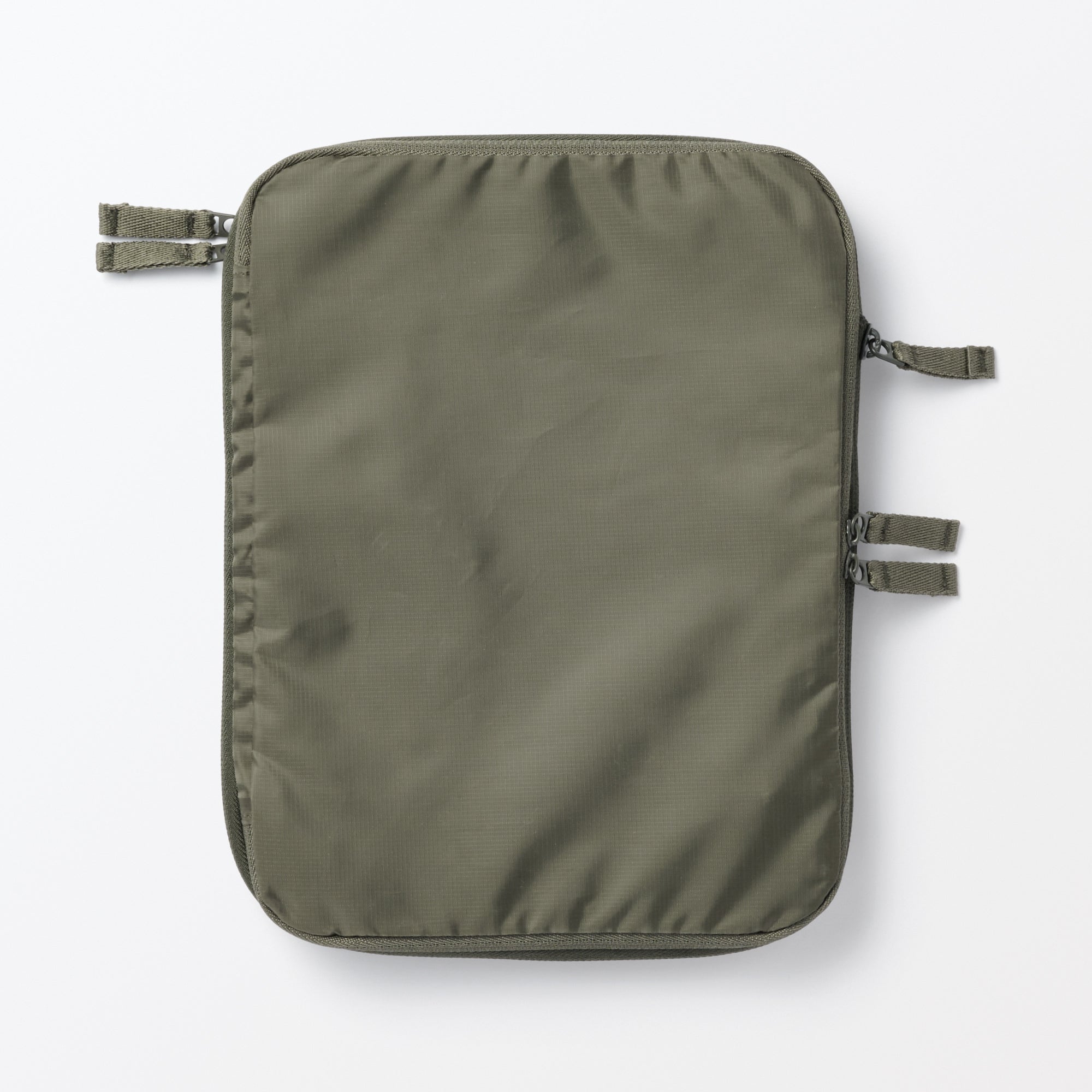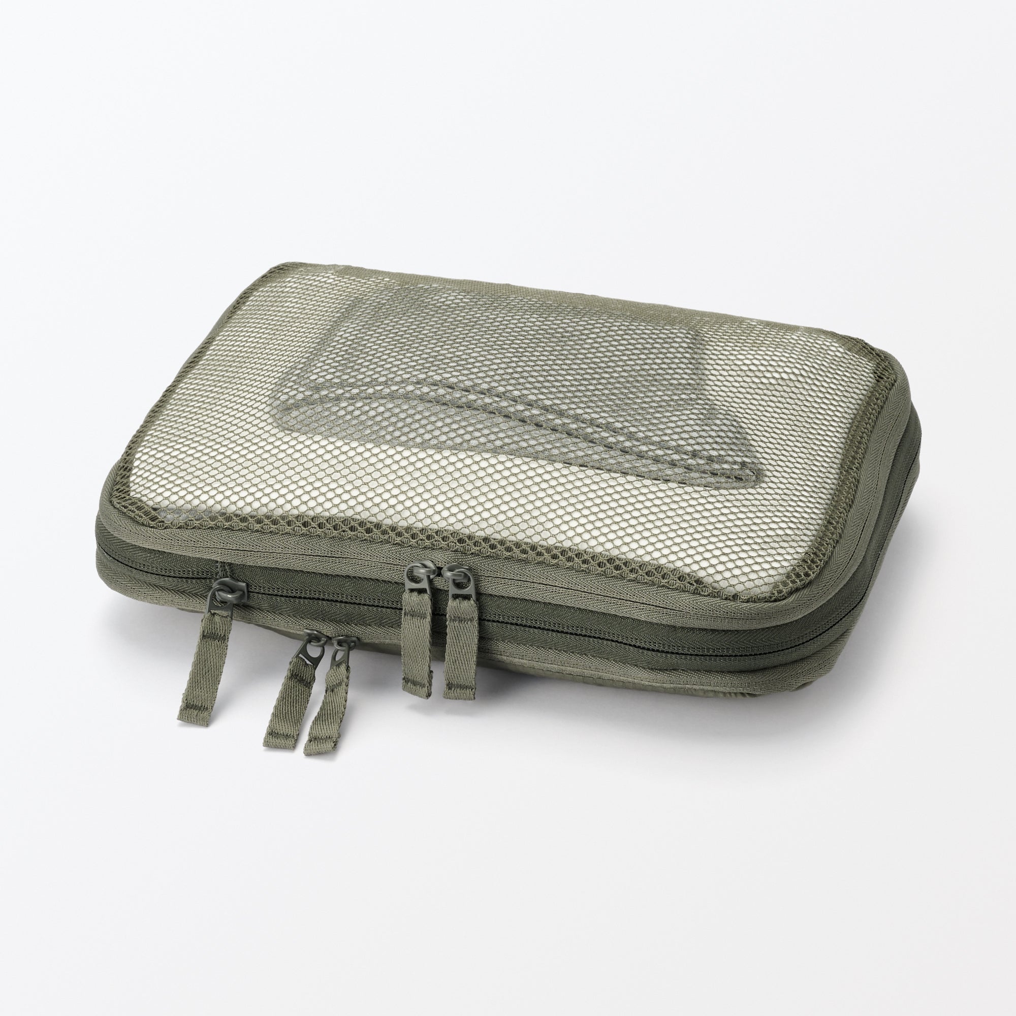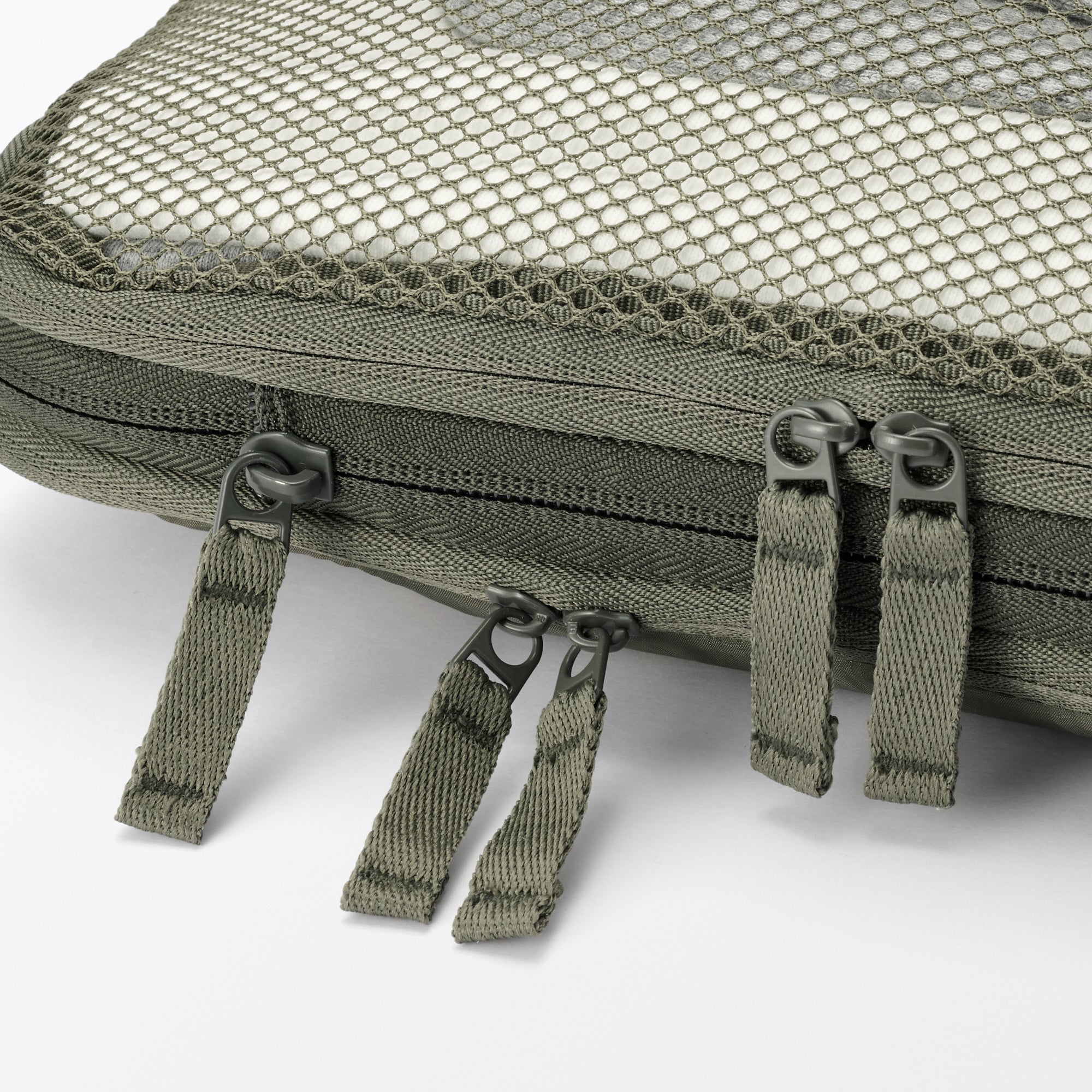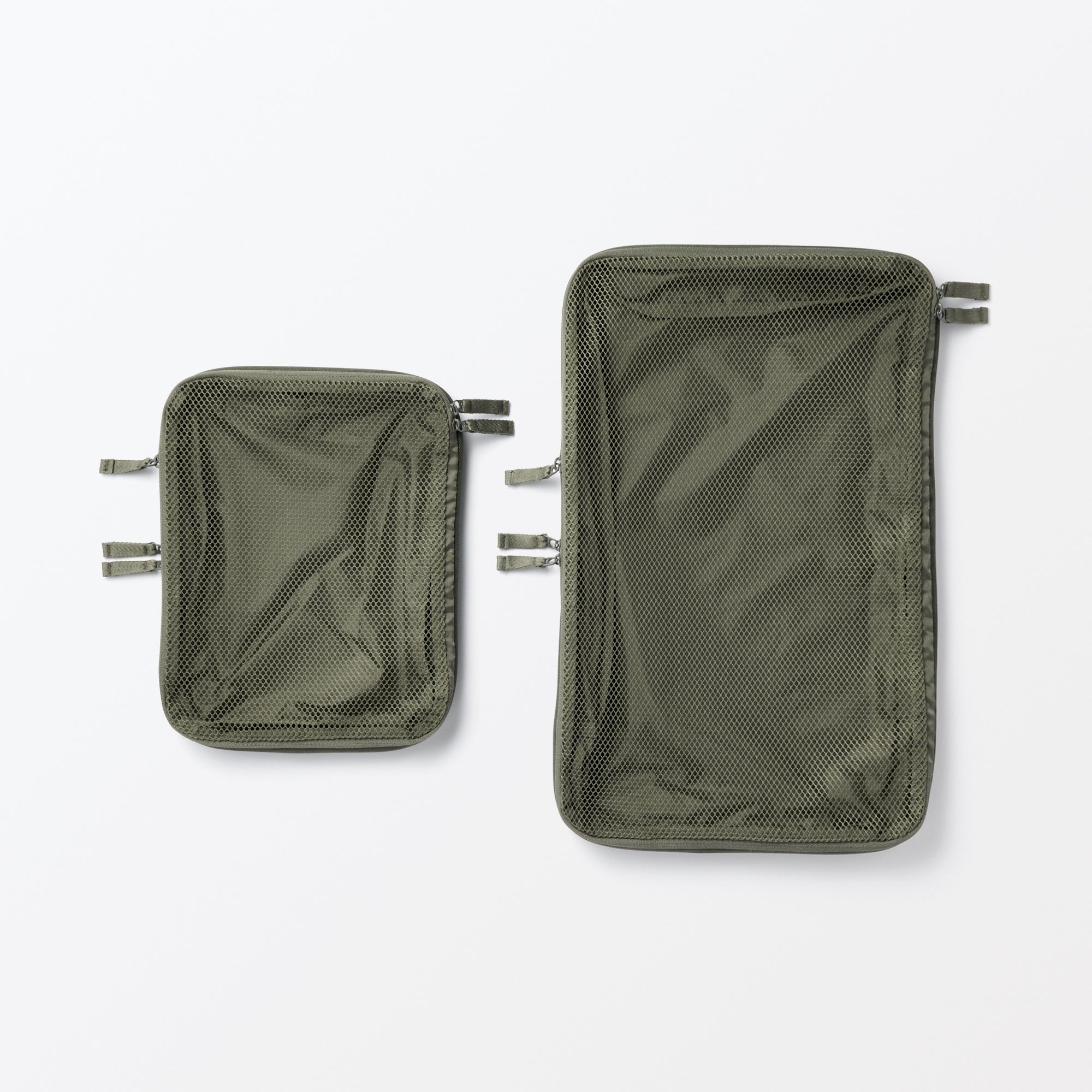 A travel case made from a durable and lightweight mesh fabric. Simply close the zipper in the middle to compress its contents for more efficient packing and reducing overall bulk. The mesh on one side allows you to easily preview the contents. making it great for organizing clothing inside of suitcases for travel.