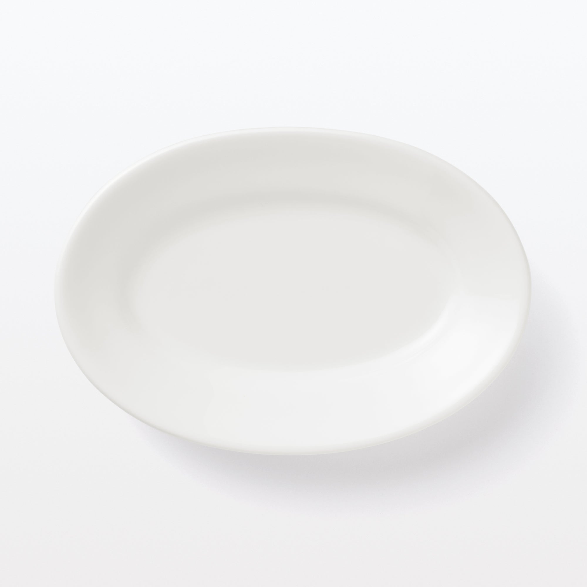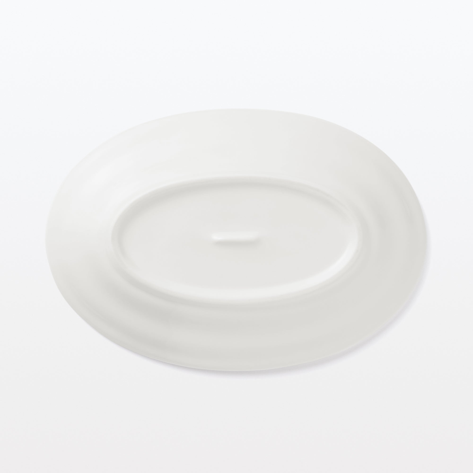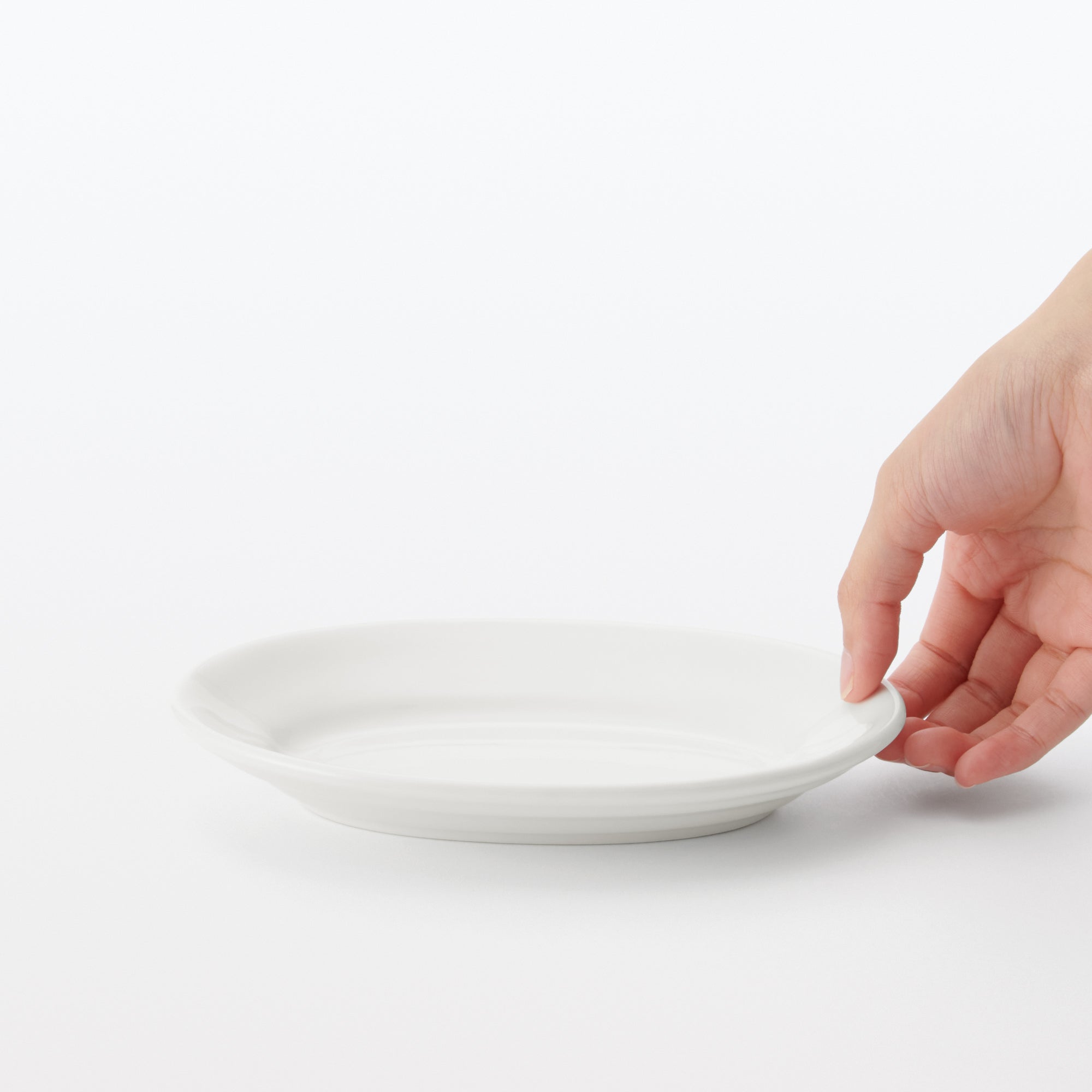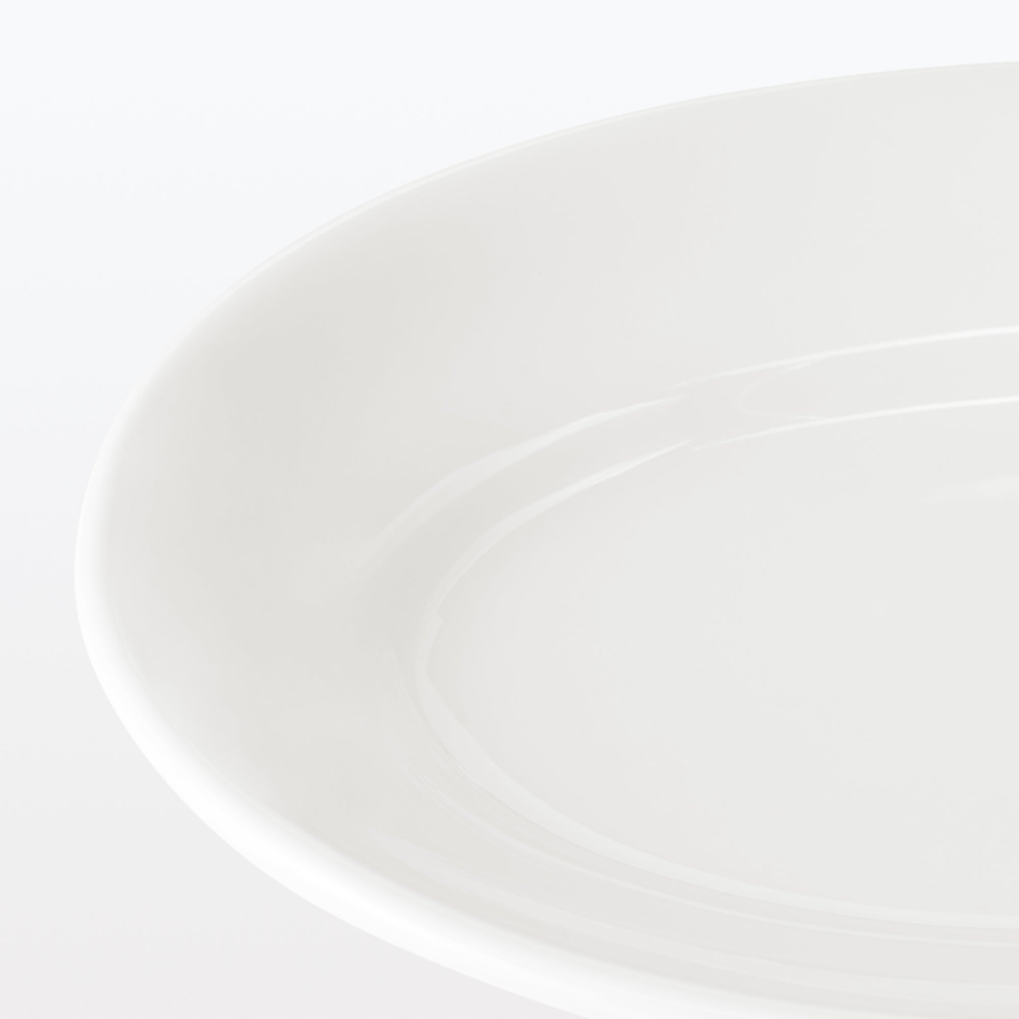 A sturdy and stable porcelain serving plate based on commercial tableware. with an oval shape that takes up less space on the dinner table. The rimmed edge is practical. making it easy to hold and preventing your dishes from spilling.
