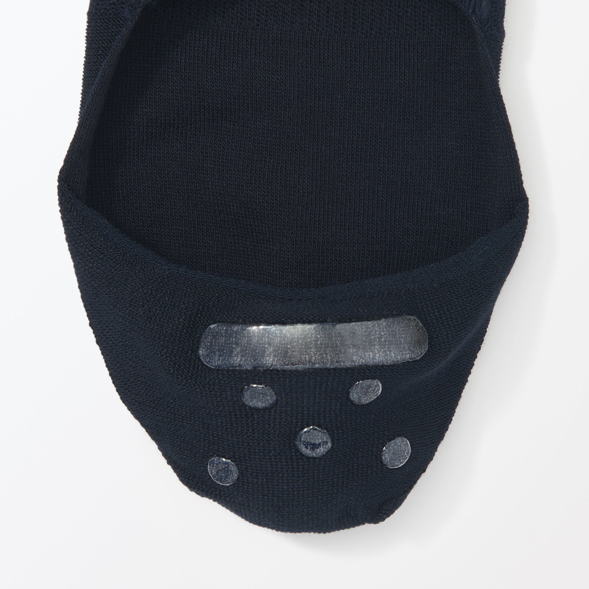 No-show sneaker socks with silicone heel grips that prevent them from sliding down. The seam line on the toes are stitched flat to prevent discomfort. and the reinforced threading at the toes and heel has a sweat deodorizing effect.