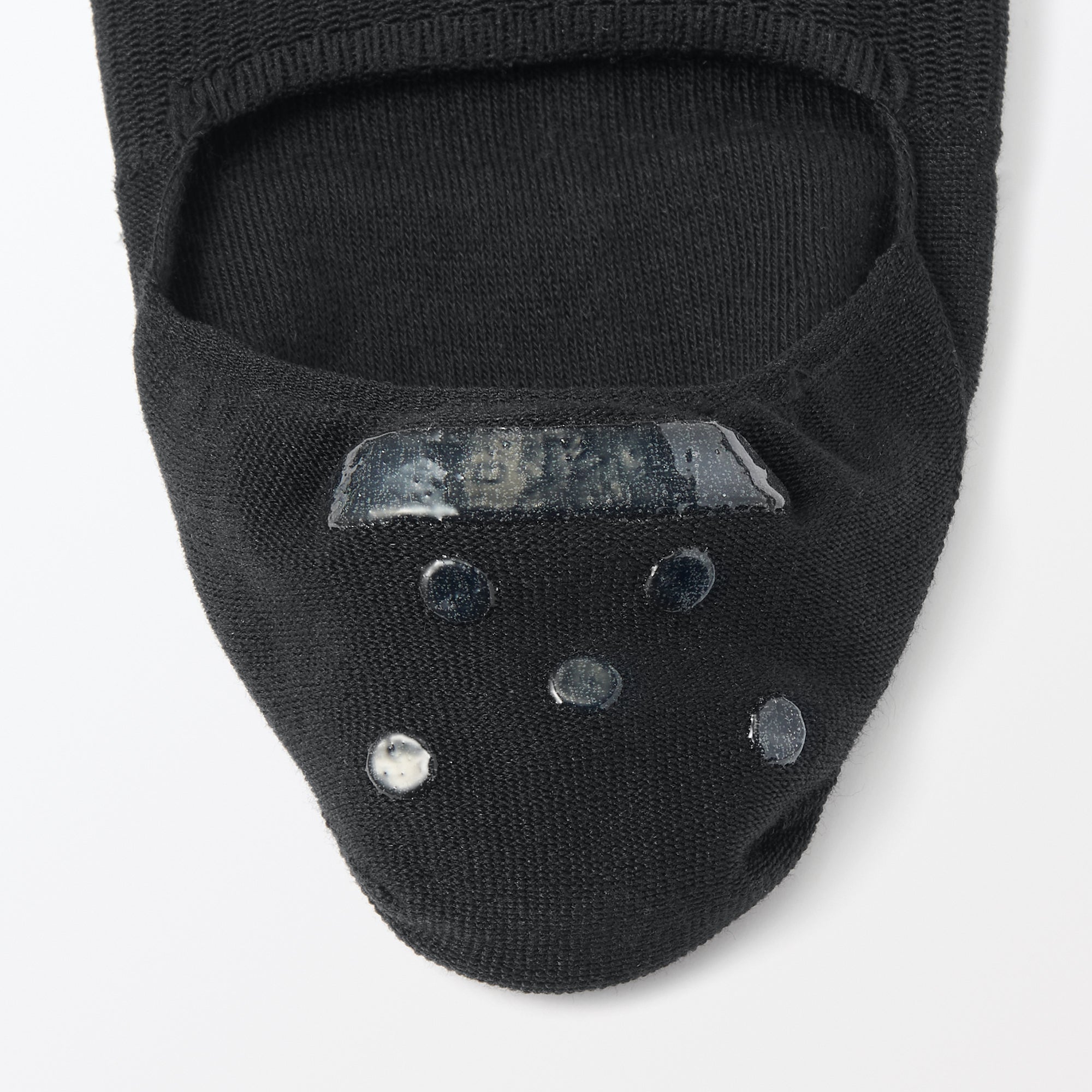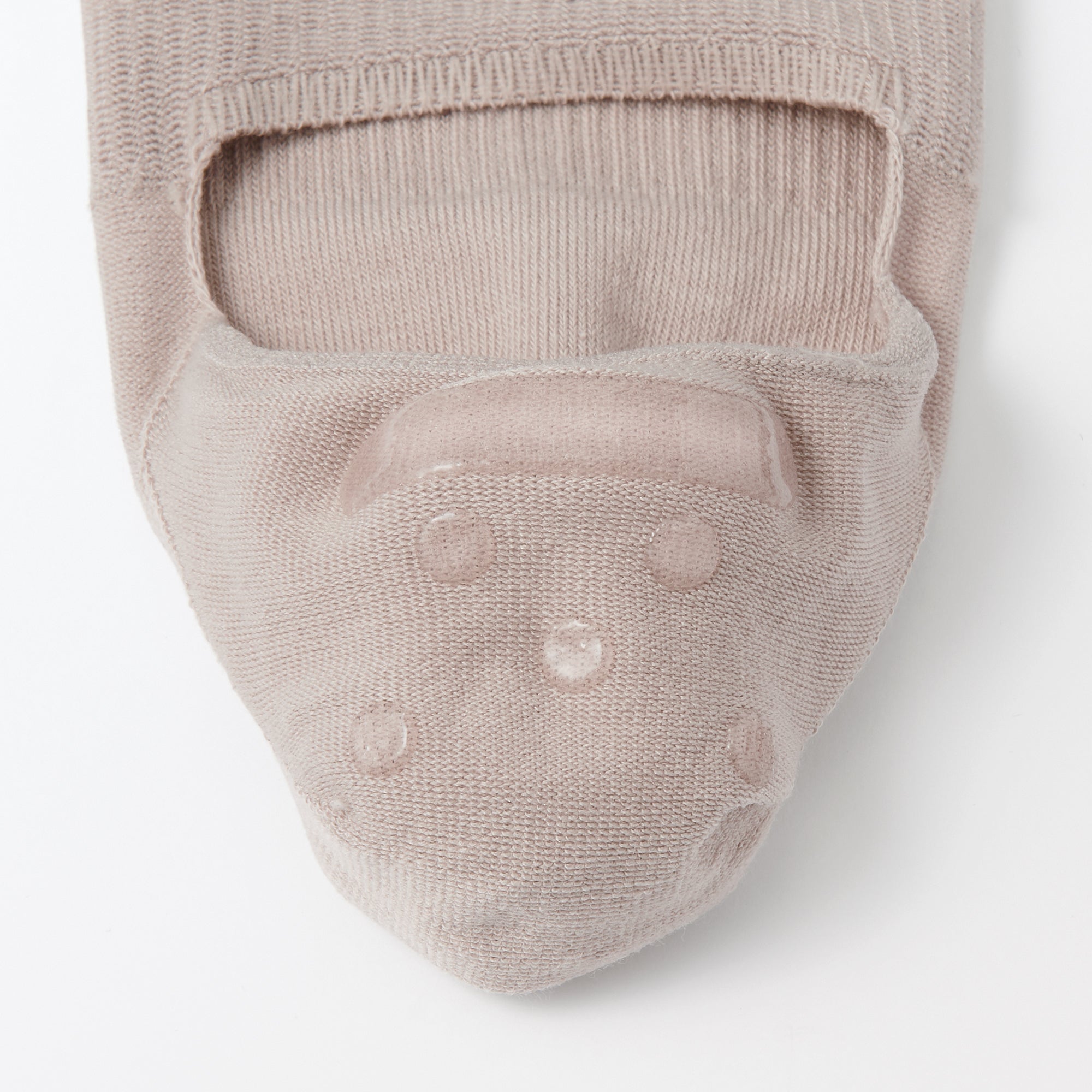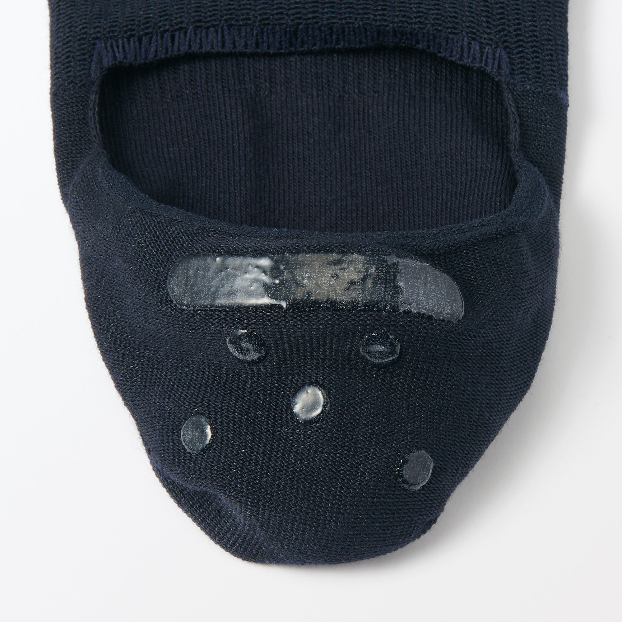 No-show sneaker socks with silicone heel grips that prevent them from sliding down. The seam line on the toes are stitched flat to prevent discomfort. and the reinforced threading at the toes and heel has a sweat deodorizing effect.