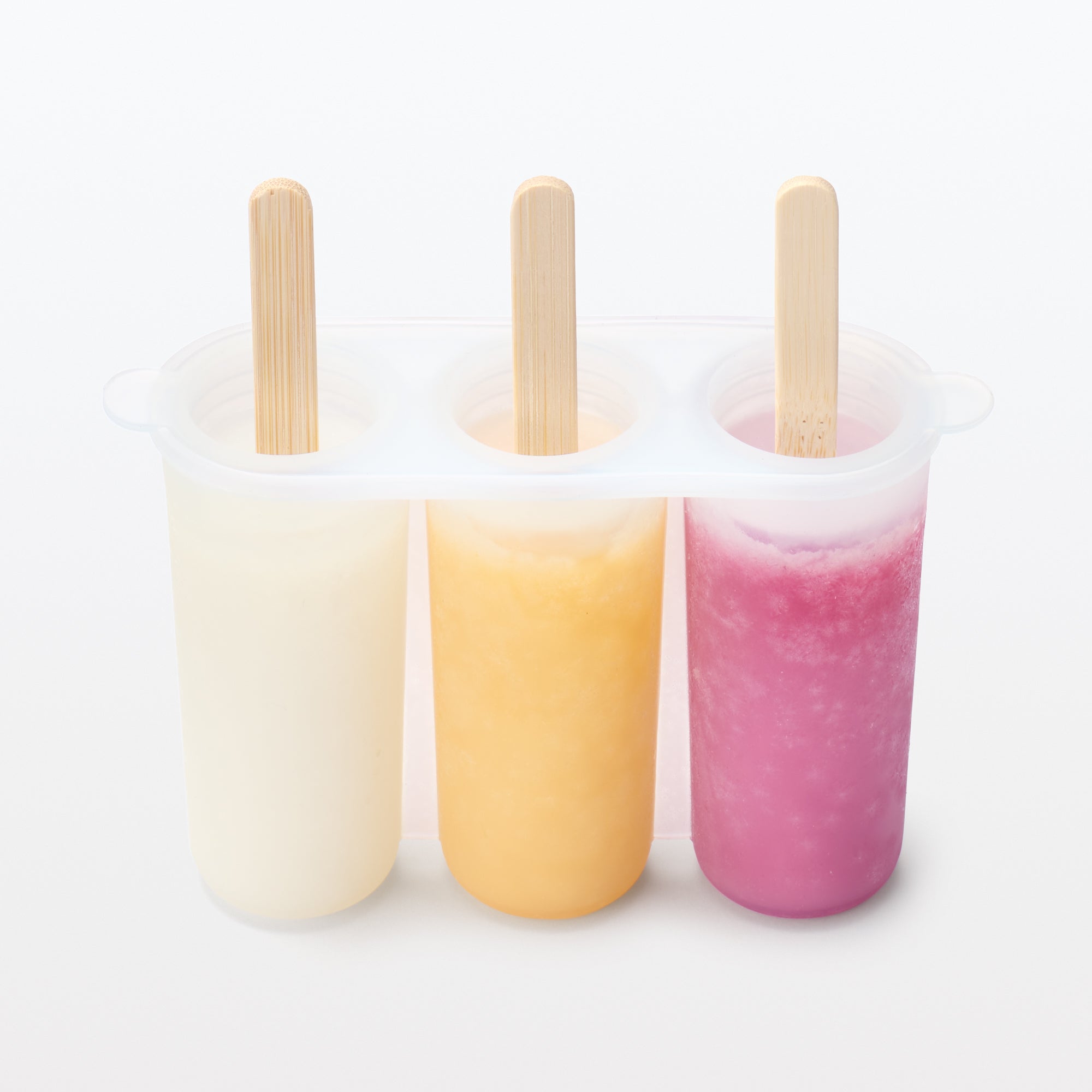 Ice tray made of silicone. making it easy to take out the ice. Creates long. thin ice cubes that can fit into water bottles with a small opening. The lid has a slot for popsicle sticks. making it perfect for creating homemade ice pops as well. Makes 3 ice cubes at a time.