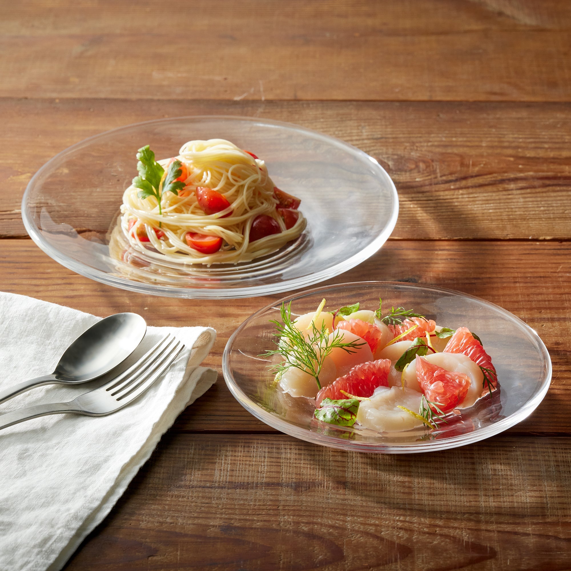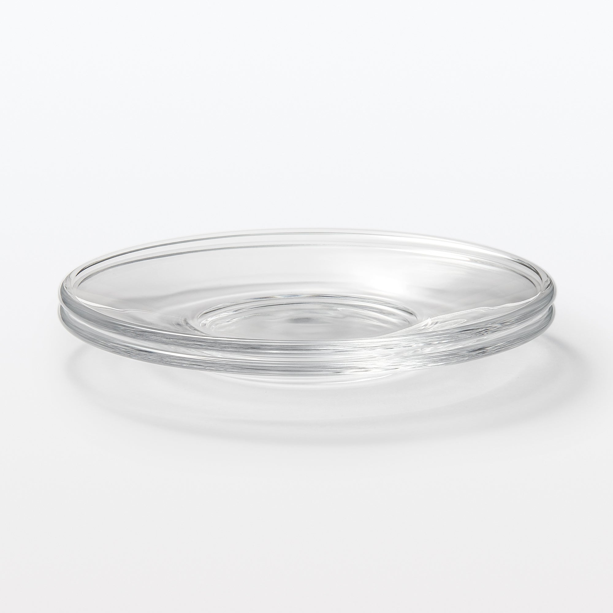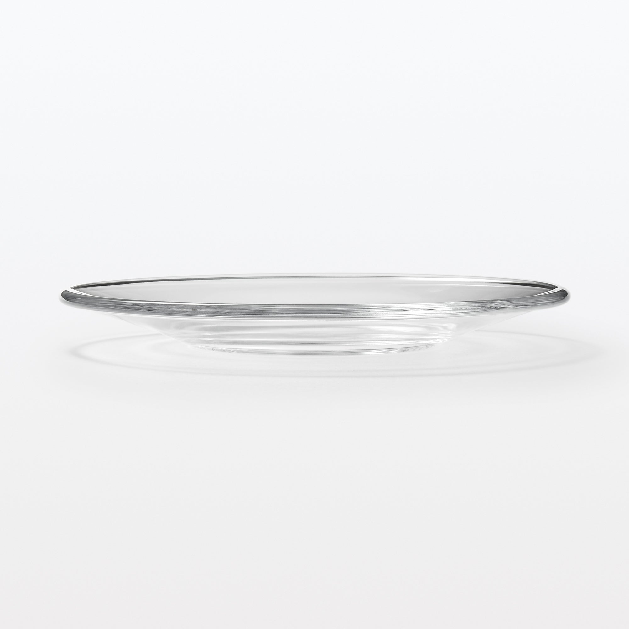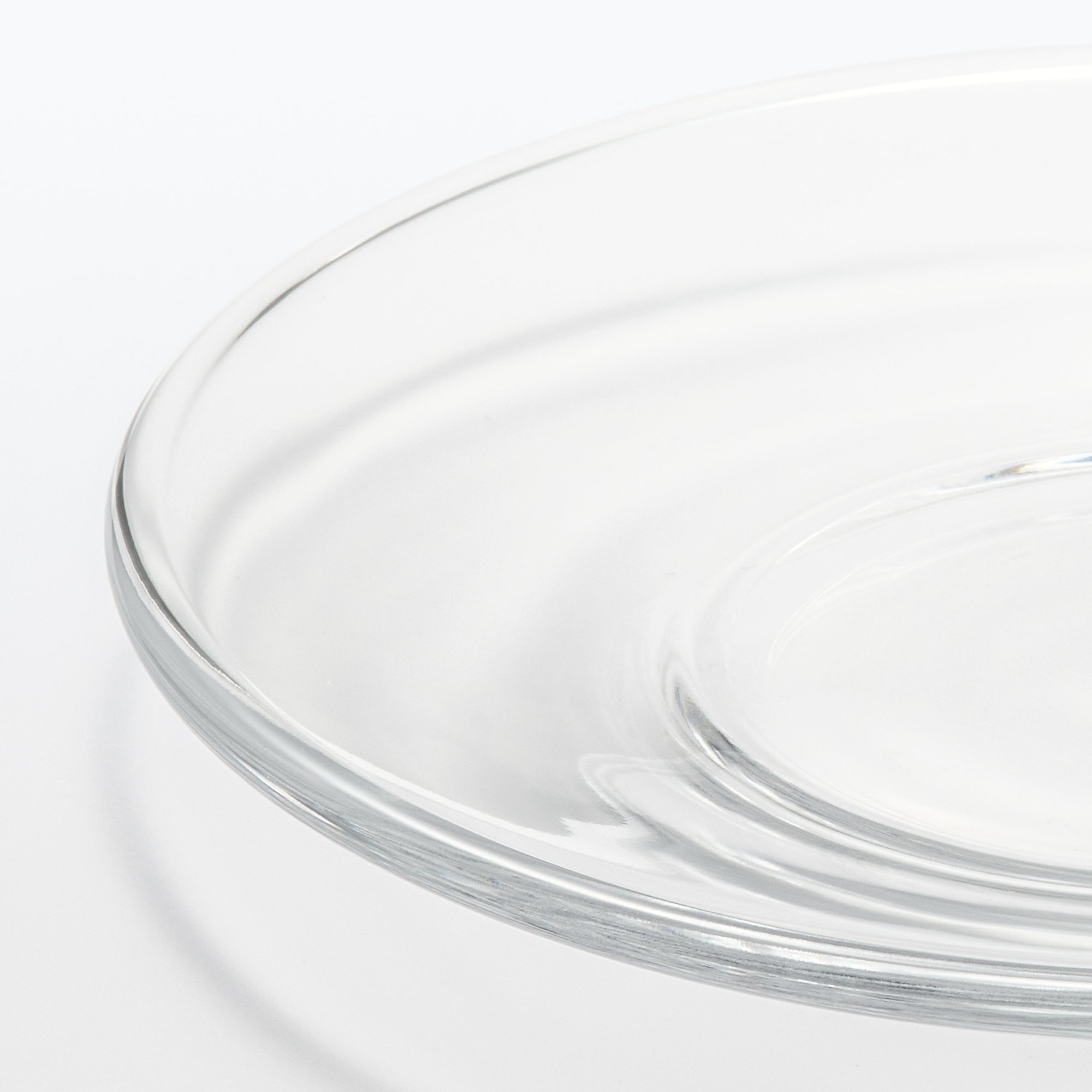 A transparent plate made from soda glass. It’s wavy surface texture is reminiscent of hand blown glass.
